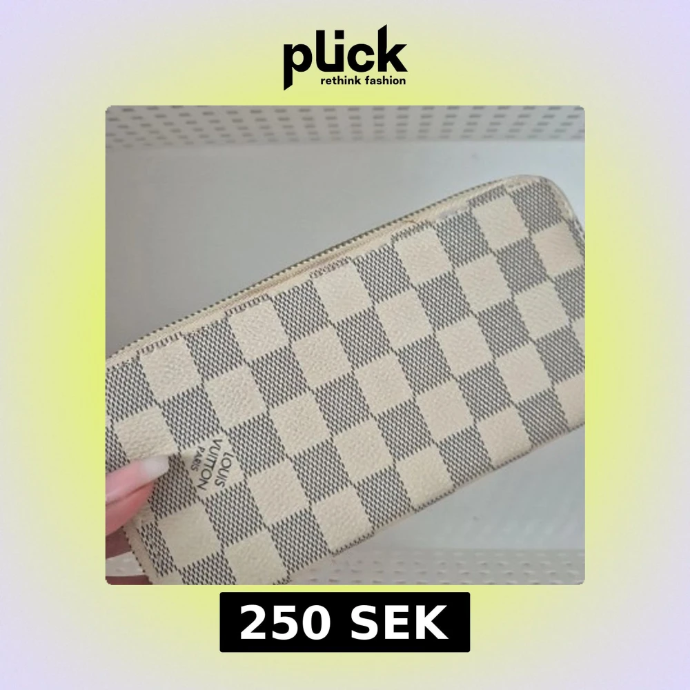 Säljer en stilren plånbok i ett klassiskt rutigt mönster. Plånboken är i beige och grå toner med dragkedja upptill. Perfekt för att hålla ordning på kort och kontanter.