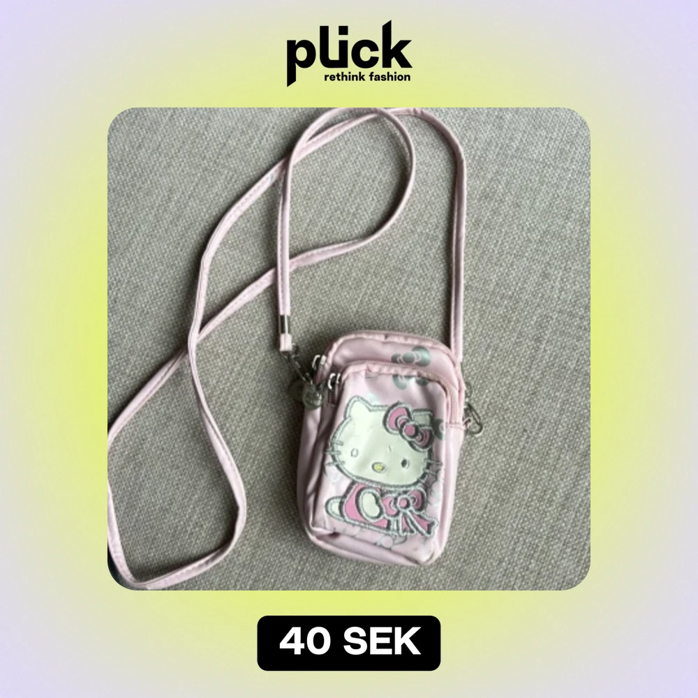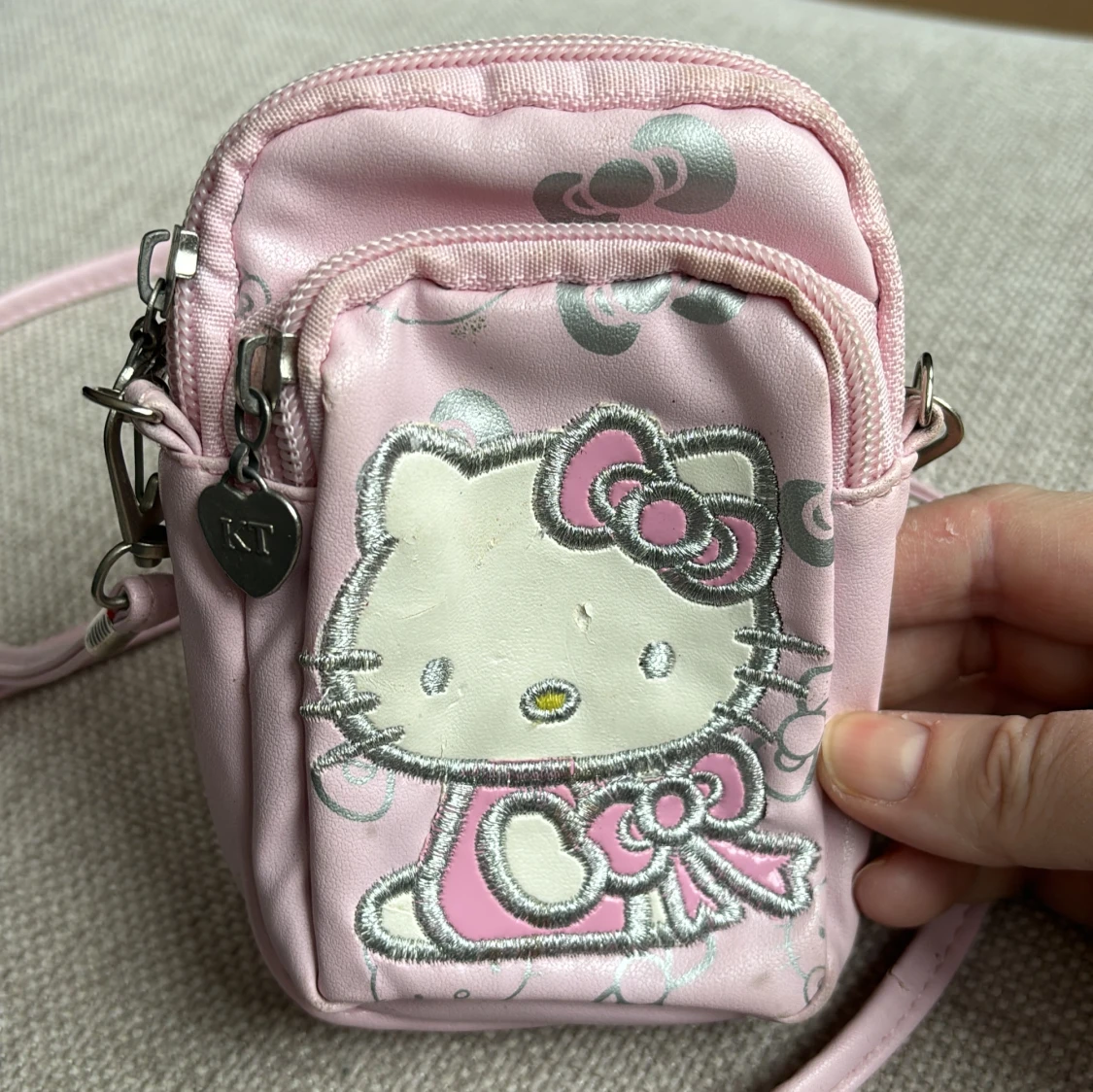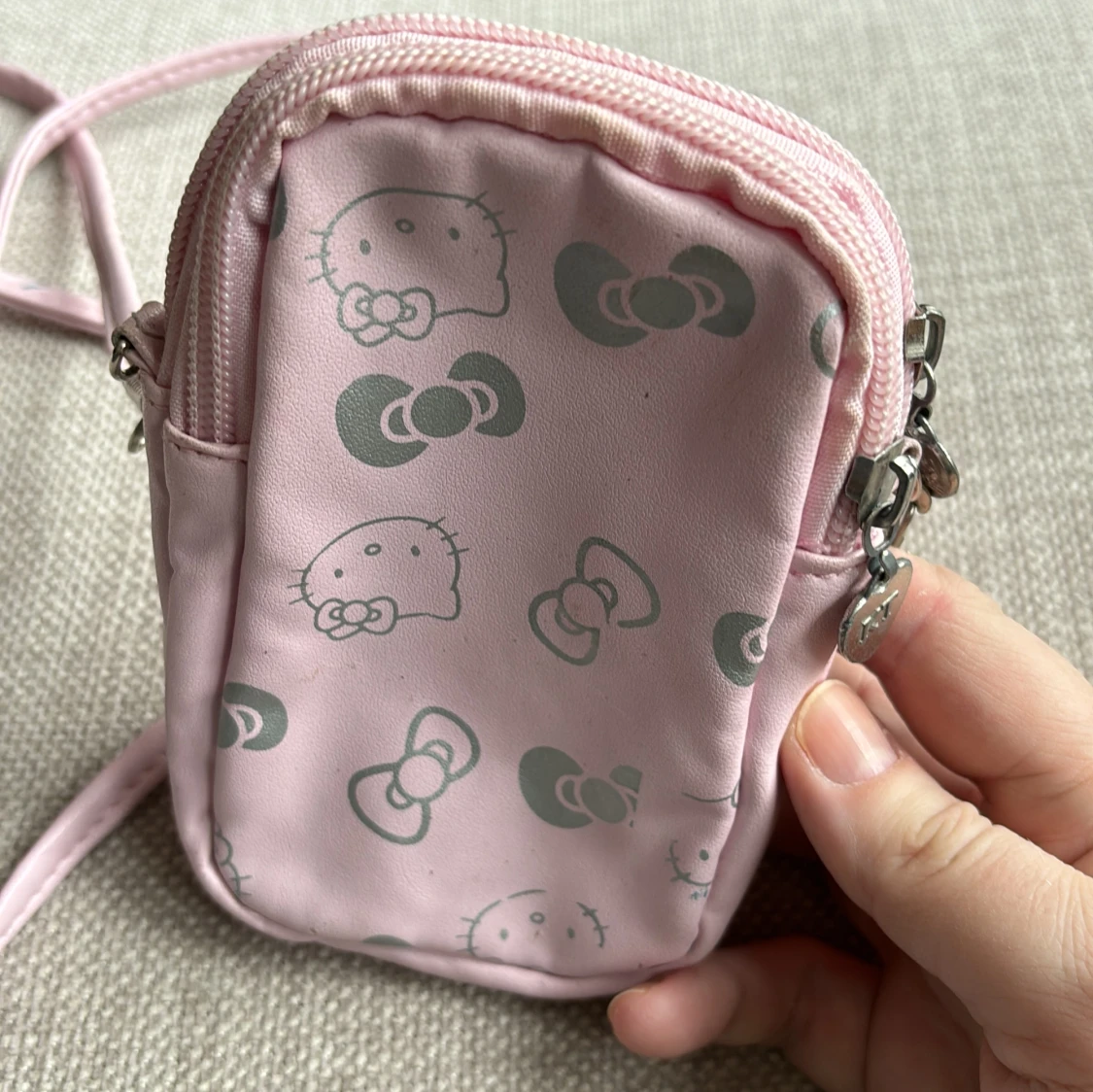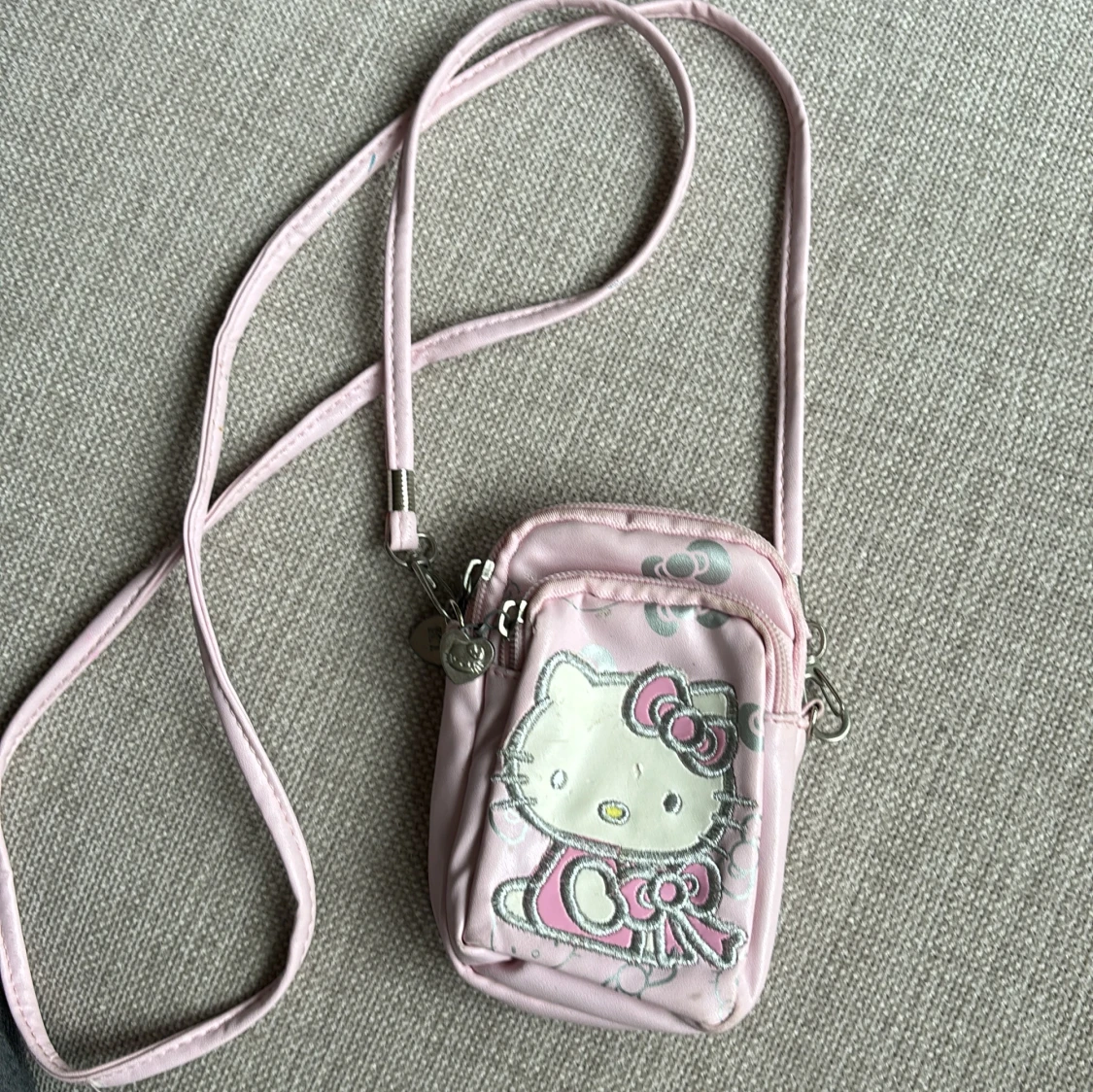 Söt liten väska för mobilen och små saker man vill ha med sig, t ex läppglans, kort och liknande. Lite sliten på framsidan, se bild, annars i fint skick. Storlek ca 14x10 cm. Tre fack som stängs med dragkedja