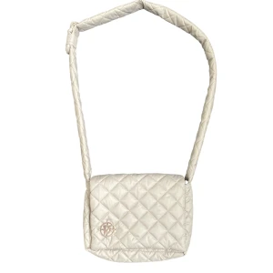 Skön vadderad (puffer) tygväska i en off-white silvrig färg med detaljer i silver. Väldigt snygg med en pufferjacka nu till hösten. Slitage främst i trådar som släppt. Märket sitter löst på höger fäste och en av de magnetiska knapparna sitter också löst.