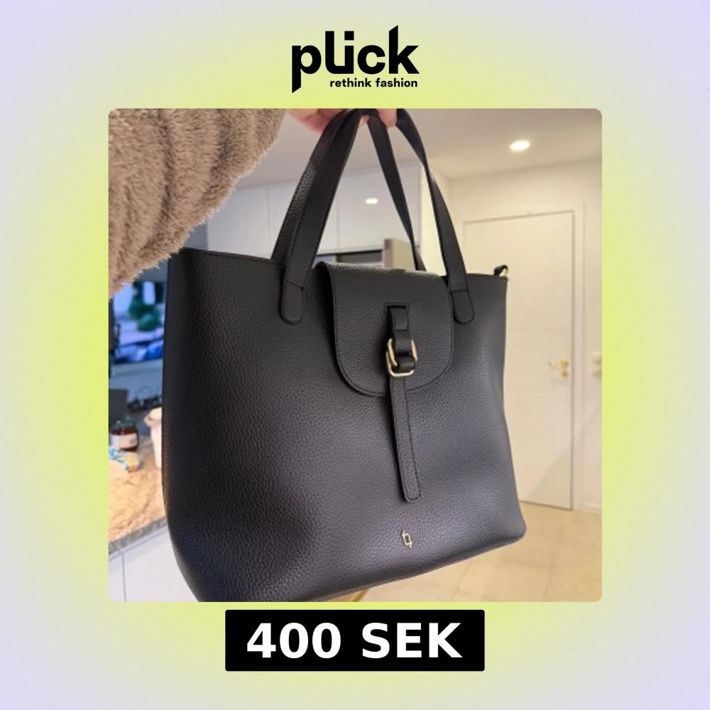 Stilren svart handväska med guldfärgade detaljer. Väskan har två handtag, ett lock med snyggt spänne och en praktisk innerficka med dragkedja. Perfekt storlek till vardags eller skolan.