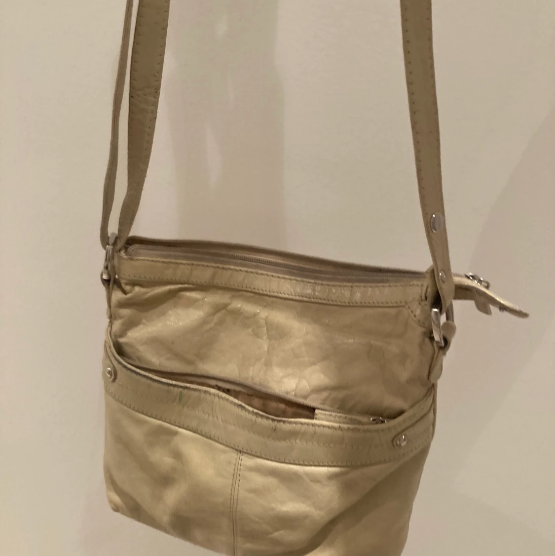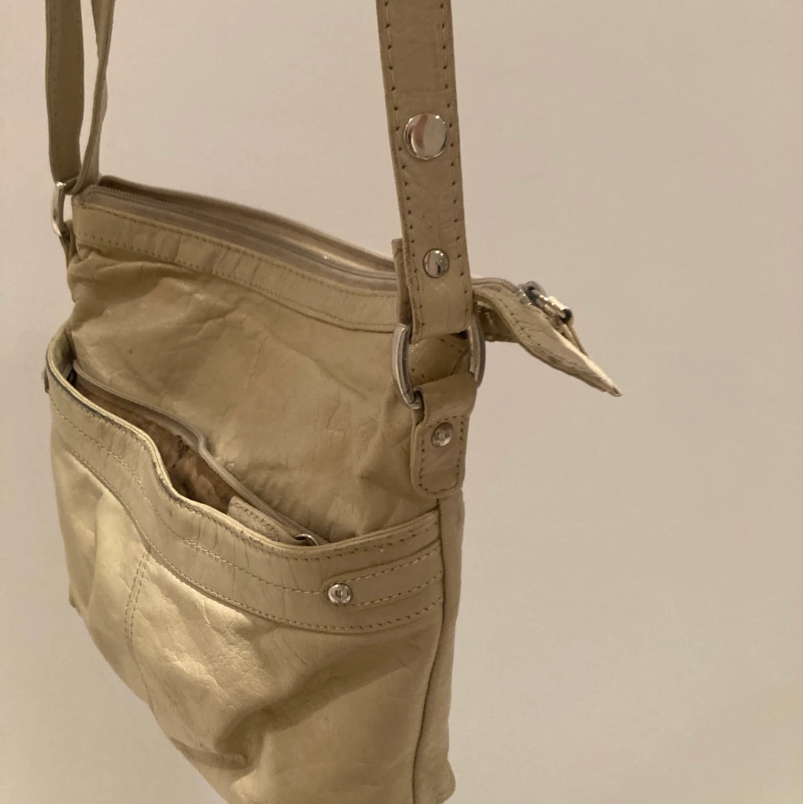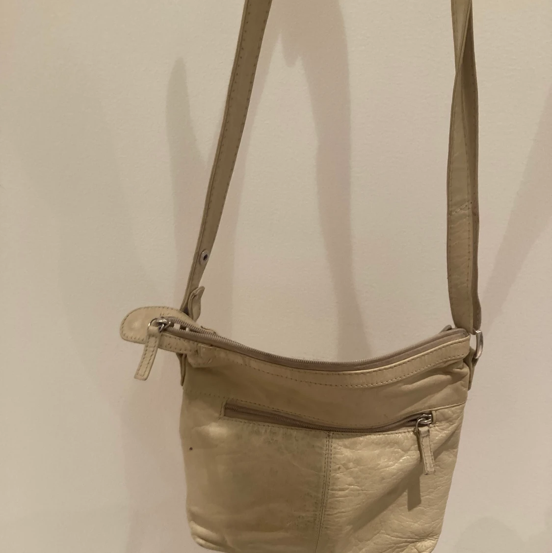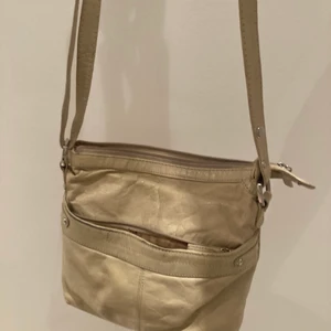 Säljer denna beige/vita väska i skinnliknande material. Flera fack och med justerbart band!