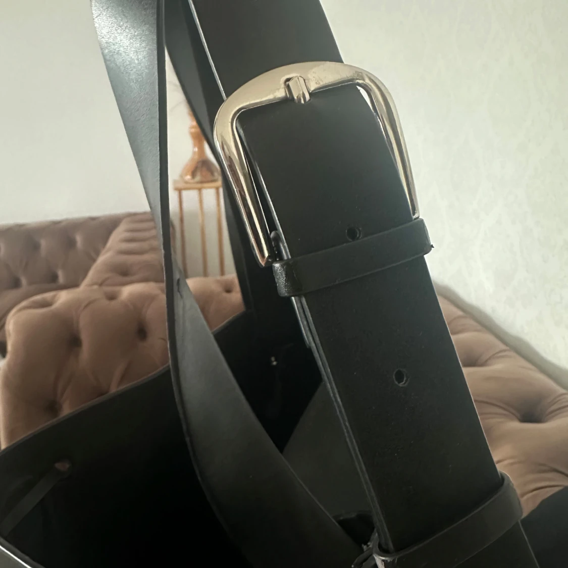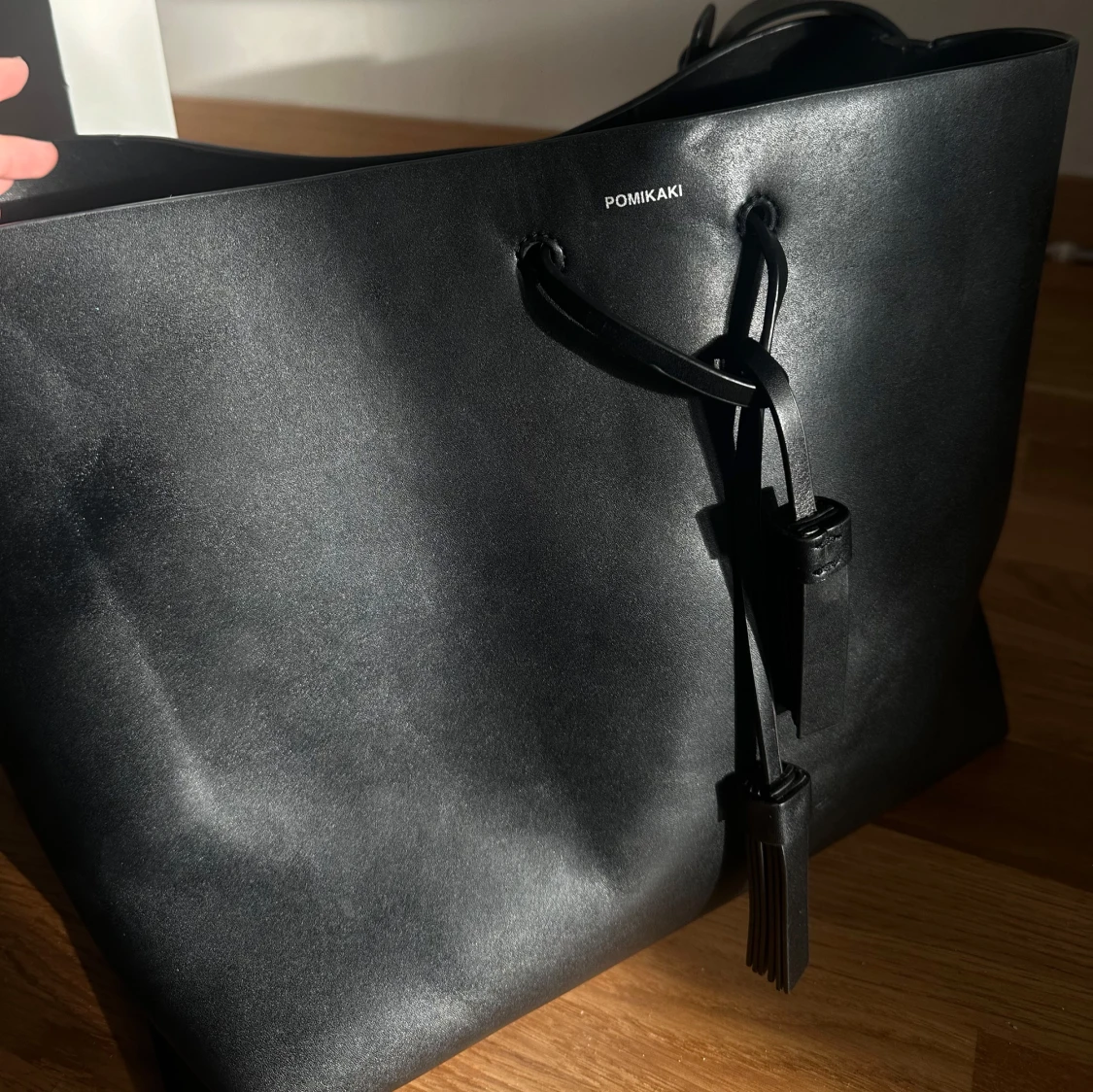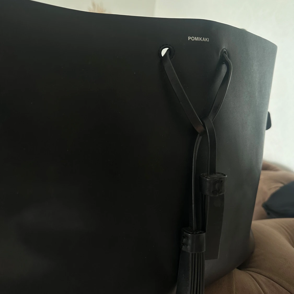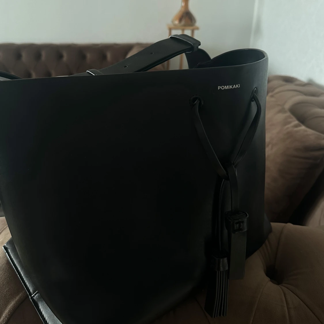 Säljer en snygg och stilren svart läder axelväska från Pomikaki. Köpt i Italien för ca 1 år sedan för ca 750kr. Säljer den då den inte kommer till användning. Den rymmer väldigt mycket och är perfekt till skolan/jobbet.
