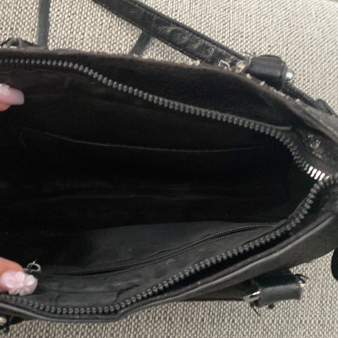 Säljer en svart axelväska i skinn med coola silverdetaljer och dragkedja. Väskan har både handtag och justerbar axelrem, samt flera fack och snygga metalldetaljer framtill. Perfekt storlek för mobilen blånbok och mycket till💞 priset är diskuterarbart💕