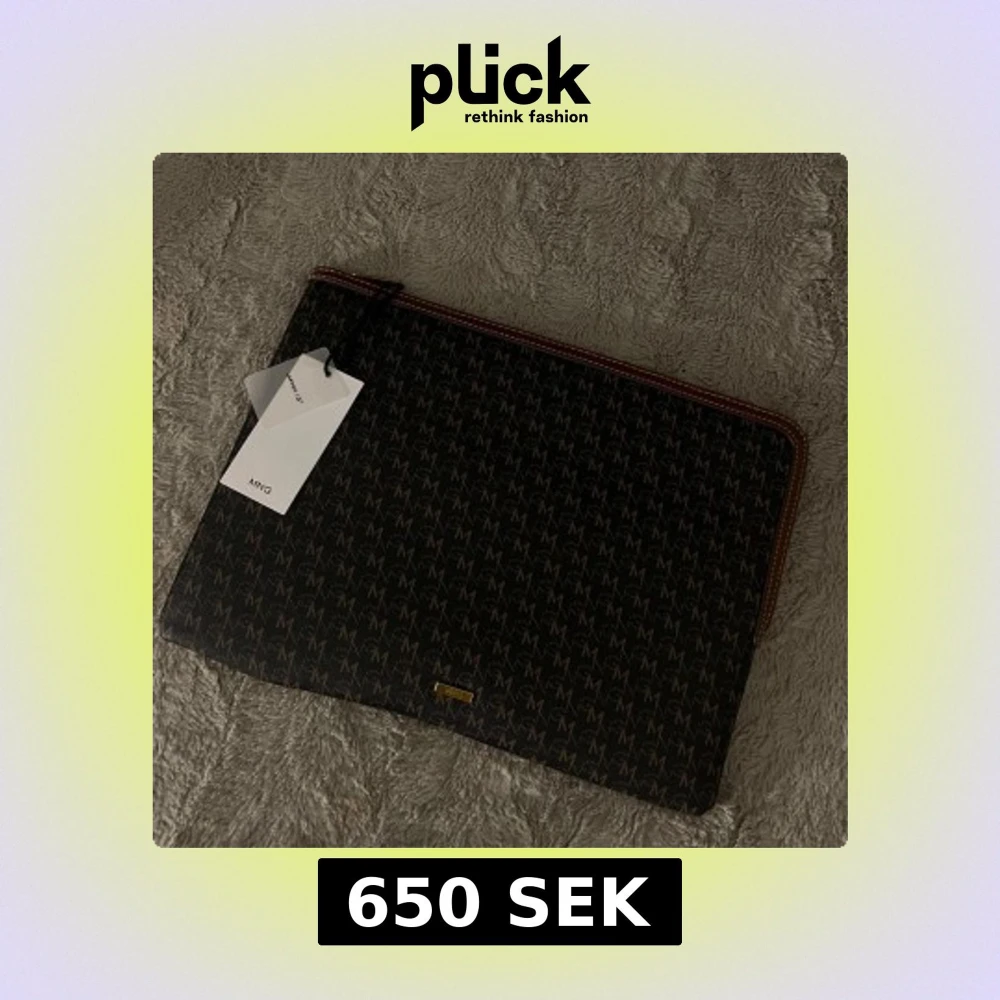 Stilren svart datorväska från MNG med bruna detaljer och guldfärgad logga. Väskan har ett all-over monogrammönster med M-bokstäver och dragkedja längs kanten. Perfekt för att bära din laptop med extra stil.