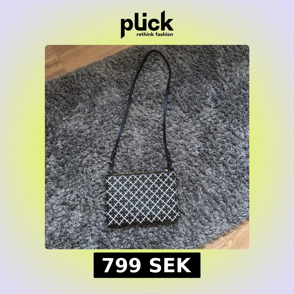 Snygg svart axelväska från By Marlene Birger med vitt rutmönster och guldfärgad dragkedja. Väskan har justerbart axelband och är perfekt för att bära det viktigaste. Klassisk och stilren design som passar till många tillfällen. Köpt på Nk för 900 aldrig använd prislapp borttagen för jag trodde jag skulle använda den kvitto och påse finns. Bandet kan tas bort.
