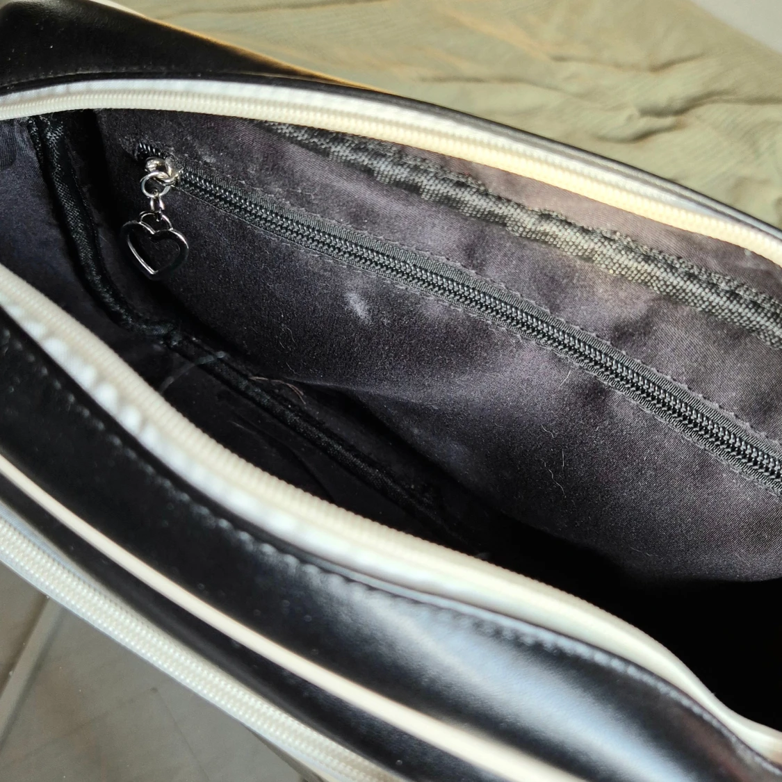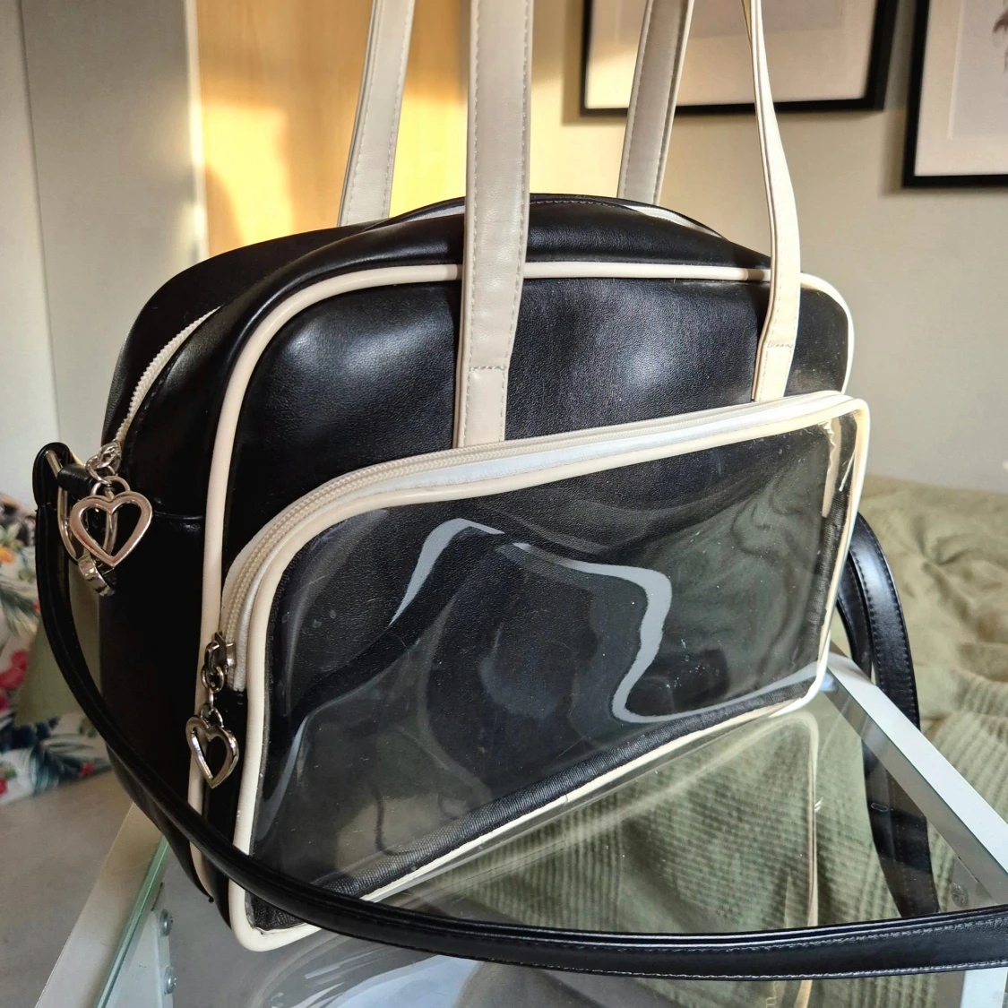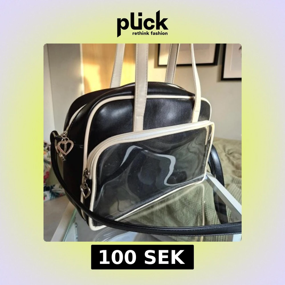 Snygg axelväska i svart och vitt med en stor transparent ficka framtill. Har även en innerficka. Väskan har både handtag och justerbar axelrem, samt hjärtformade dragkedjor💛 Köpt på Plick för några år sen, men får aldrig användning för den💔