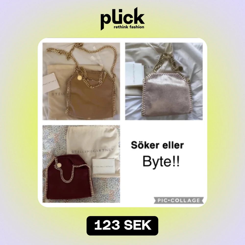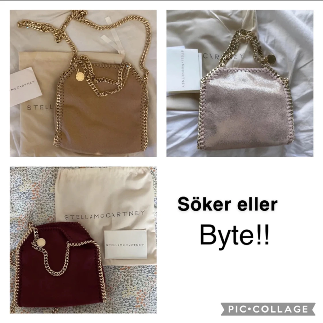 Hejj jag söker en Stella McCartney väska i tiny helst med guldkedjor! Kan även tänka mig att byta mot min svarta mini (bild 2 & 3) hör av er om ni har någon!!💕💖