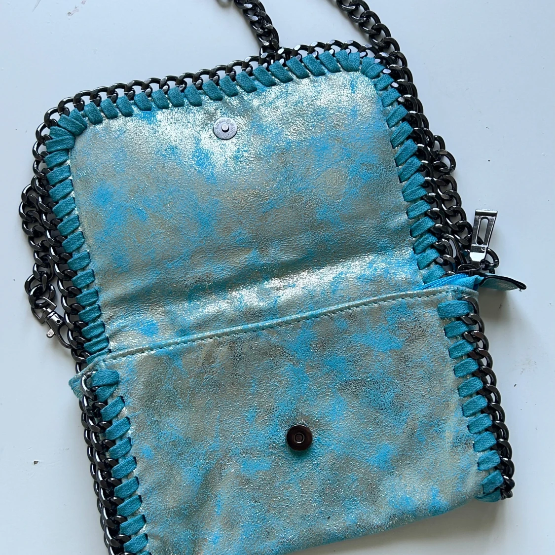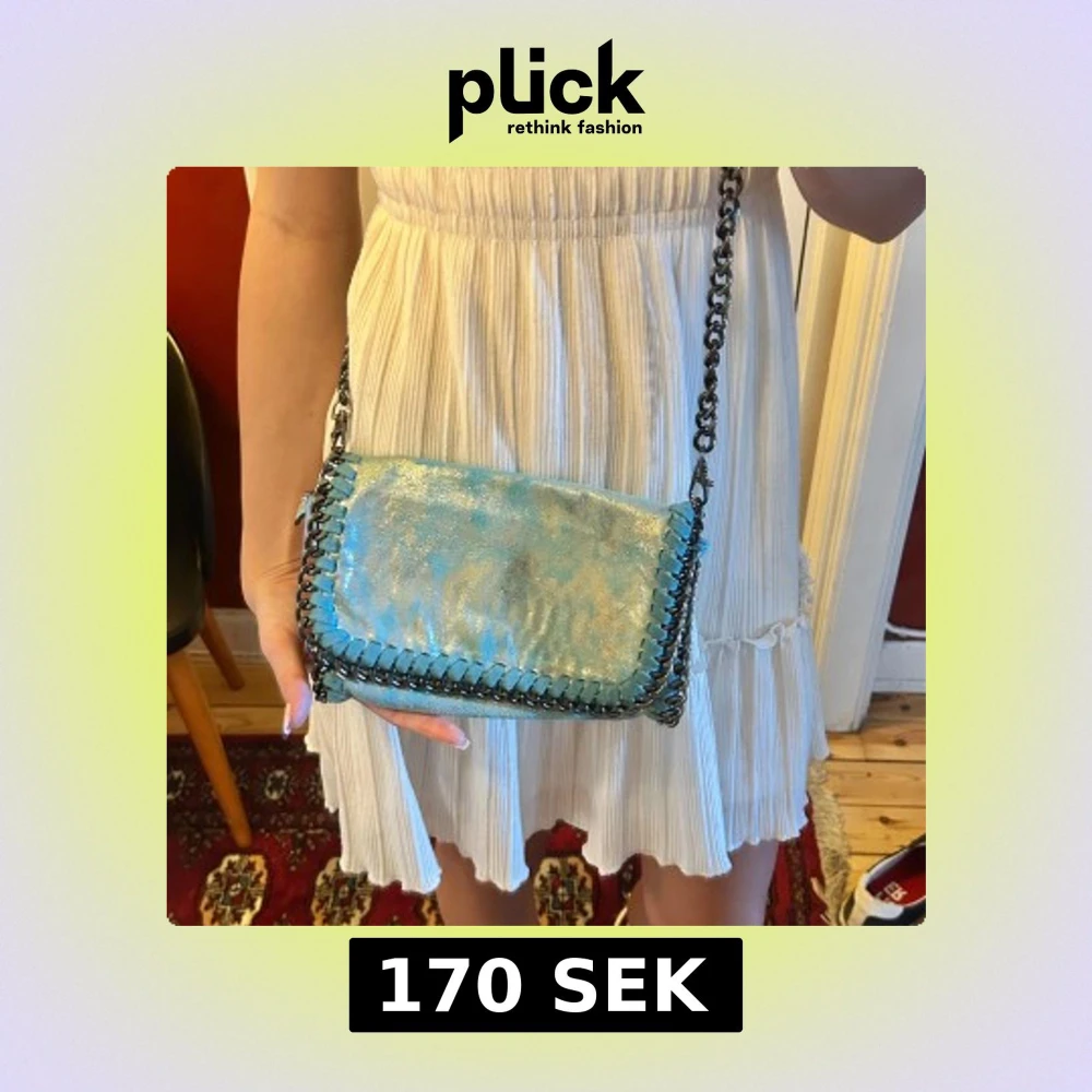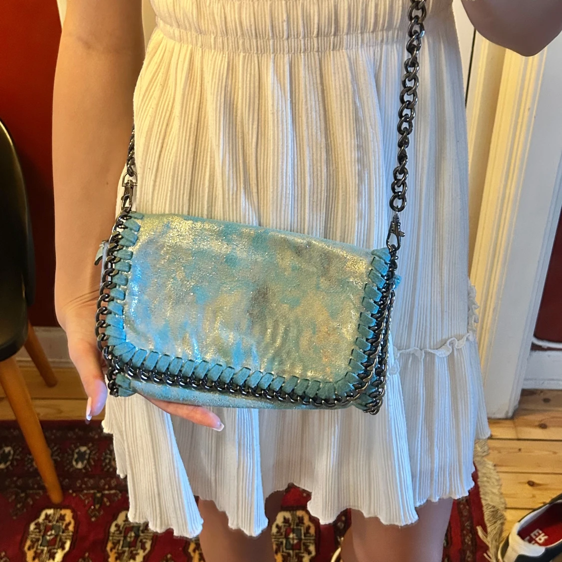 Cool axelväska i metallicblått och silver med kedjerem och dekorativa sömmar runt kanterna. Väskan har magnetlås och insida med plats för det viktigaste🩵
