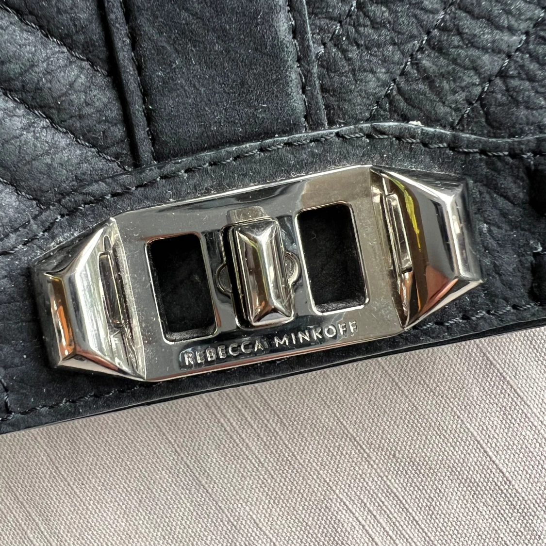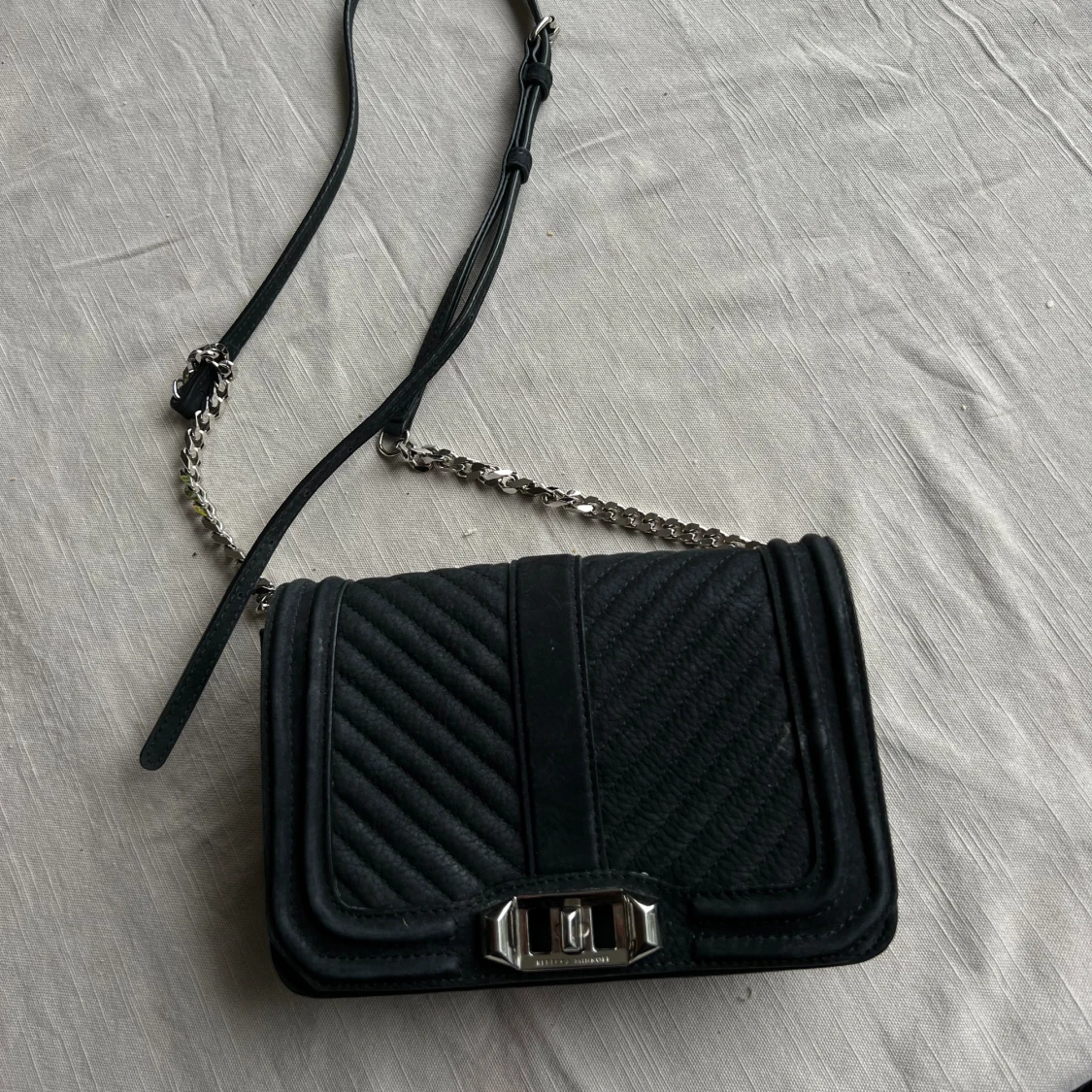 REBECCA MINKOFF quilted leather satchel bag, mocka material. Väskan är ytterst sparsamt använd. Perfekt storlek enligt mig (20x14cm) och passar till allt! Köparen står för frakten