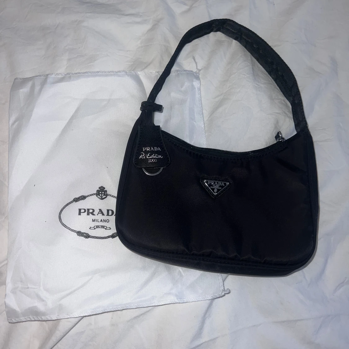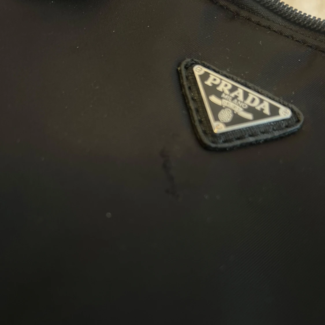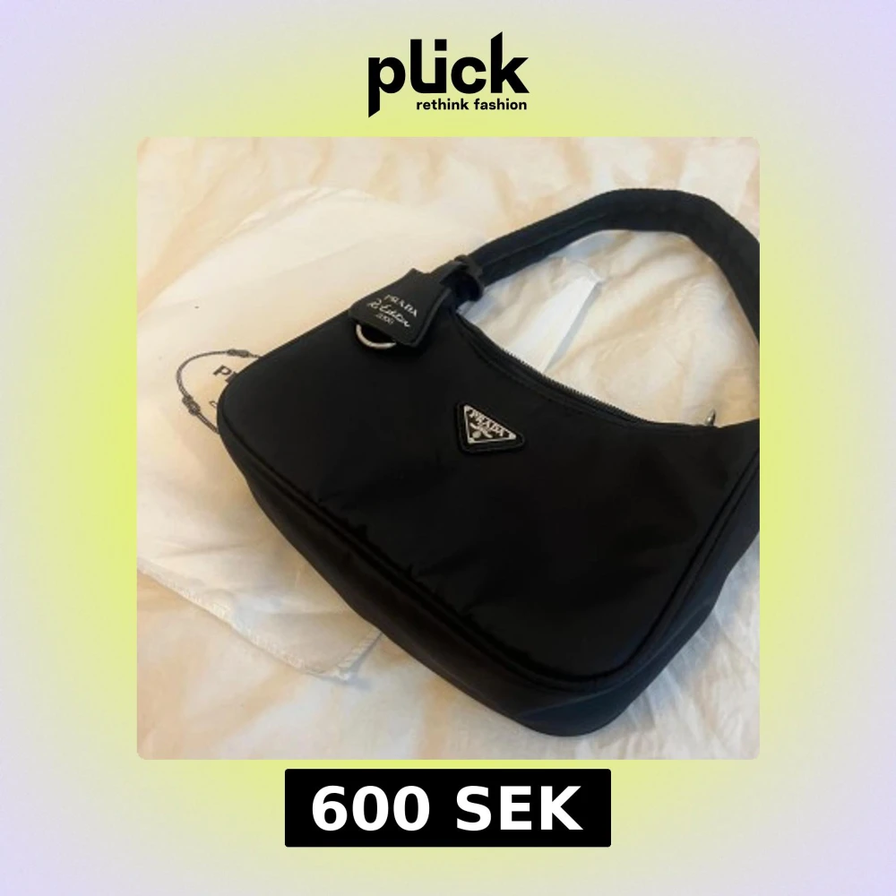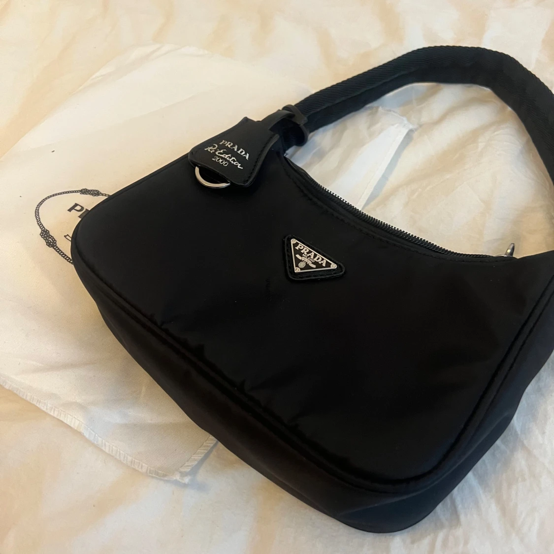 Säljer en svart axelväska med klassisk trekantig logga i metall framtill. Väskan är i mjukt nylonmaterial och har en enkel, stilren design med dragkedja upptill och bred axelrem. Perfekt för att lyfta vilken outfit som helst. Finns en liten repa men syns knappt. Dm för mer bilder