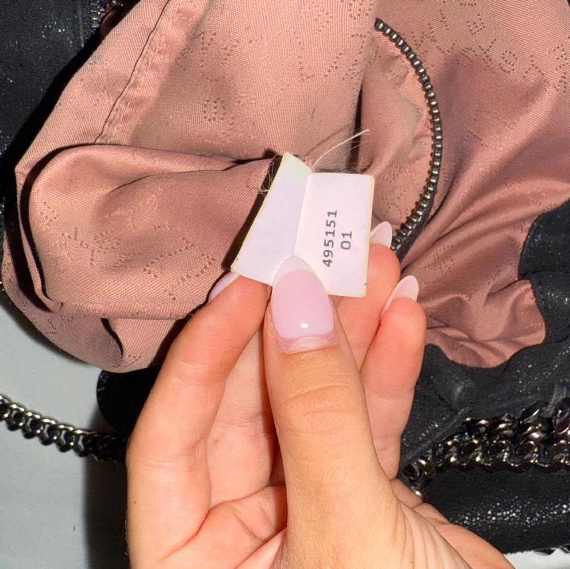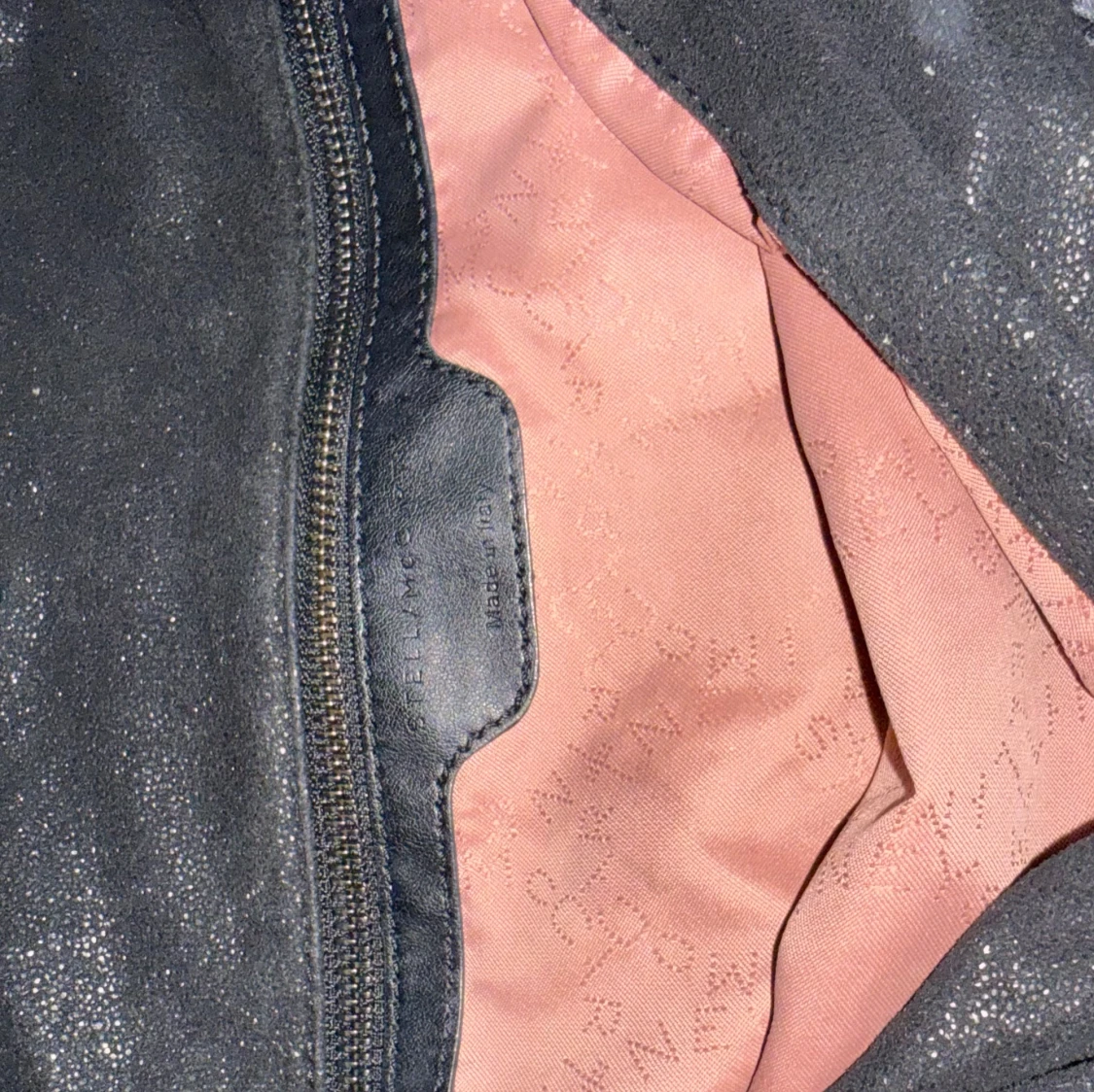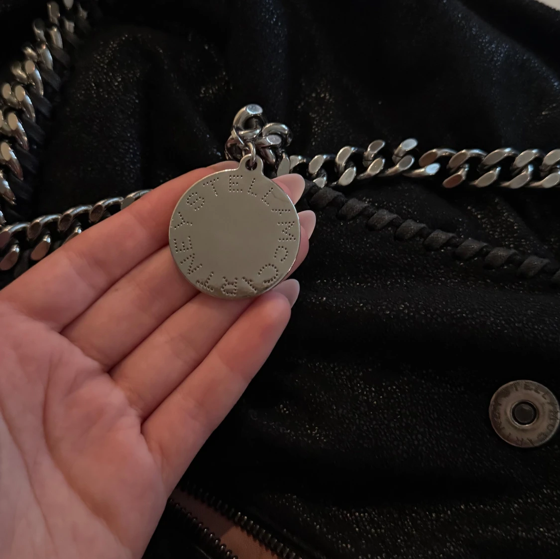 Säljer en svart axelväska från Stella McCartney med kedjedetaljer i silver och glansig finish. Väskan har ett rosa innerfoder med logotypmönster och dragkedja på insidan. Perfekt för dig som gillar statement-accessoarer och snygga detaljer. Bra skick! Perfekt för skolan, då man får plats med dator+annat. Skriv för fler bilder💗nypris runt 10 000