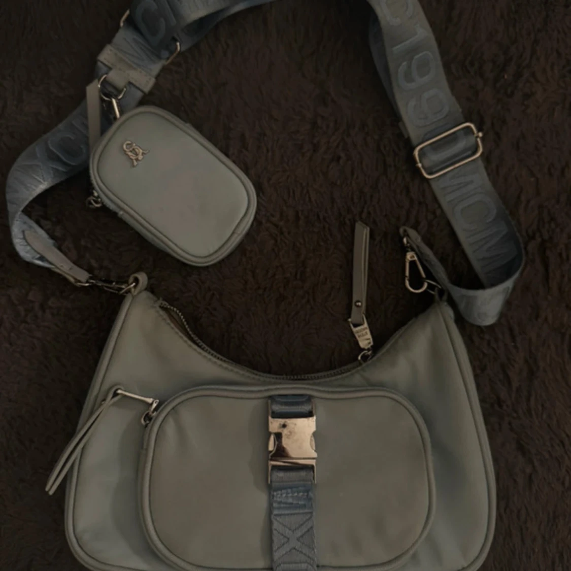 Snygg babyblå axelväska från Steve Madden med bred axelrem och extra liten väska fäst på remmen. Väskan har ett stort fack, en framficka med spänne och dragkedja samt detaljer i silver. Perfekt för dig som vill ha en trendig och praktisk väska. Skriv för fler bilder. PRIS KAN DISKUTERAS!!🥰