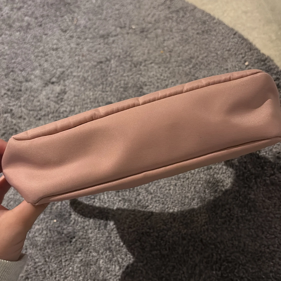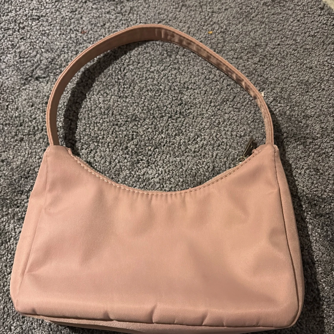 Snygg ljusrosa axelväska från Steve Madden med stilren design och silverfärgad logodetalj framtill. Väskan har ett huvudfack med dragkedja och en innerficka för småsaker. Materialet är mjuk polyester och remmen är bred och bekväm.