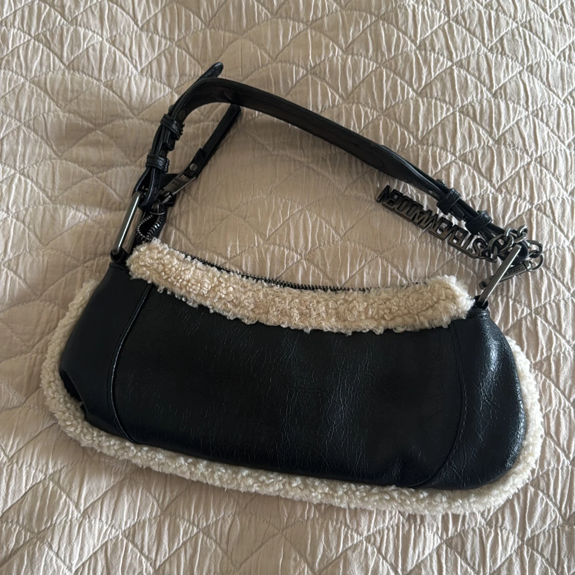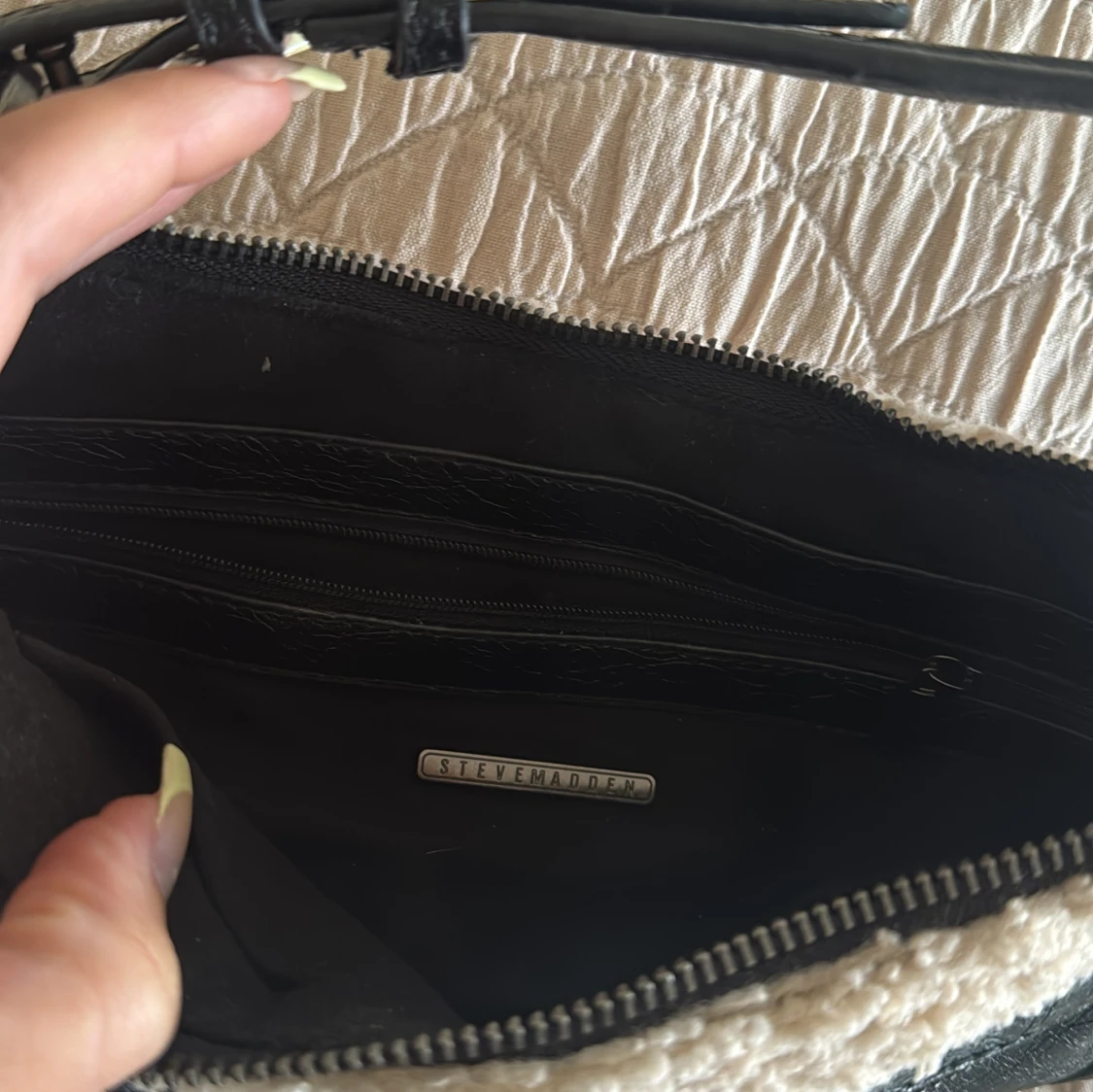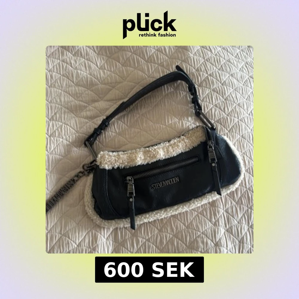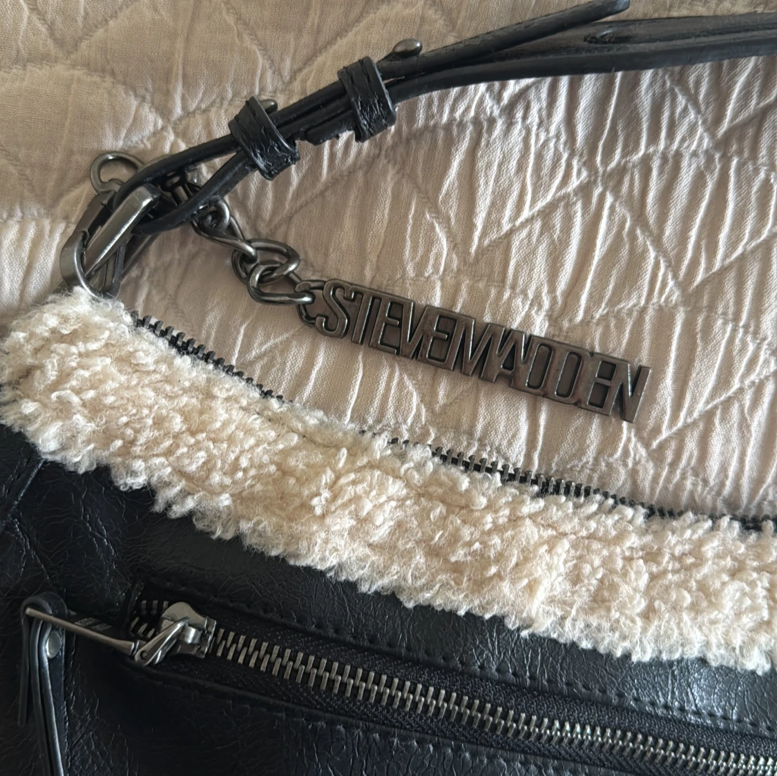 Cool svart axelväska från Steve Madden med mjuka teddy-detaljer i beige längs kanterna. Väskan har silverfärgade metalldetaljer, justerbar axelrem och dragkedja både fram och upptill. Insidan har extra fack med dragkedja. Perfekt storlek för det viktigaste.