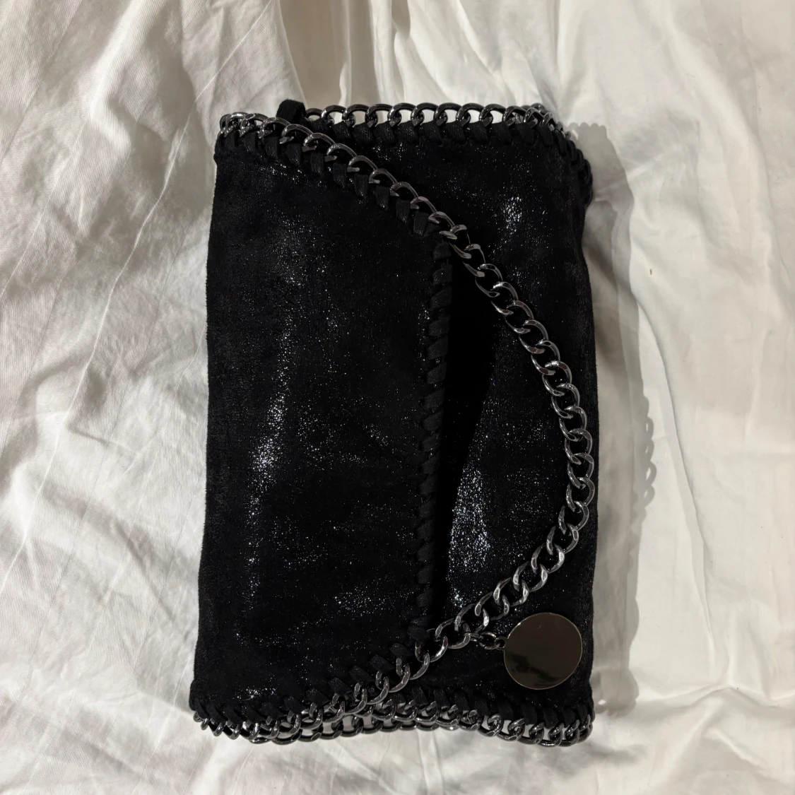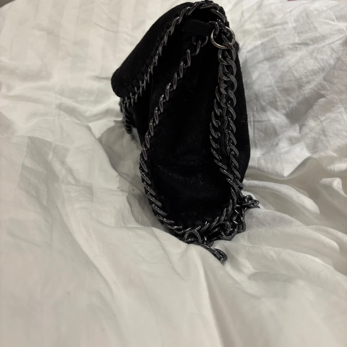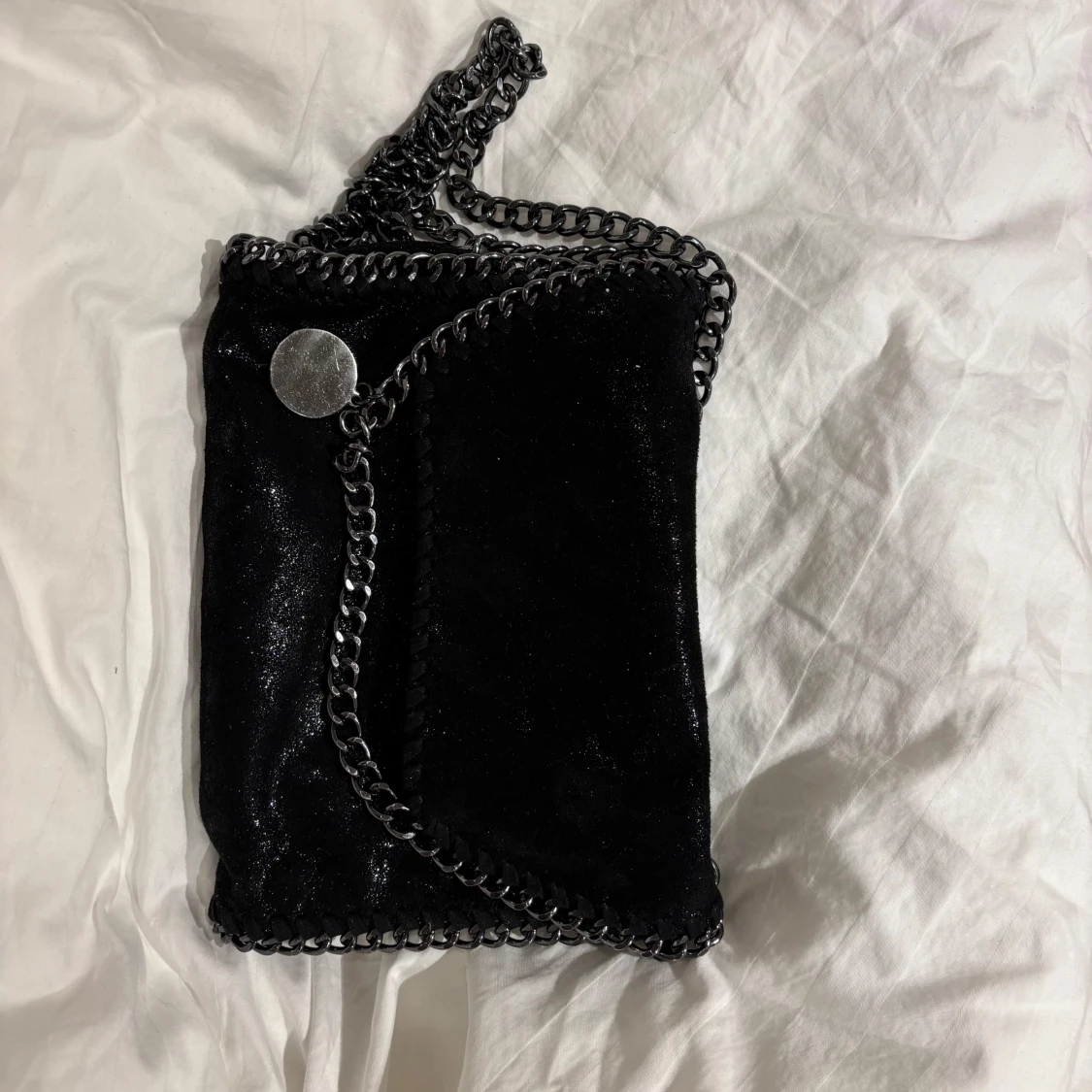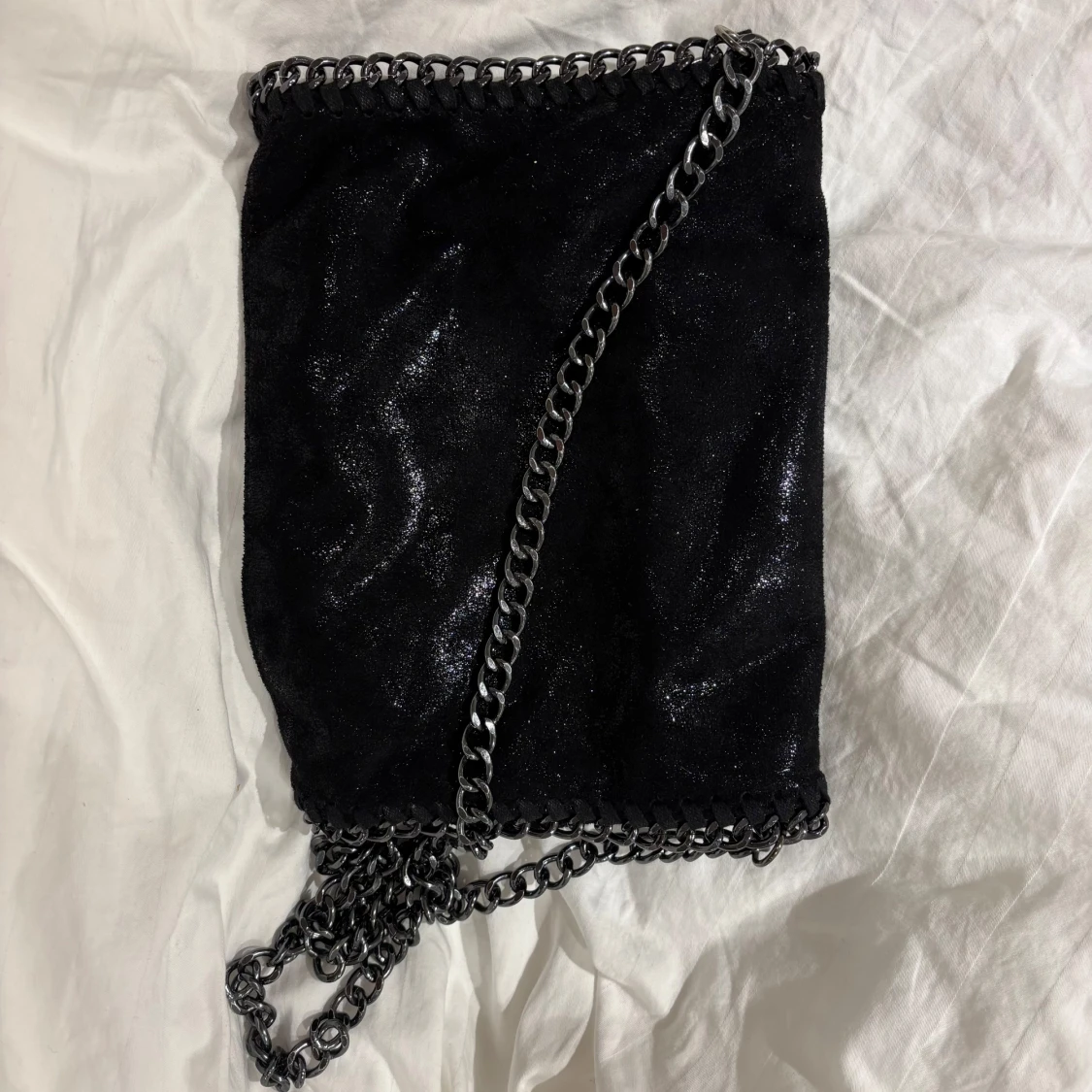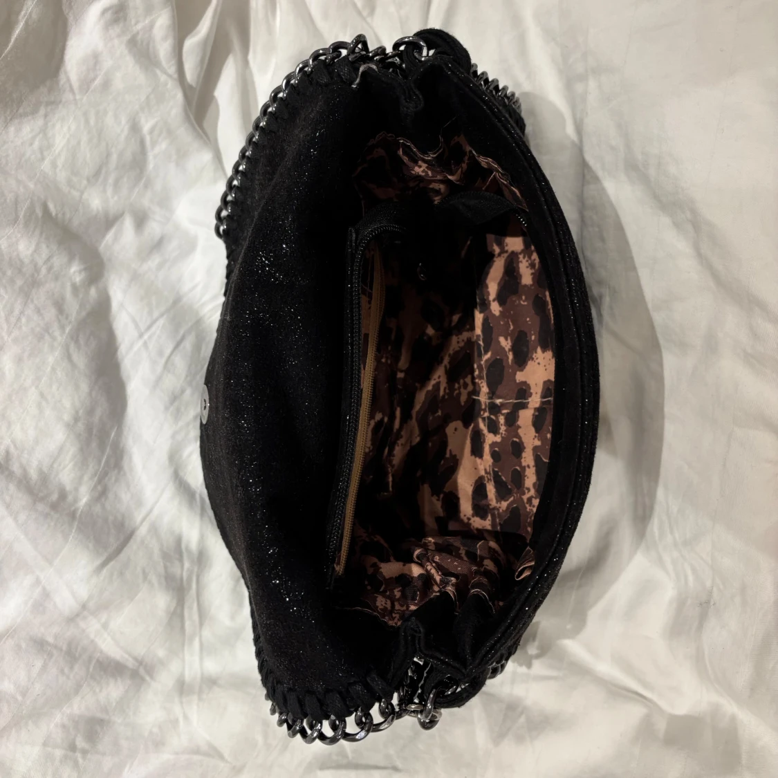 Snygg Stella mcartleyliknande väska med glittrig yta och kedjedetaljer. Väskan har en silverdetalj och ett leopardmönstrat foder inuti. Den är i nyskick då ja använt den få gånger!!
