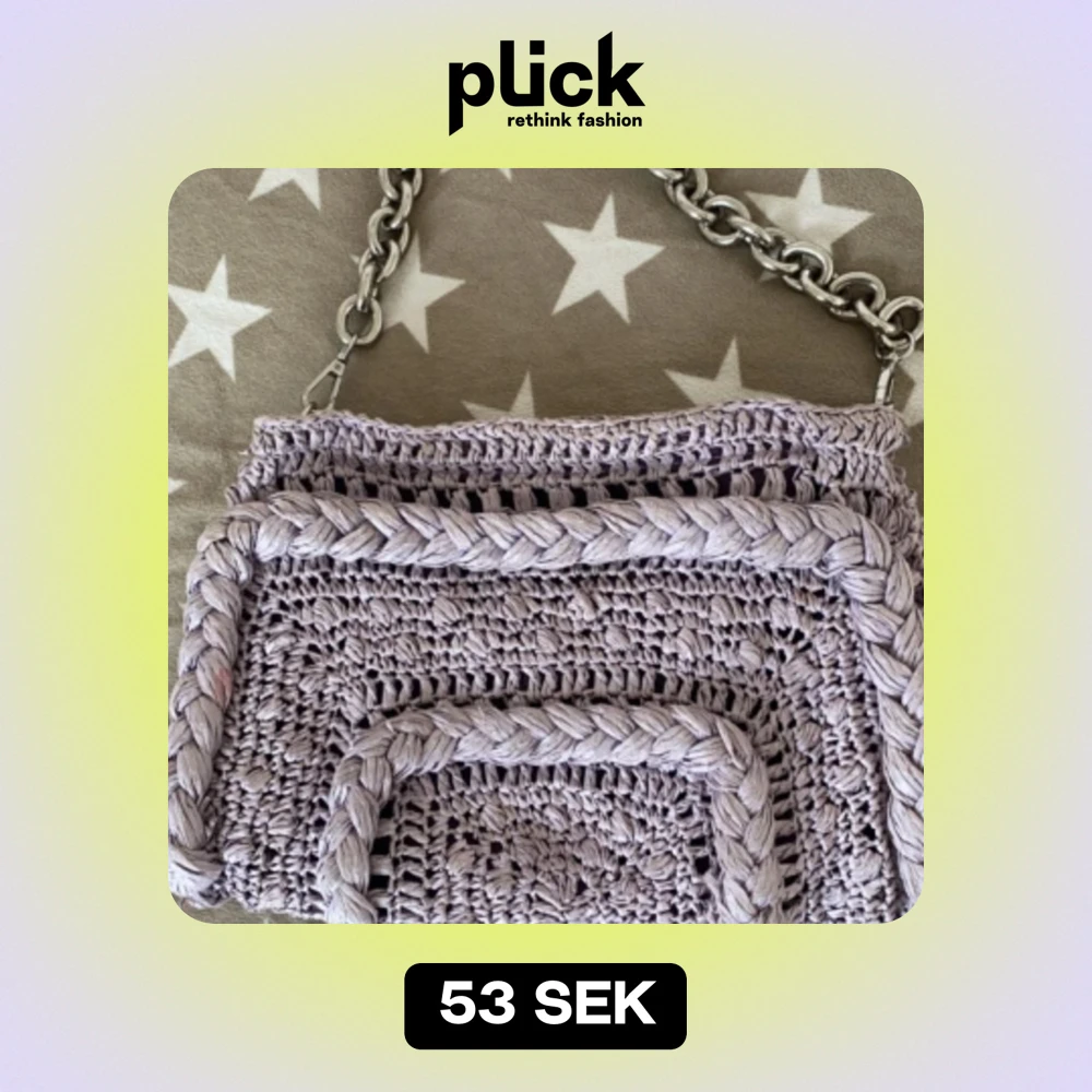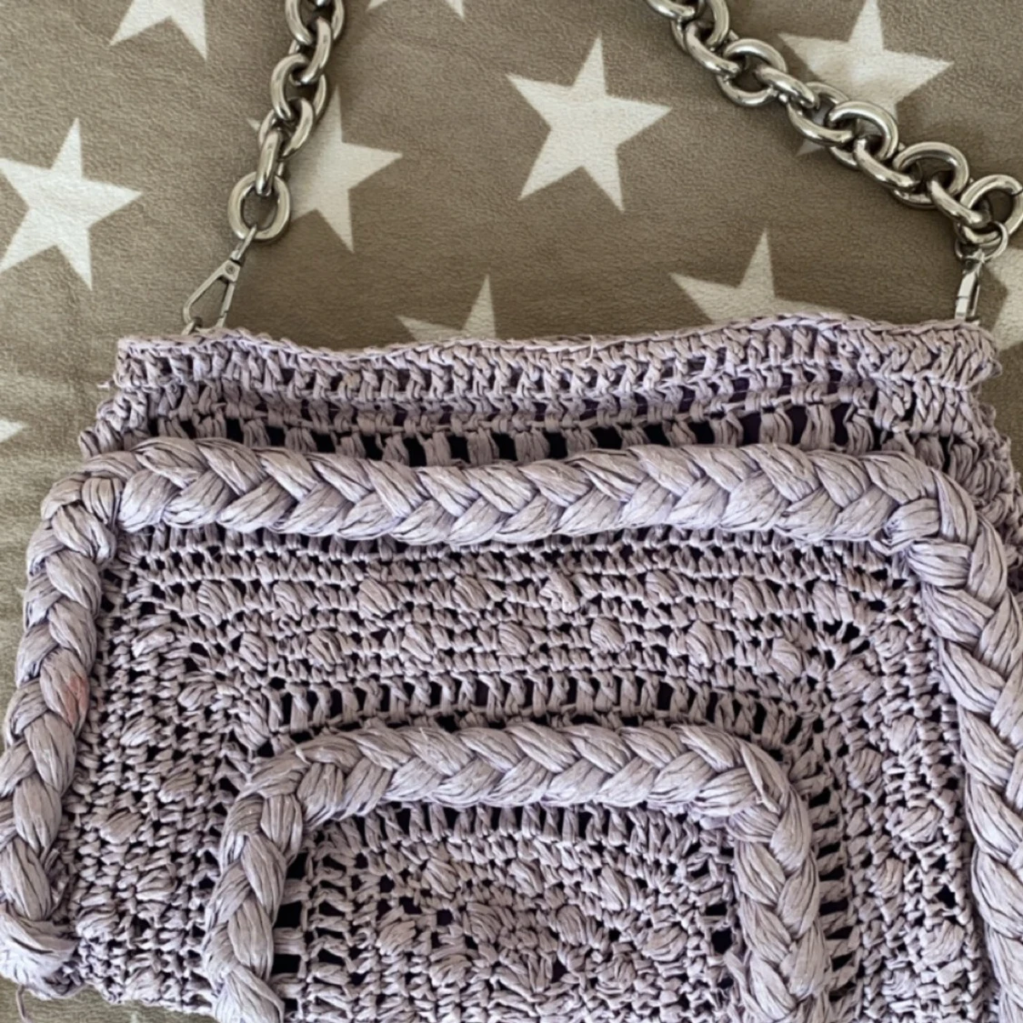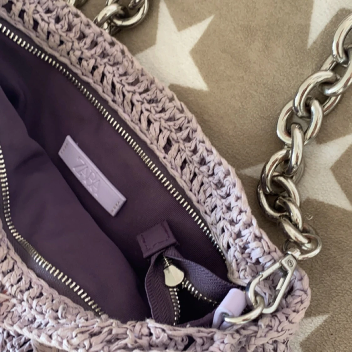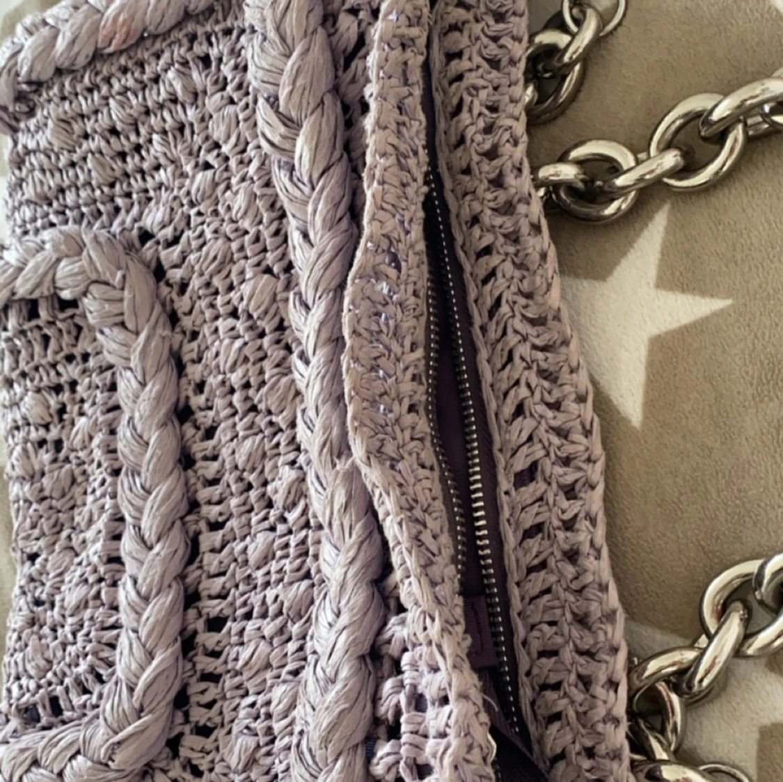 Säljer en superfin ljuslila stickad axelväska med en cool kedja som axelrem. Väskan har en dragkedja upptill för säker förvaring. Perfekt för att ge din outfit en unik touch!
