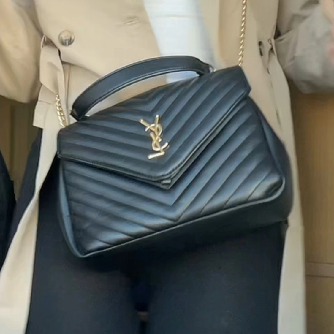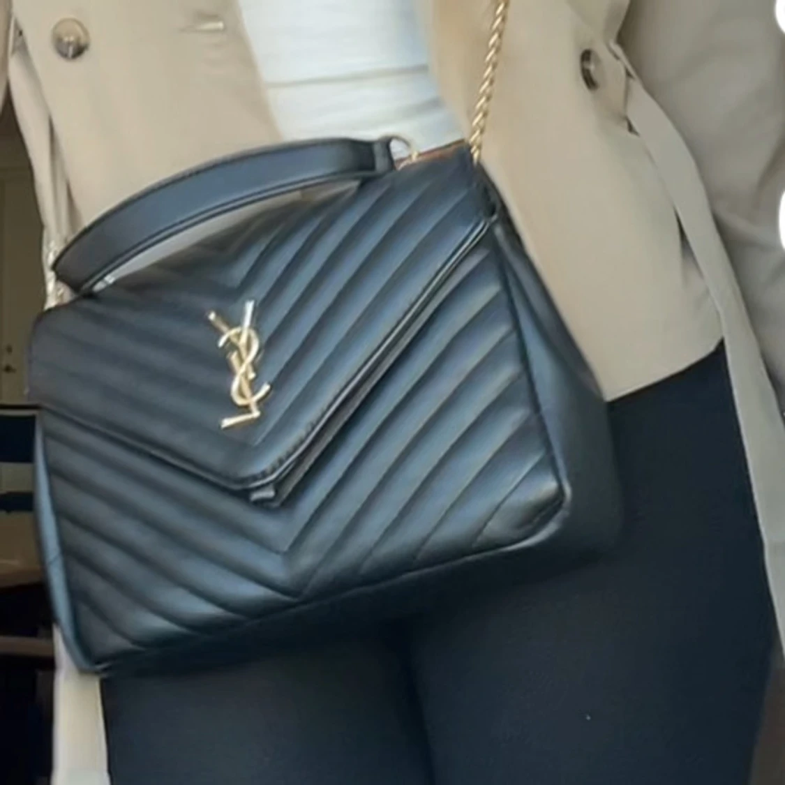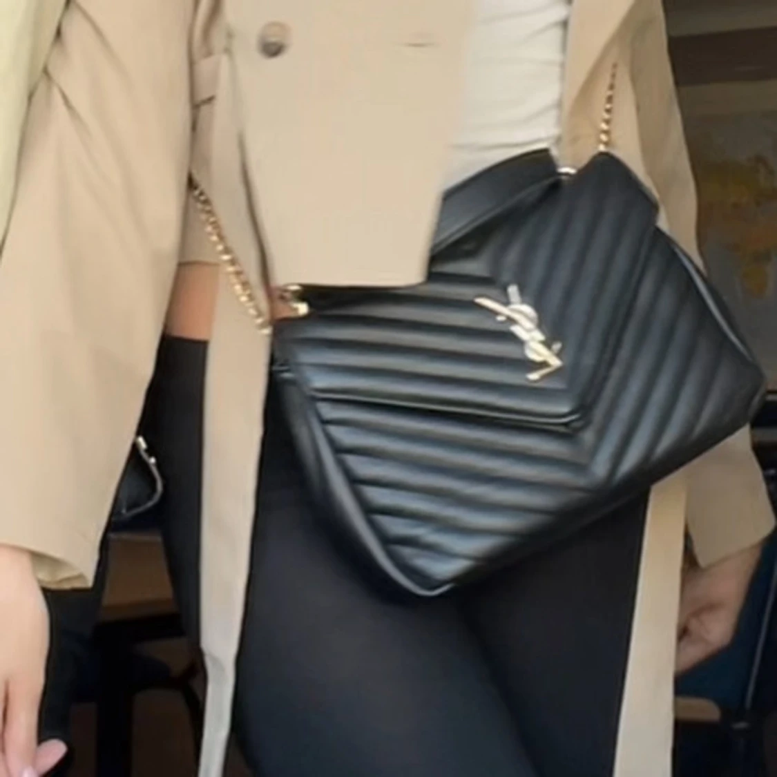 Säljer en svart quiltad axelväska YSL med guldiga detaljer och kedjerem. Väskan har ett stilrent V-format mönster och klassisk YSL-logga framtill. Tillverkad i skinn och har både handtag och axelrem för flexibel användning.
