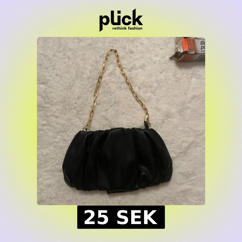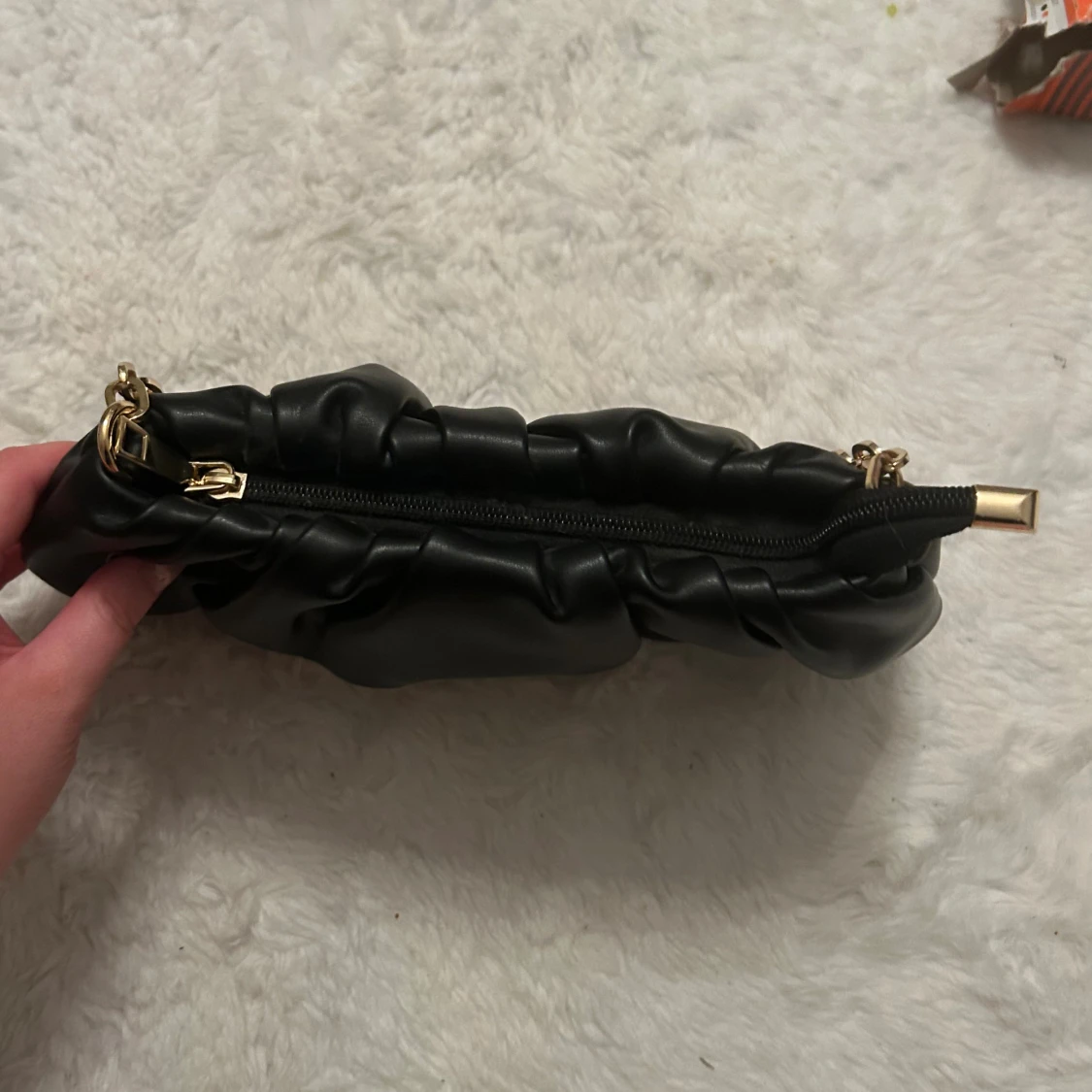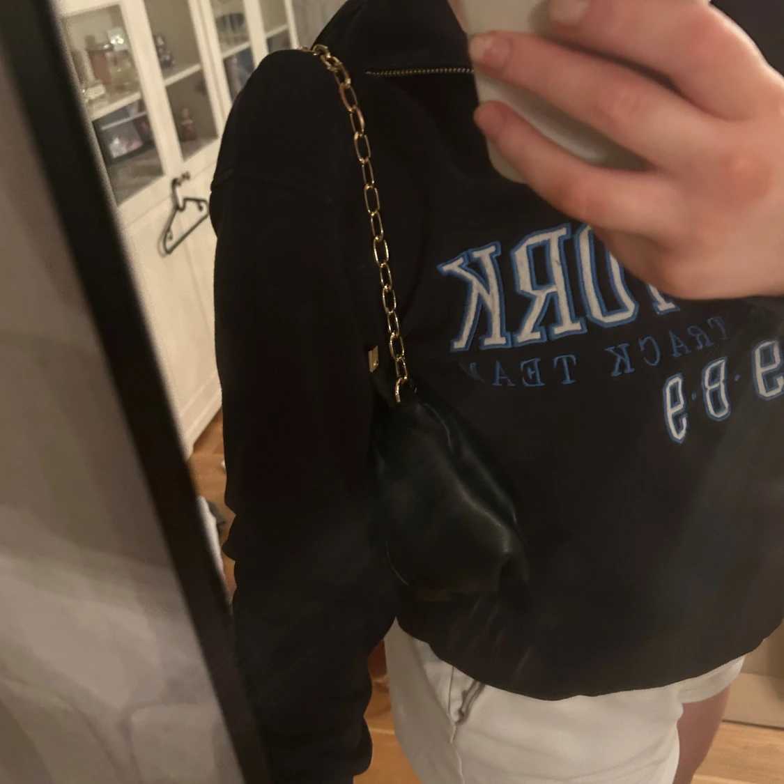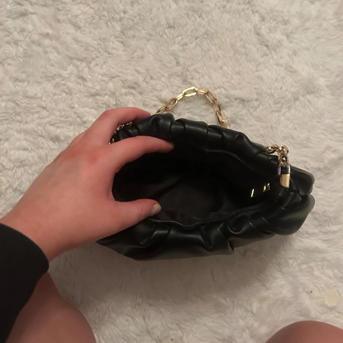 svart axelväska med puffad design skinn-material och guldfärgad kedja som axelrem. Väskan är gjord i skinnimitation och har dragkedja upptill.