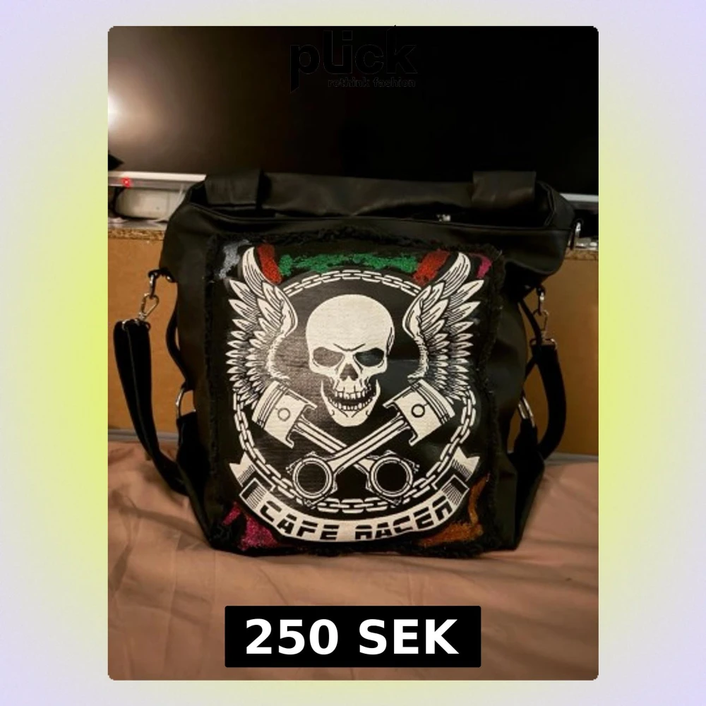 Cool svart axelväska i skinnmittation med stort tryck av dödskalle, vingar och texten 'Cafe Racer' på framsidan. Väskan har både handtag och justerbar axelrem, samt dragkedjeficka på baksidan och många fack inuti. Färgdetaljer i rött, grönt och lila på framsidan.