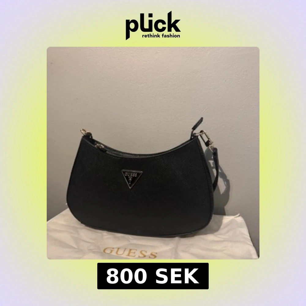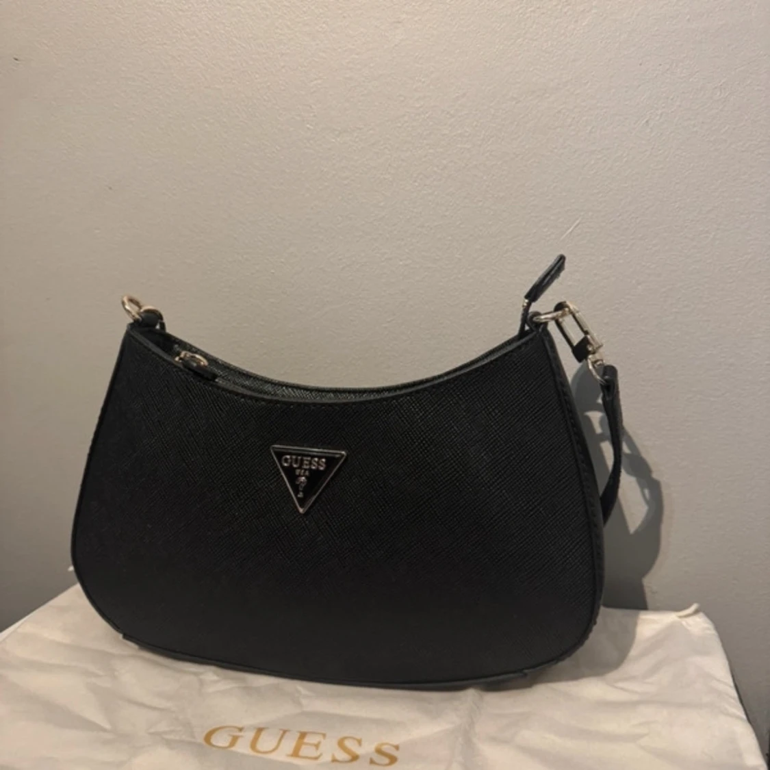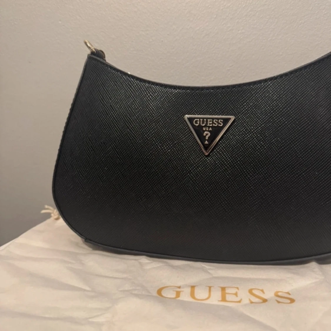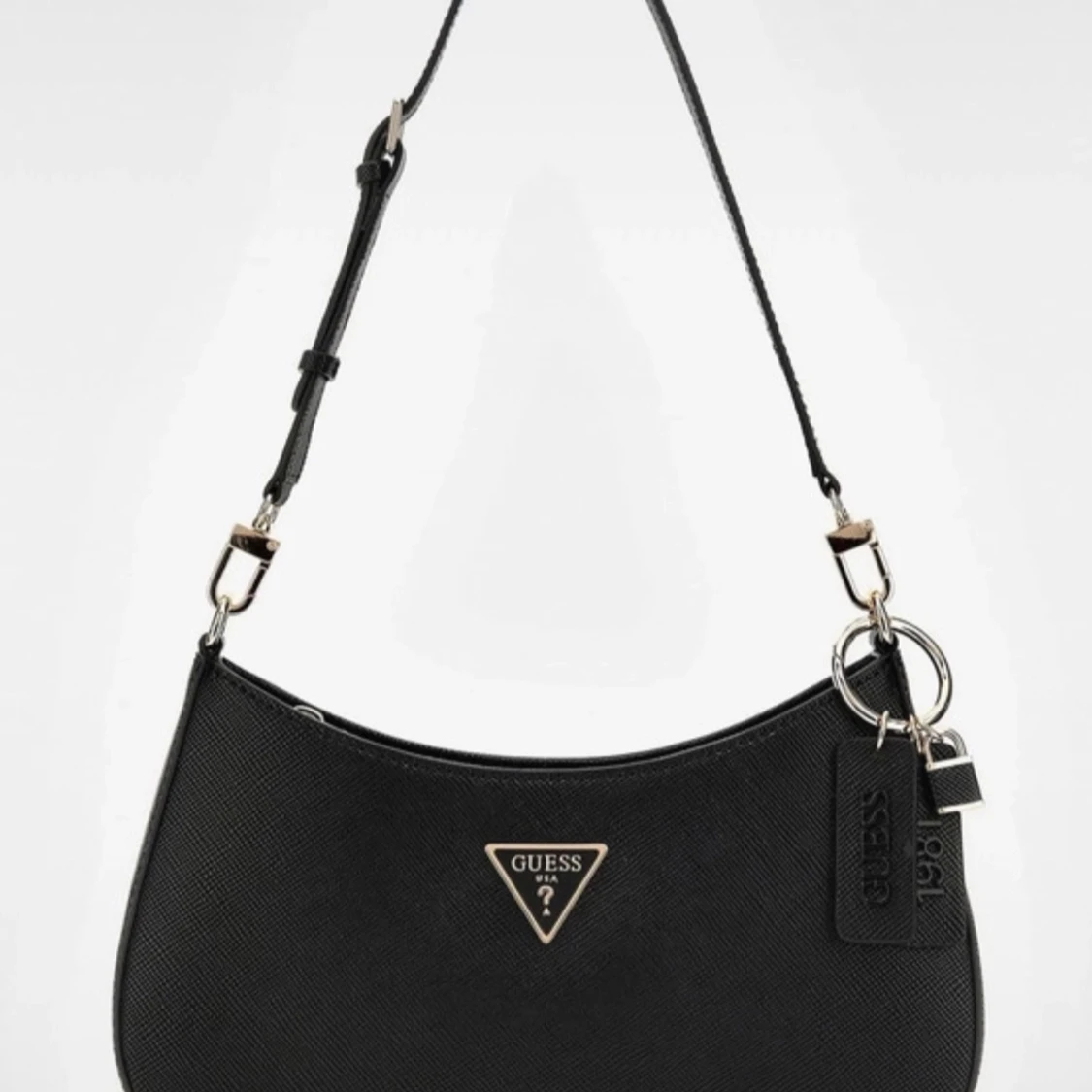 Snygg svart axelväska från Guess med klassisk triangellogga i metall framtill. Väskan har justerbar axelrem och stilren design, perfekt för att lyfta vilken outfit som helst. Materialet är strukturerat syntet och väskan har dragkedja upptill.
