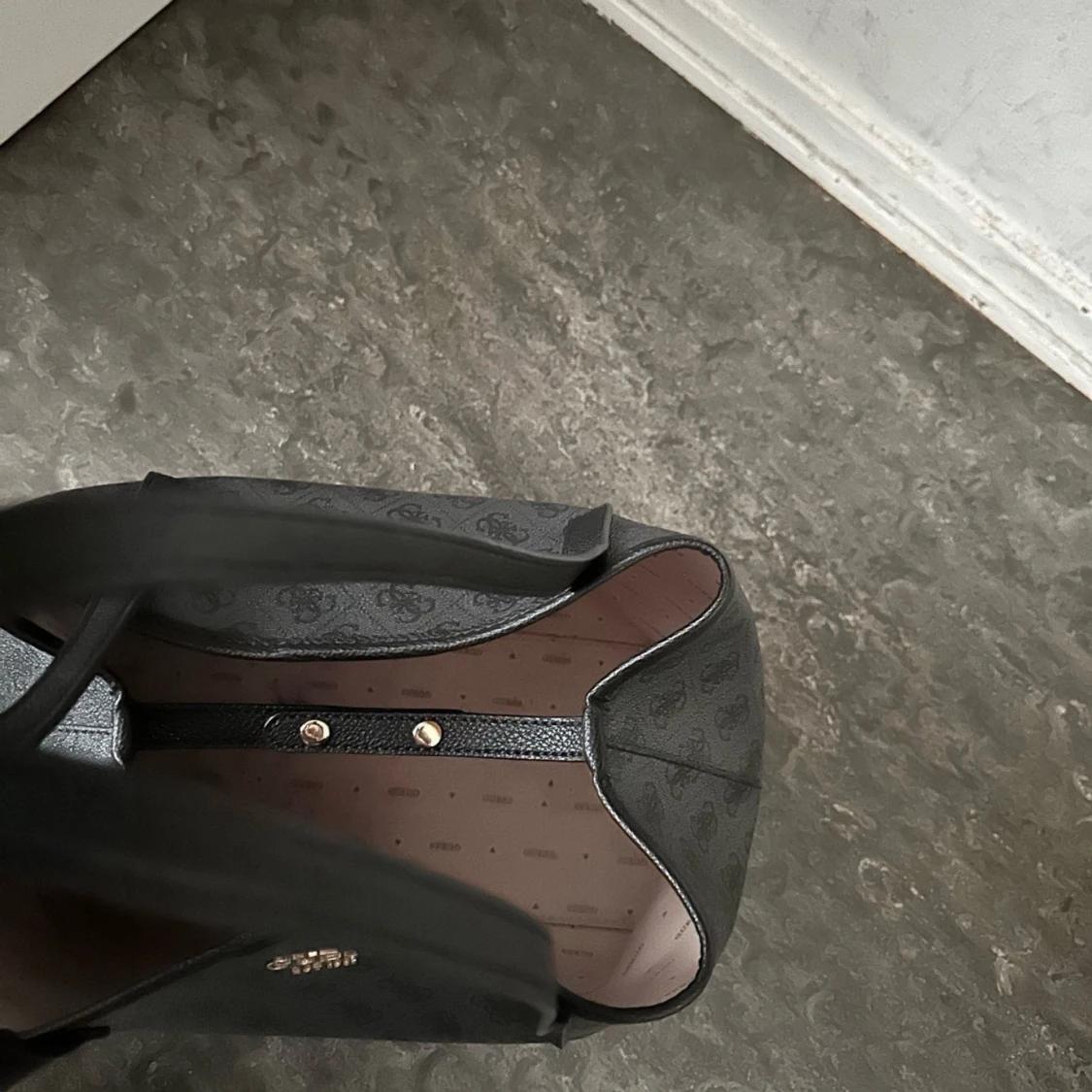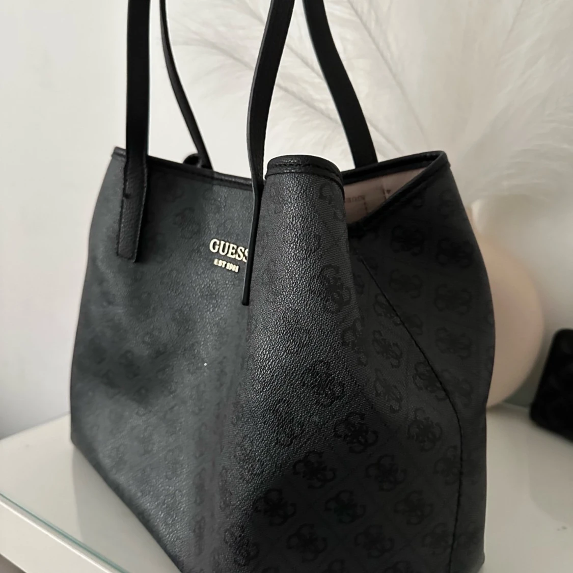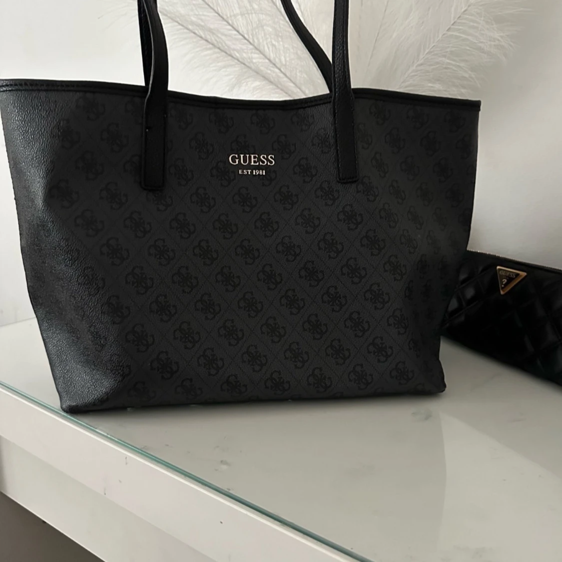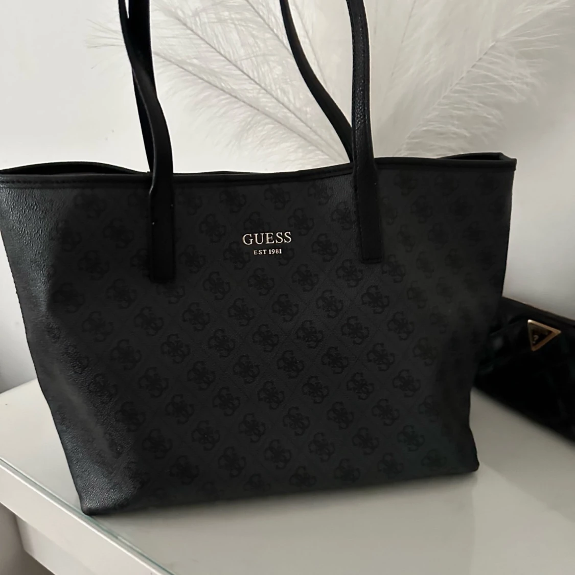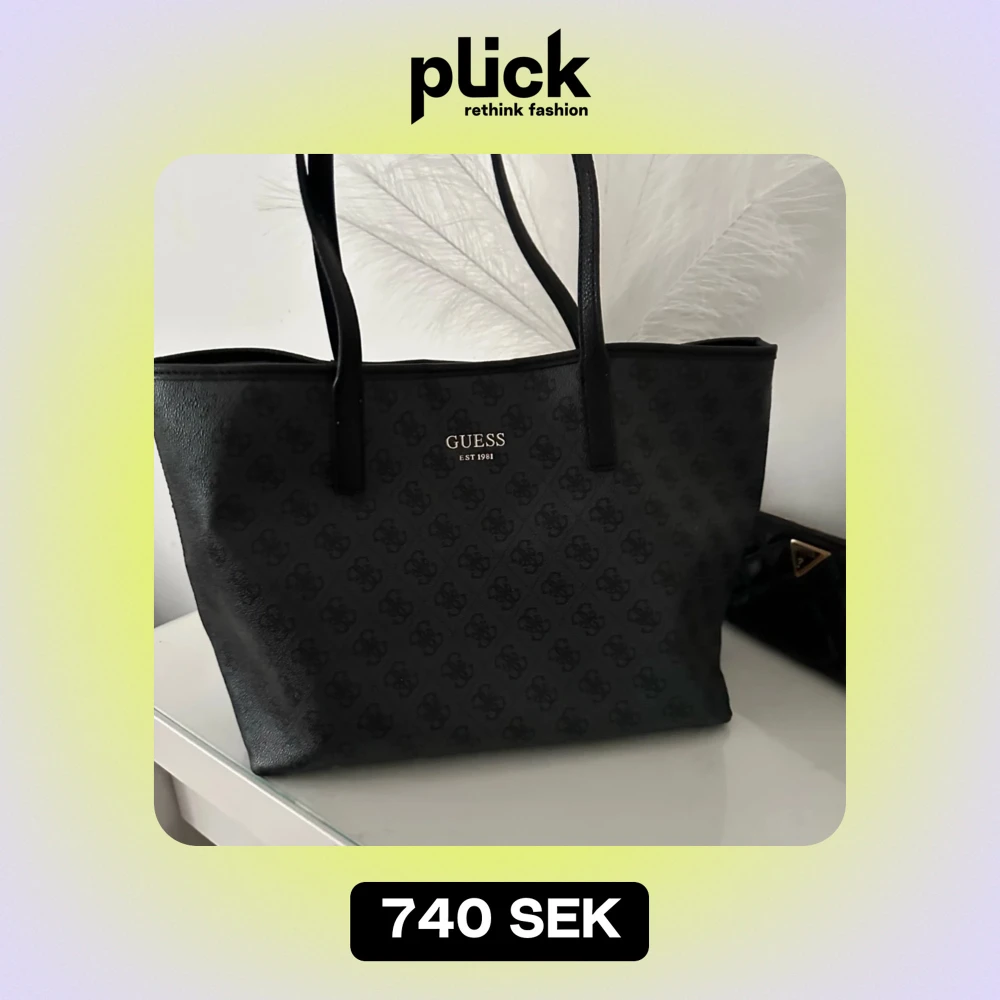 Snygg svart axelväska från Guess i mycket bra skick. Väskan har ett diskret mönster och är tillverkad i syntetmaterial. Köpt hos Zalando för 1495kr, den är slutsåld. Den har även svarta fläckar i insidan. Har inte försökt att ta bort men det kanske går bort.