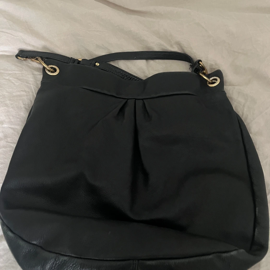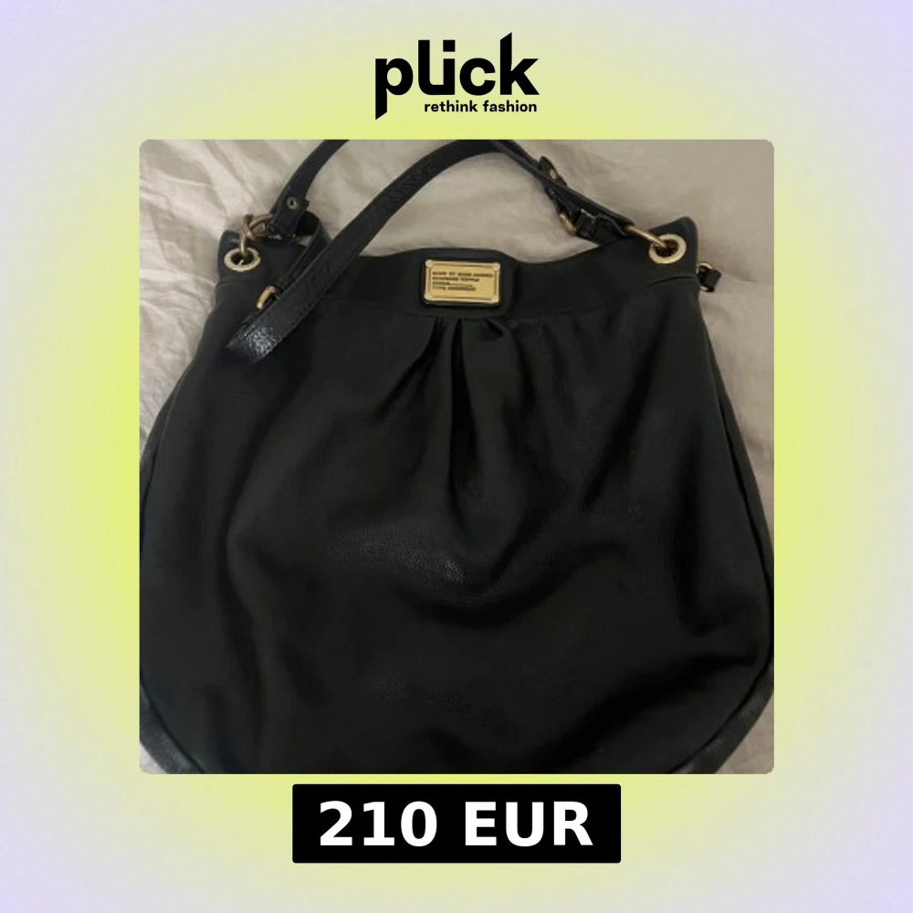 Snygg stor väska från Marc by Marc Jacobs med guldiga metalldetaljer och justerbar rem. Väskan är tillverkad i mjukt skinn och har en klassisk, rundad form med veckad framsida och en metallplatta med logga framtill. Dustbag ingår.