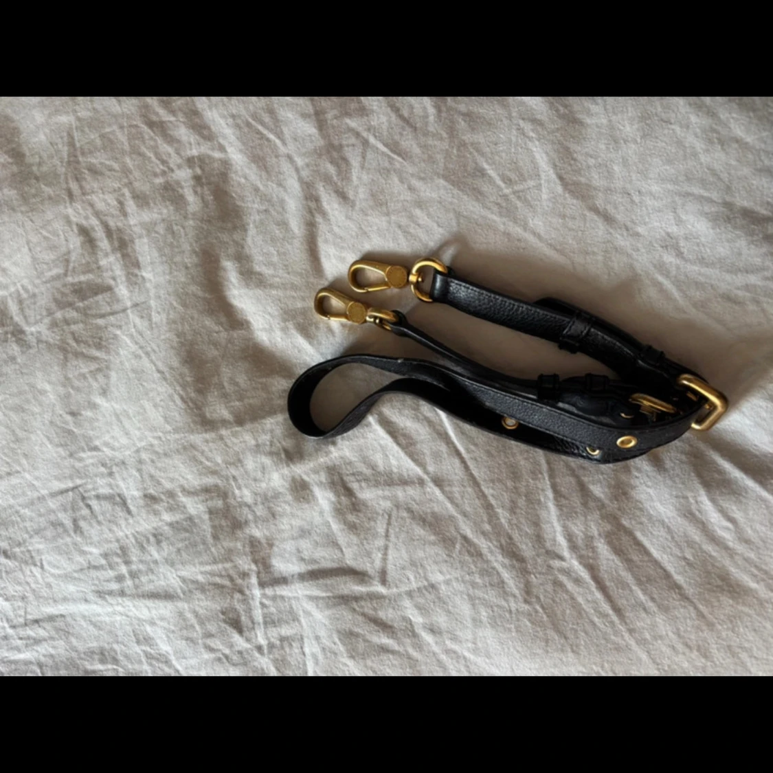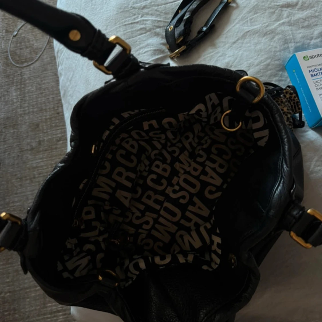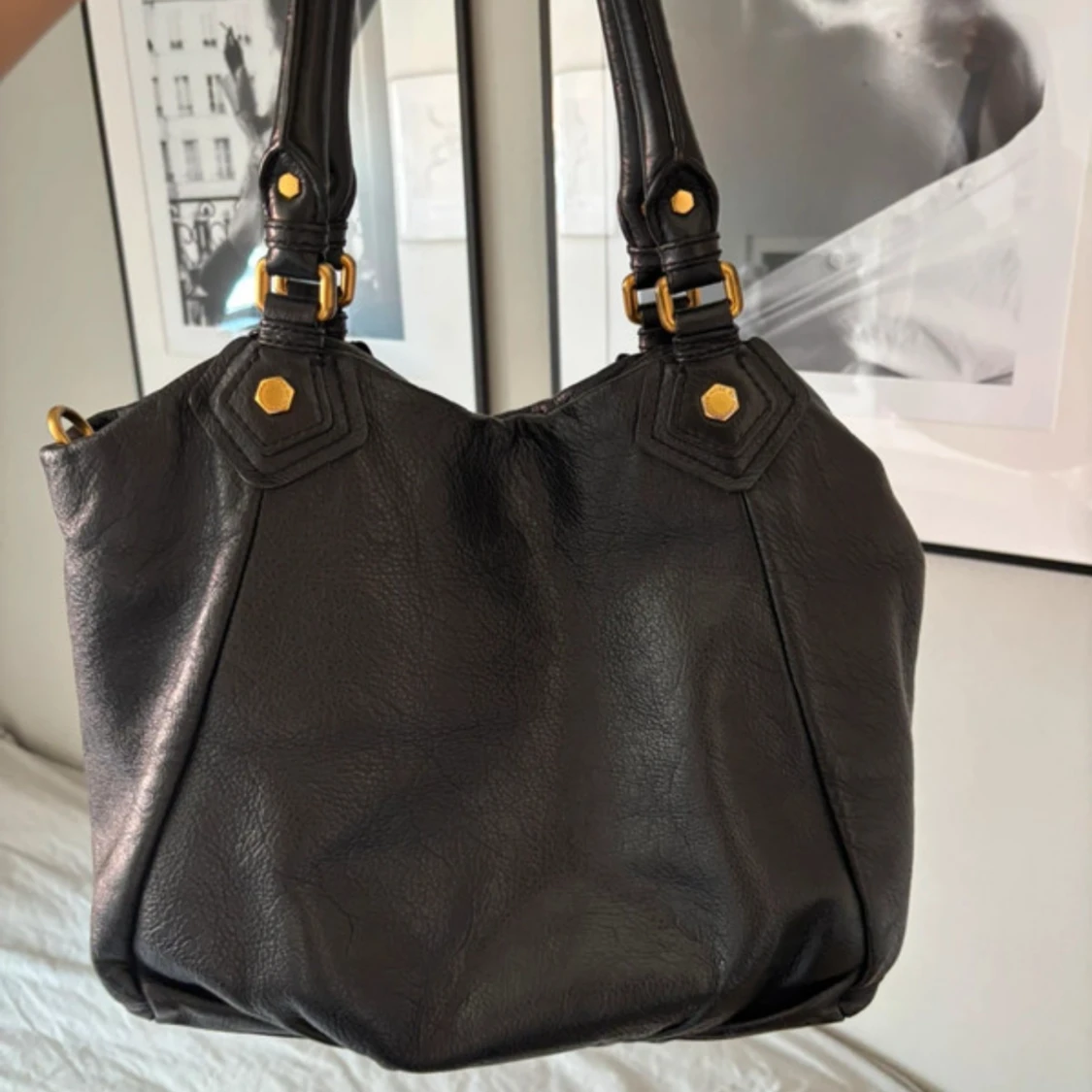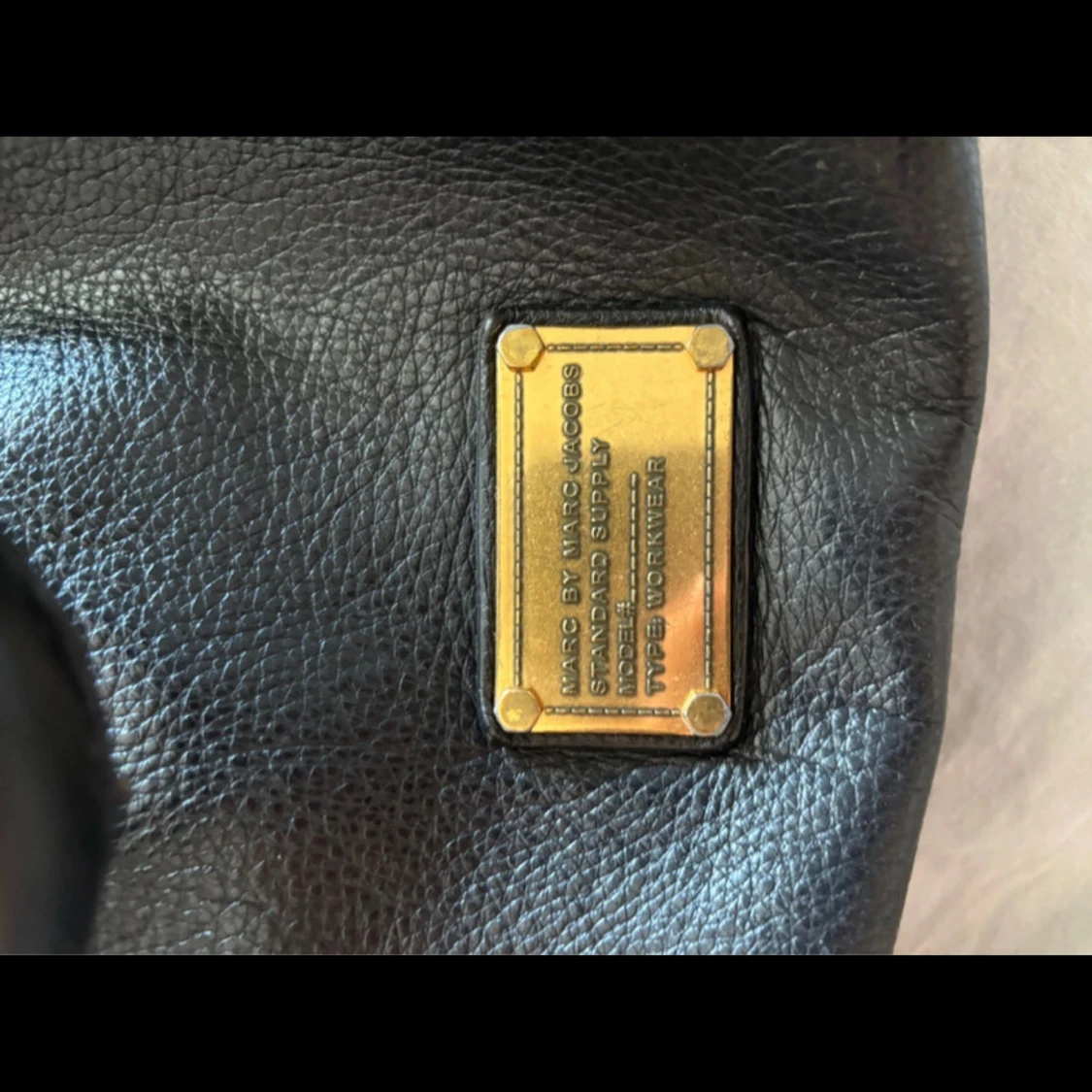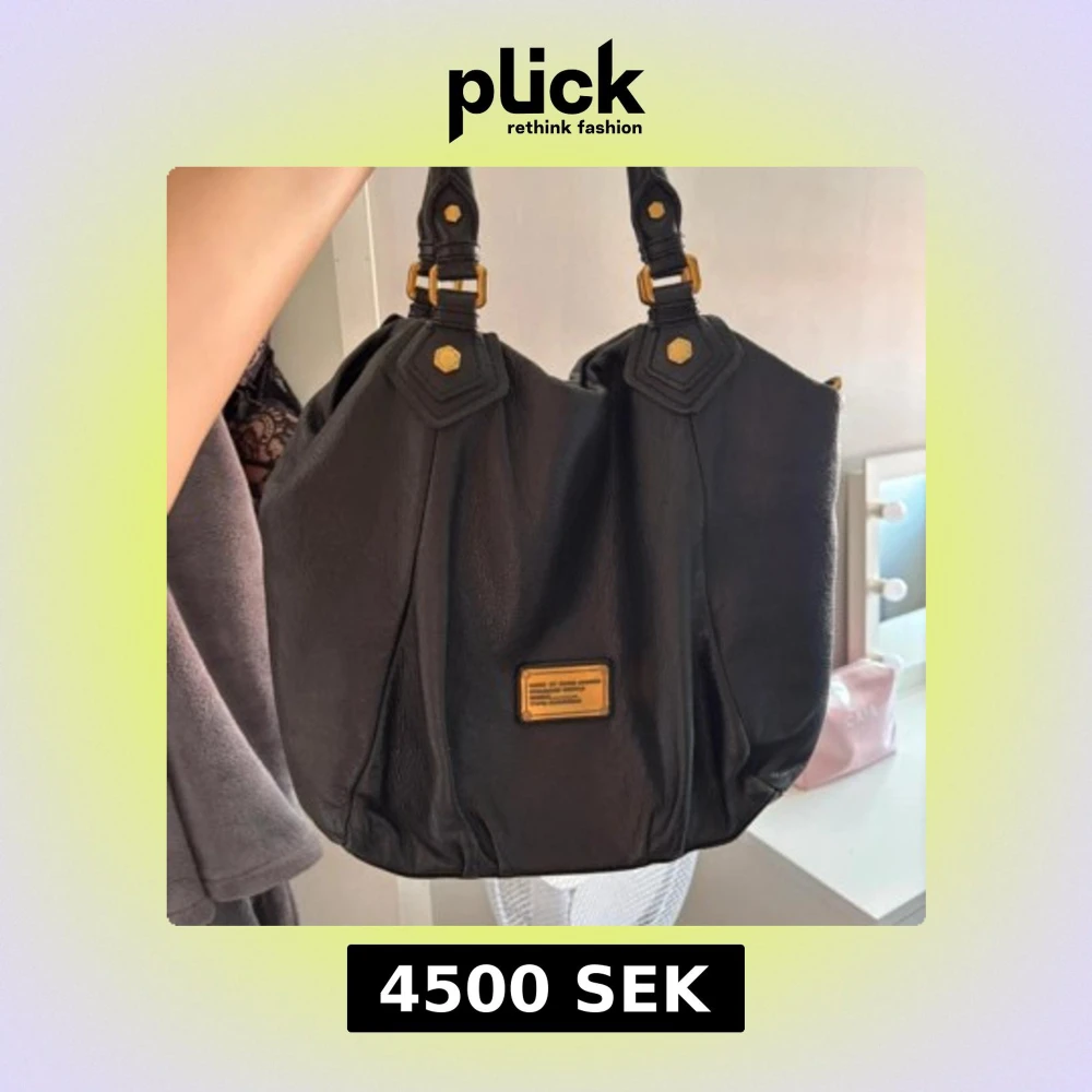 Snygg svart axelväska i skinn från Marc by Marc Jacobs med guldiga metalldetaljer och logoplatta framtill. Väskan har dubbla handtag och ett rymligt foder med grafiskt tryck. Perfekt för dig som vill ha en klassisk men cool väska med plats för allt du behöver.