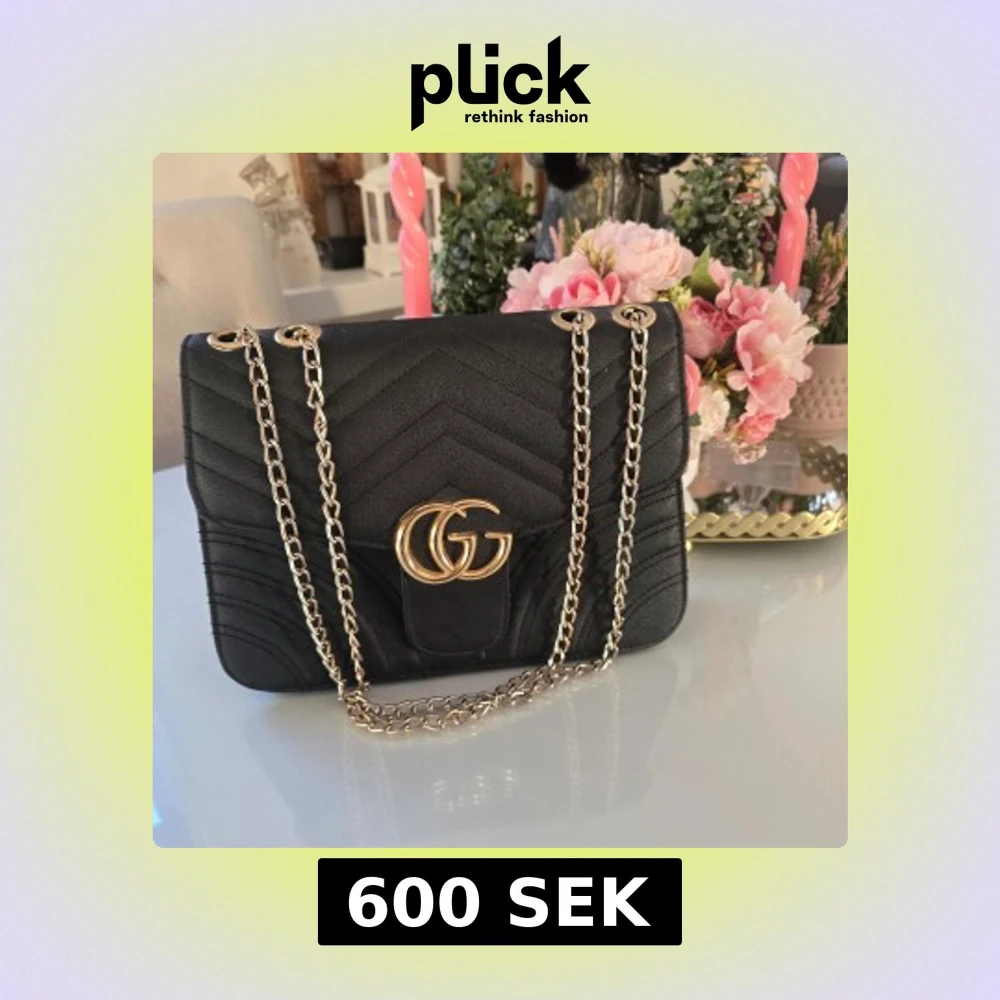 Snygg svart axelväska i skinn med elegant silver och GG-logga framtill. Väskan har ett quiltat mönster och stängs med en tryckknapp. Perfekt för att ge en lyxig touch till din outfit.