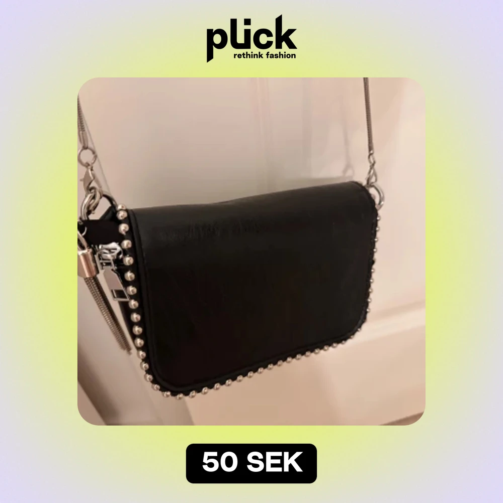 Säljer en supercool svart axelväska med nitar längs kanterna. Den har en stilren design med en silverfärgad kedja som axelrem. Perfekt för en utekväll eller när du vill lägga till lite edge till din outfit!