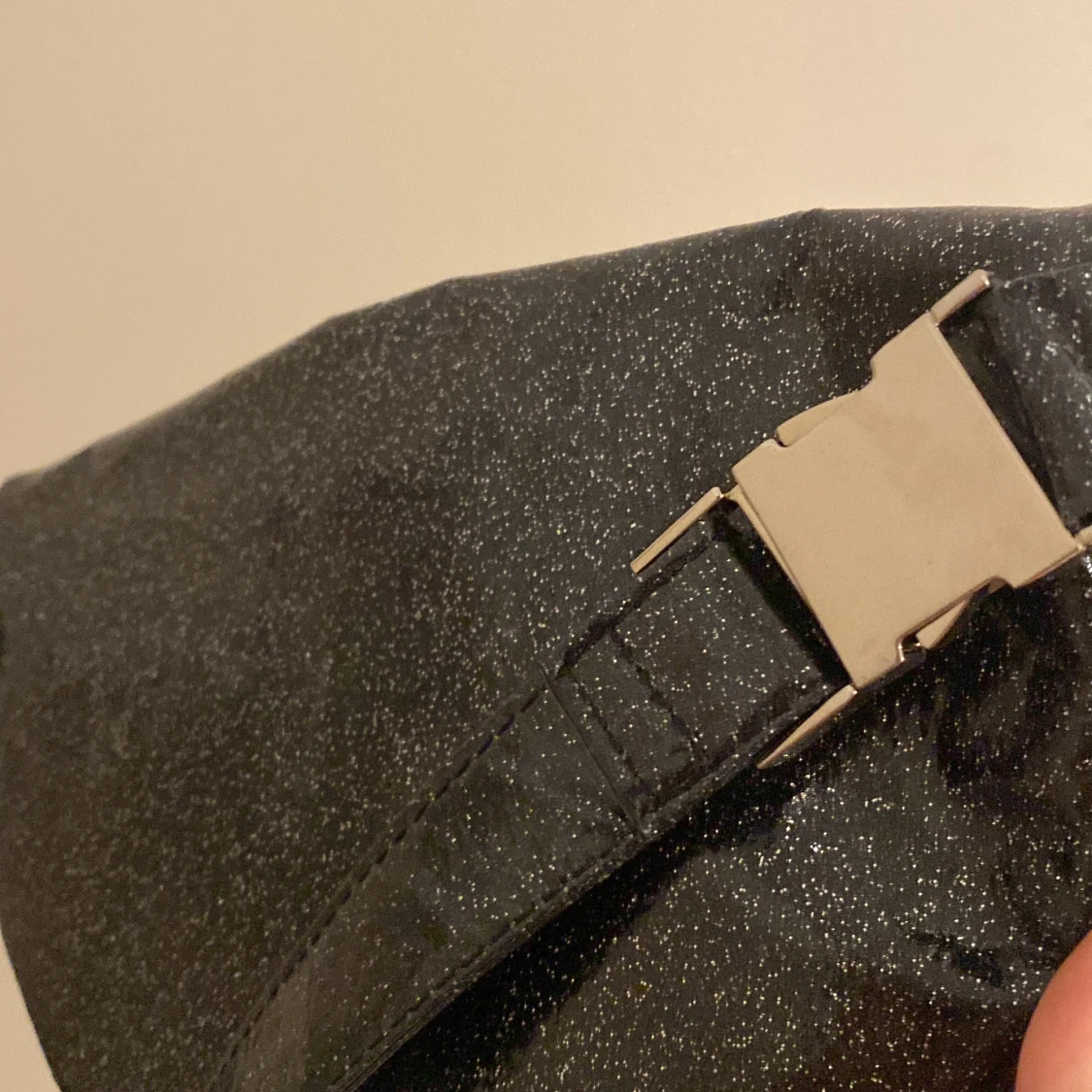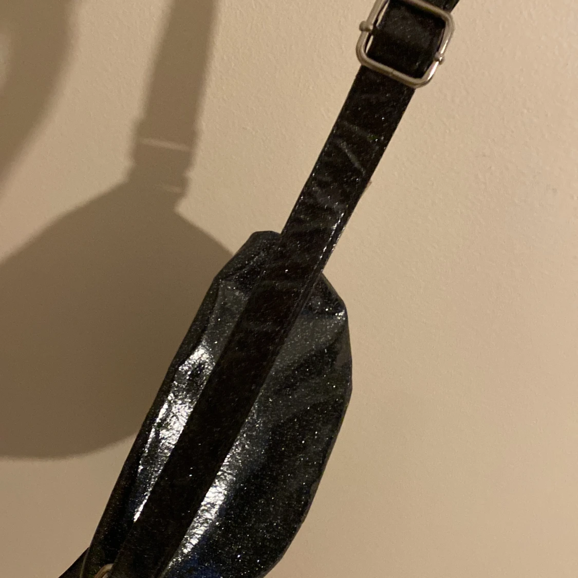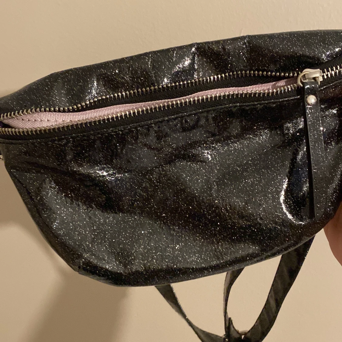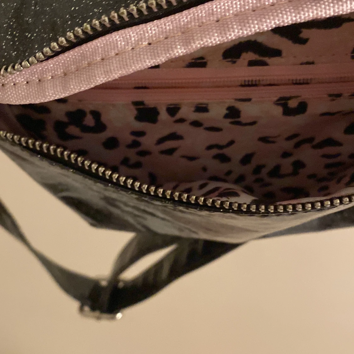Säljer en supercool svart glittrig axelväska med ett snyggt leopardmönstrat foder. Väskan har en dragkedja upptill och en justerbar rem. Perfekt för att ge din outfit lite extra bling! 🖤✨
