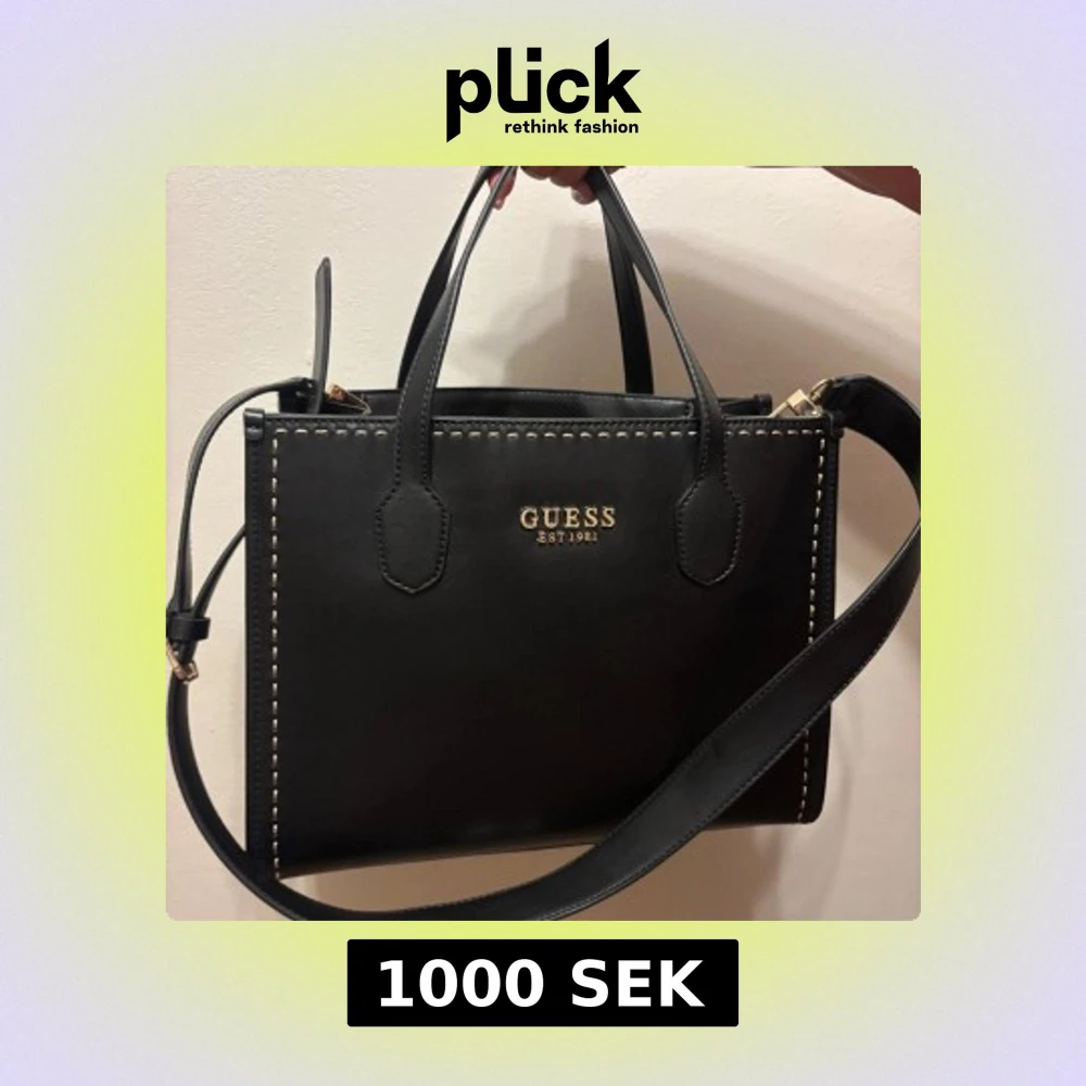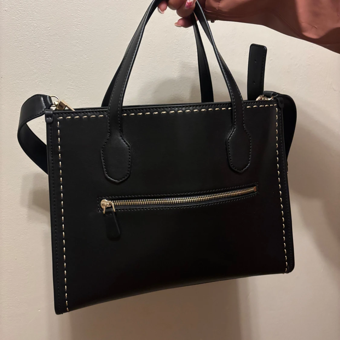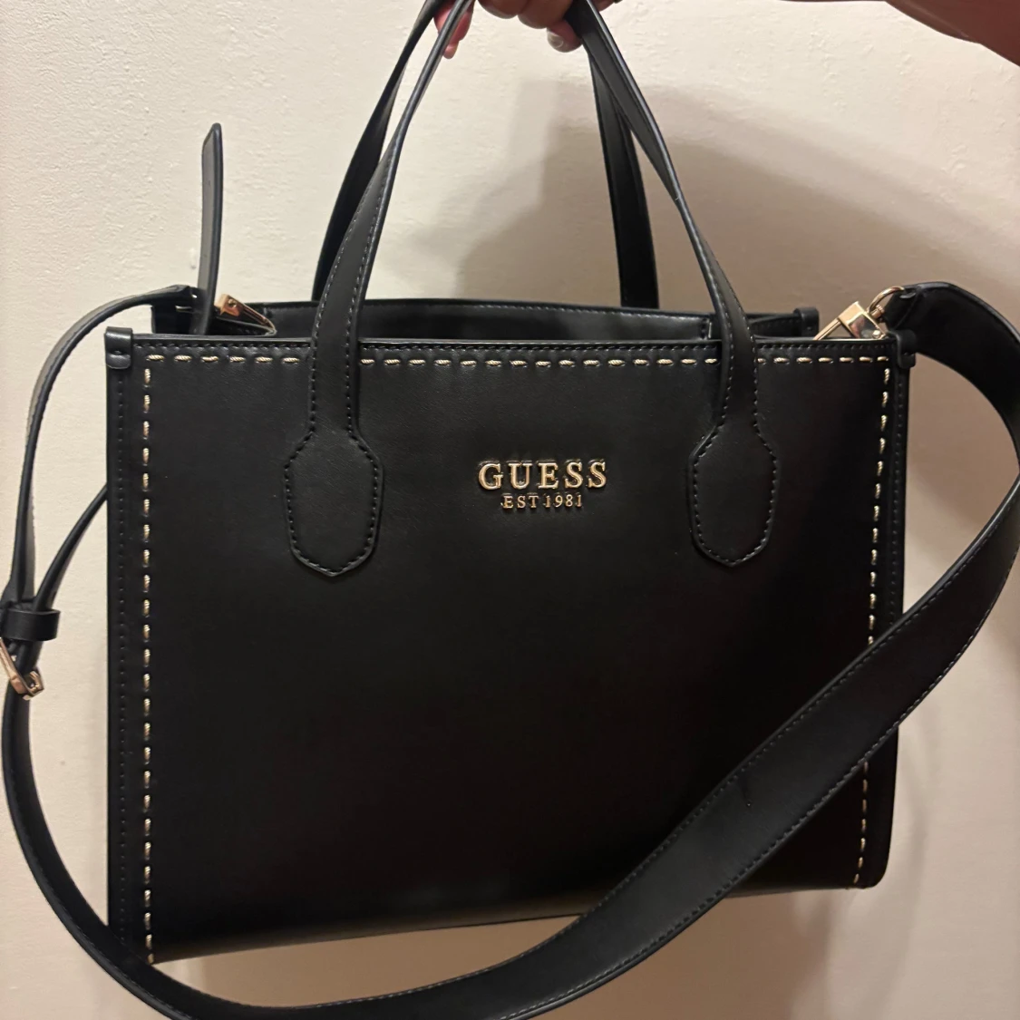 Snygg svart handväska från Guess med guldiga detaljer och logga framtill. Väskan har både handtag och justerbar axelrem, dekorativa kontrastsömmar och en praktisk dragkedjeficka på baksidan. Perfekt för att bära dina essentials med stil.