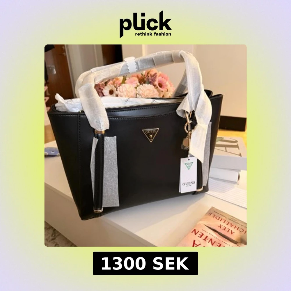 Stilren svart handväska från Guess med guldfärgad logga framtill och dragkedja upptill. Väskan har två rejäla handtag och kommer med original dustbag. Tillverkad i syntetmaterial med snygga metall-detaljer. Perfekt för dig som vill ha en klassisk och trendig accessoar.