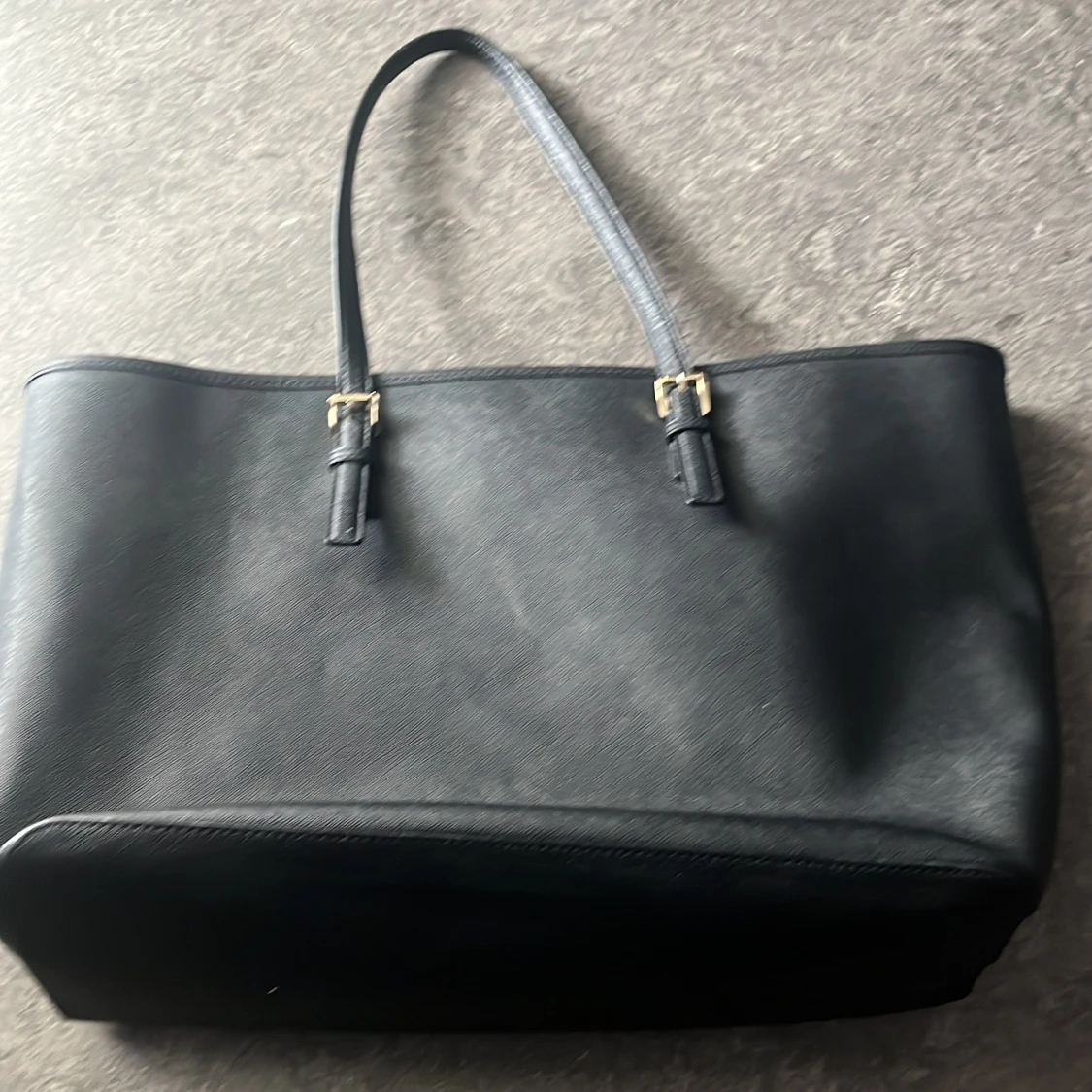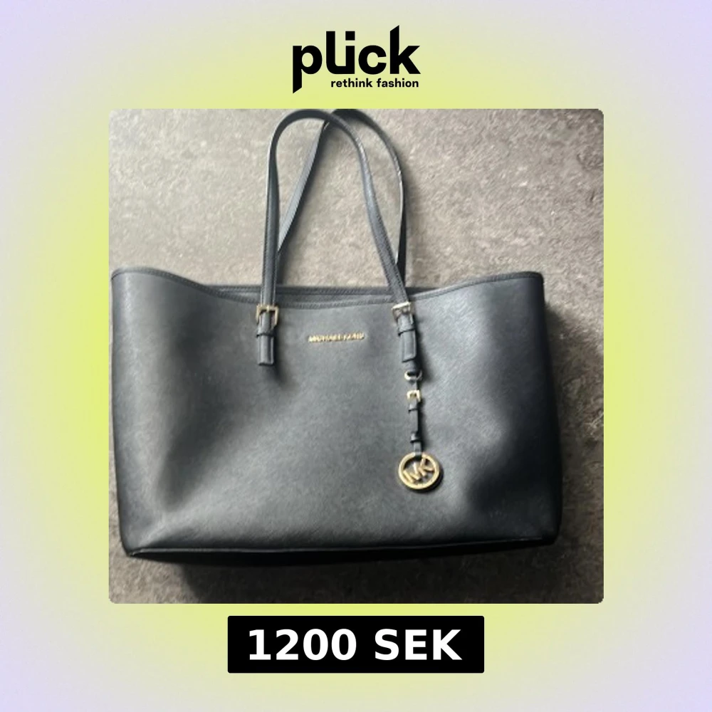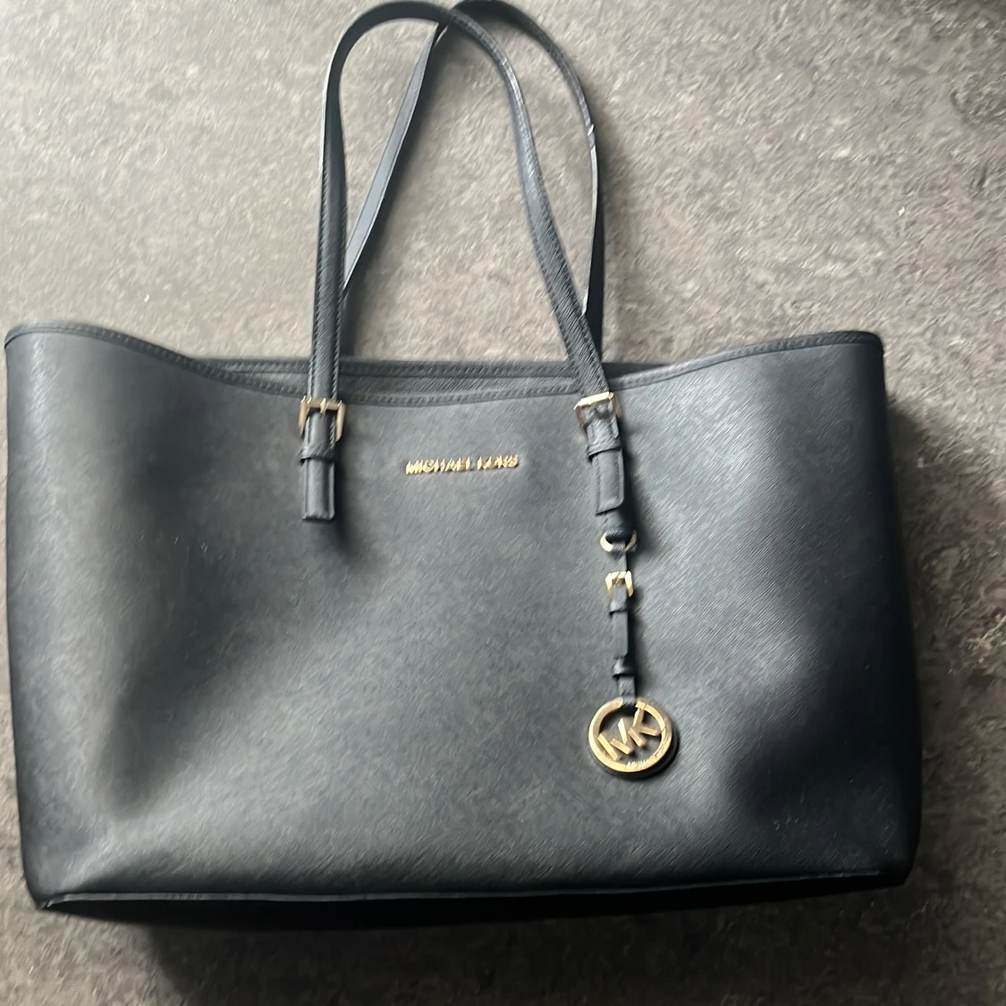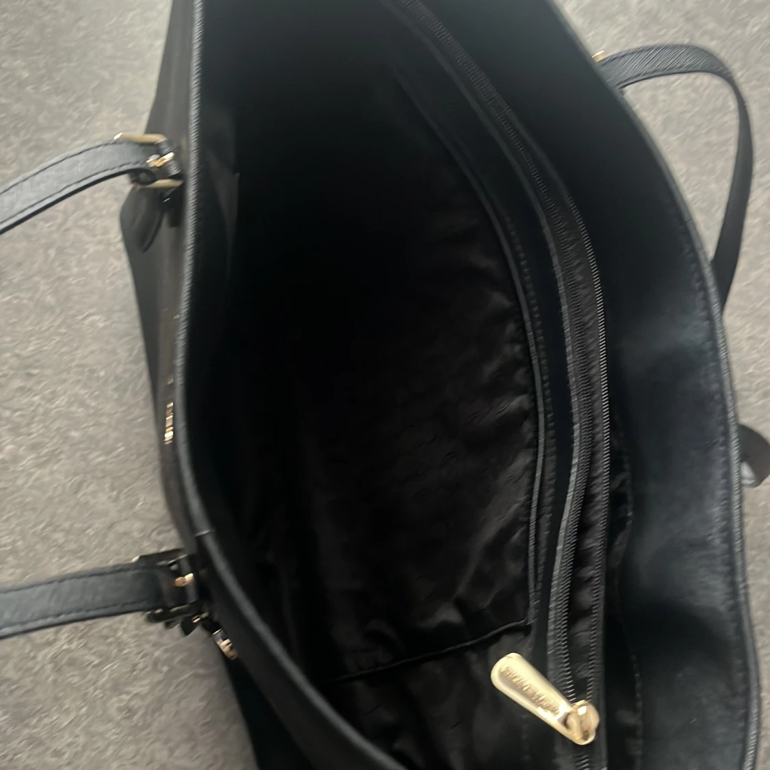 Stilren svart handväska från Michael Kors i skinn med guldiga detaljer och klassisk MK-logga. Väskan har långa axelband, dragkedja upptill och rymligt innerfack. Perfekt för dig som vill ha en snygg och praktisk väska med lyxig känsla. Med tre fack innut
