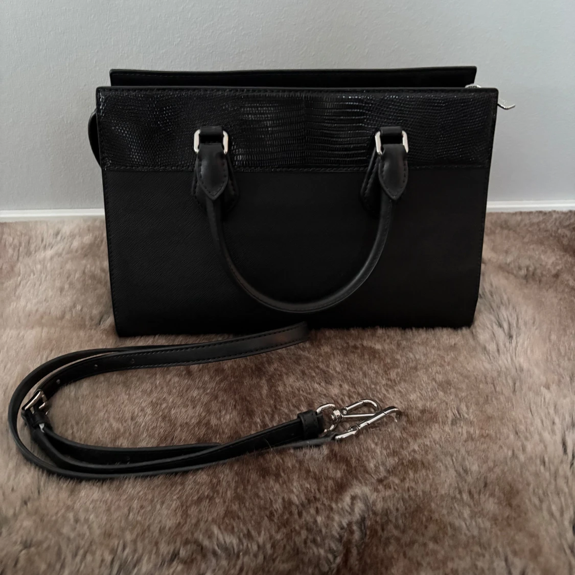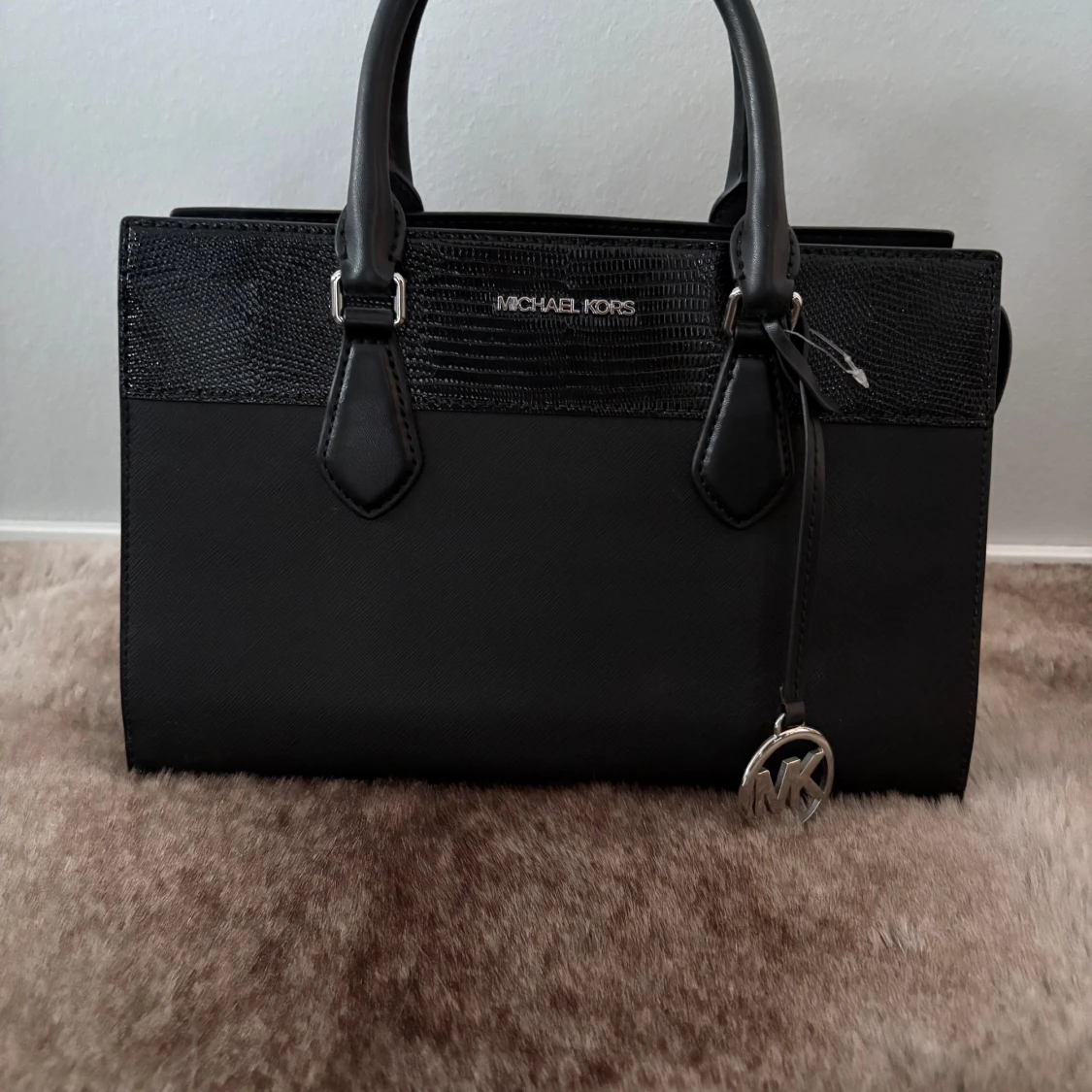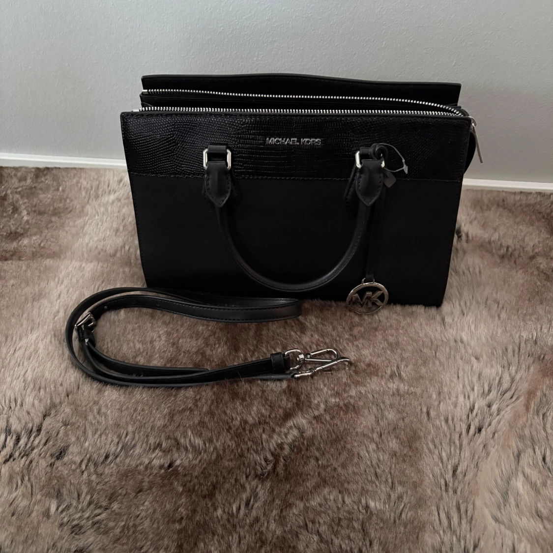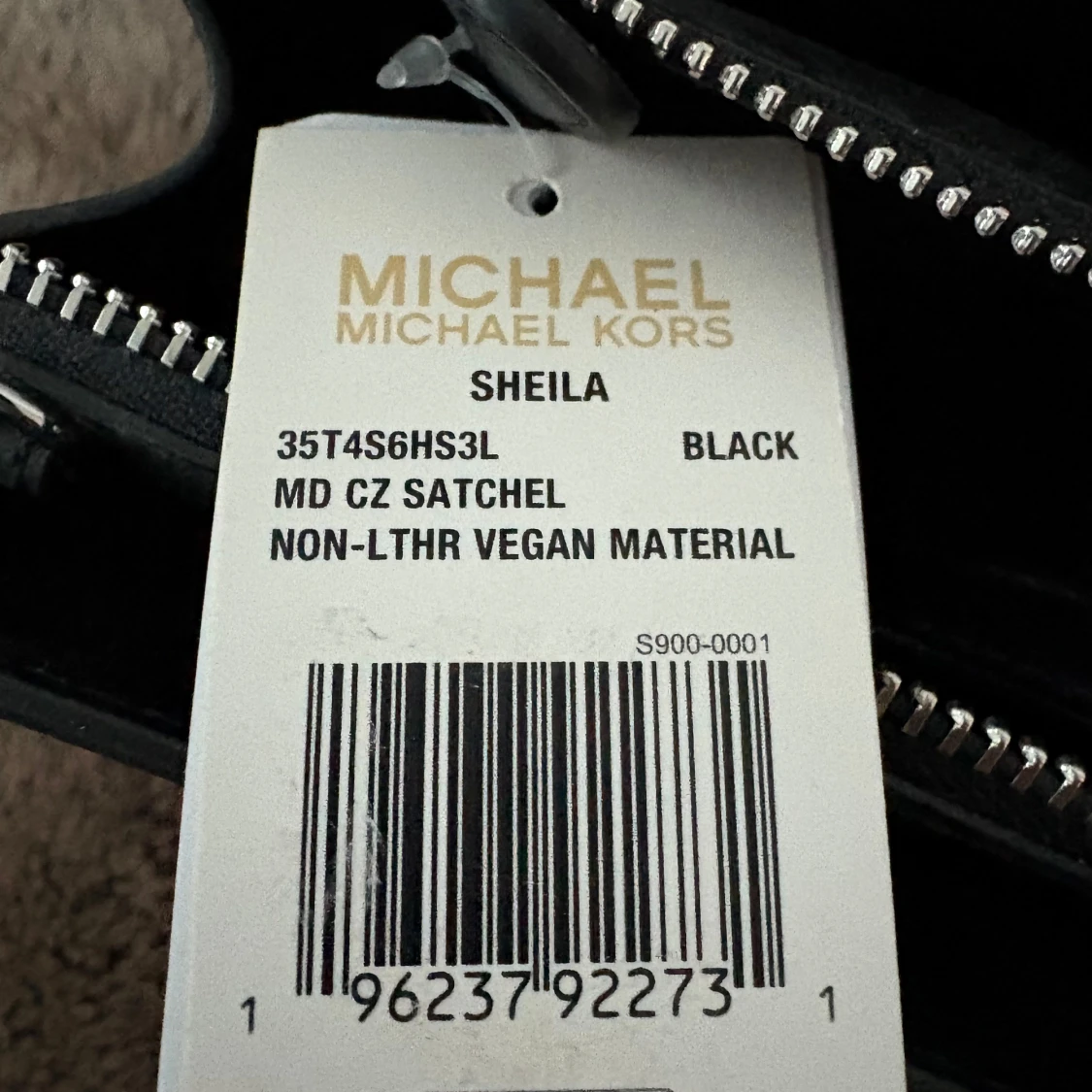 Snygg svart handväska från Michael Kors, modell Sheila. Väskan har både handtag och avtagbar axelrem, samt dekorativt MK-hänge. Tillverkad i veganskt material med strukturdetaljer upptill och dragkedja upptill. Inget kvitto men lappen sitter kvar. Oanvänd! nypris 4500kr!