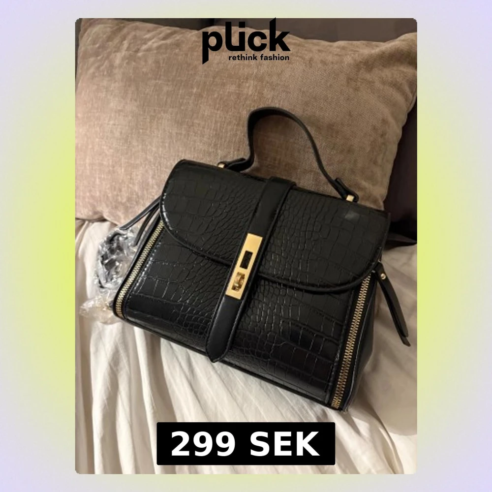 Stilren svart handväska i croco-mönstrat skinnimitation med guldfärgade detaljer och dragkedjor på sidorna. Väskan har ett topphandtag och medföljande axelrem. Perfekt för dig som vill ha en elegant och trendig accessoar. Köpte men har inte använt!!
