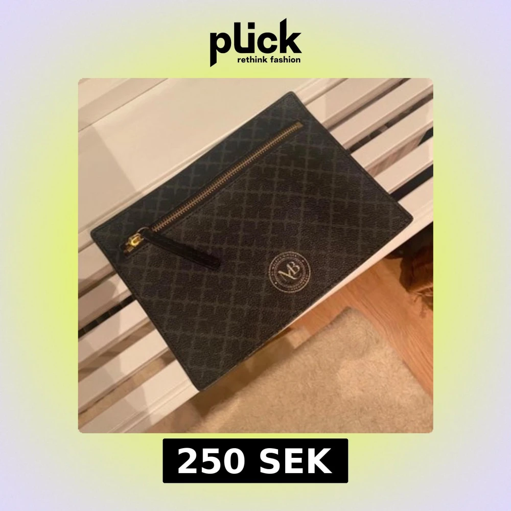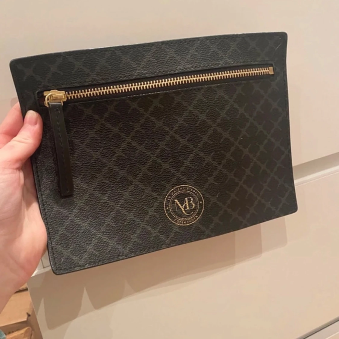 Kuvertväska By Malene Birger mönstrad - Snygg kuvertväska från By Malene Birger i svart och vinrött med ikoniskt grafiskt mönster och guldfärgad logga framtill. Väskan har dragkedja upptill och är tillverkad i tåligt syntetmaterial. Då den är skitig inuti så kan jag gå ner i pris!