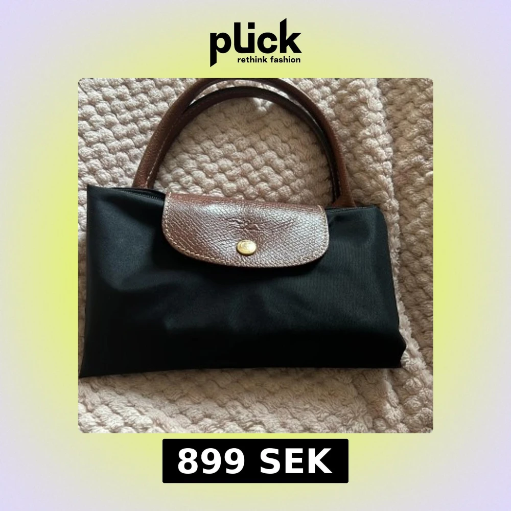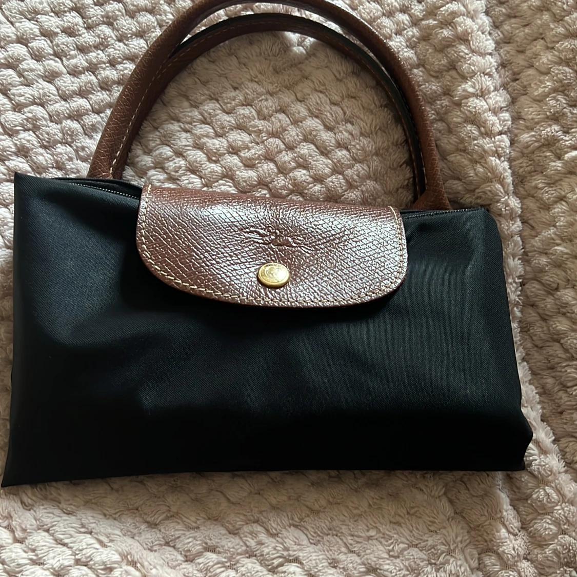 Klassisk svart handväska från Longchamp med bruna skinnhandtag och lock. Väskan har ett lock med guldfärgad knapp. Perfekt storlek för att bära med sig allt man behöver och enkel att vika ihop.