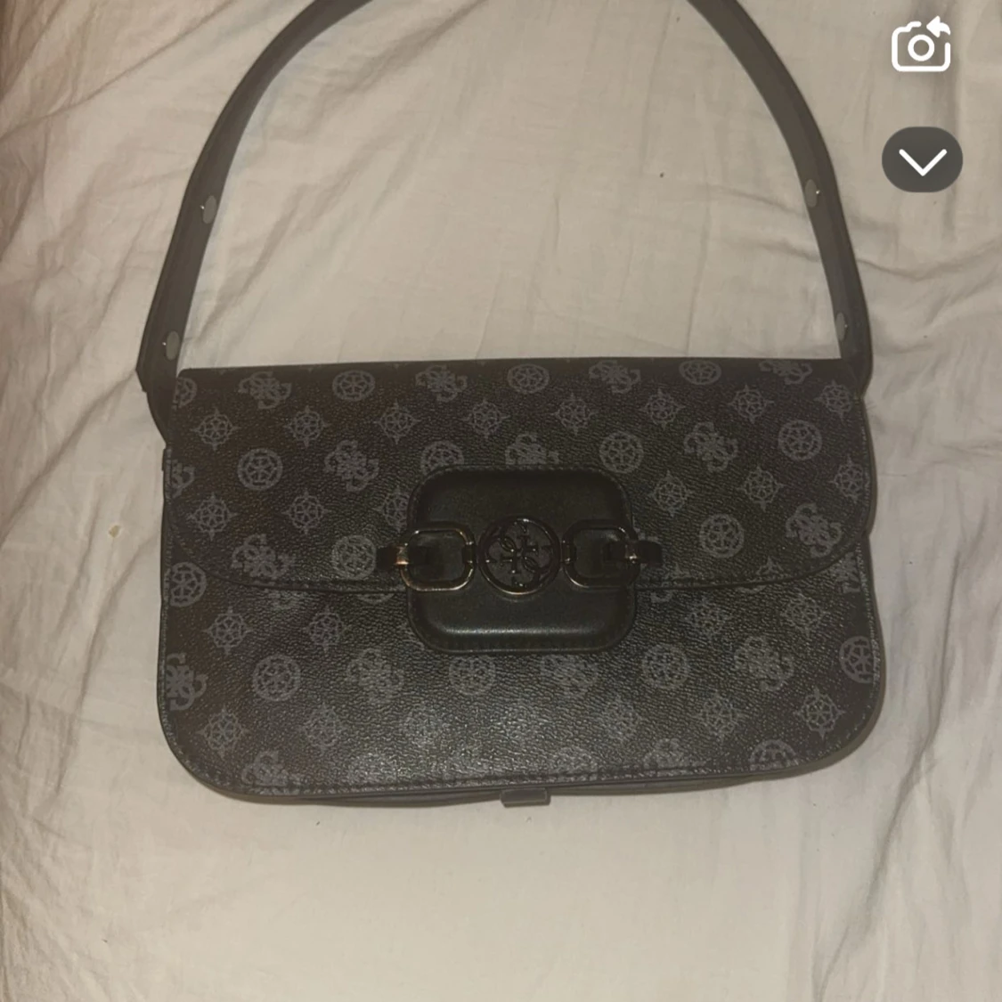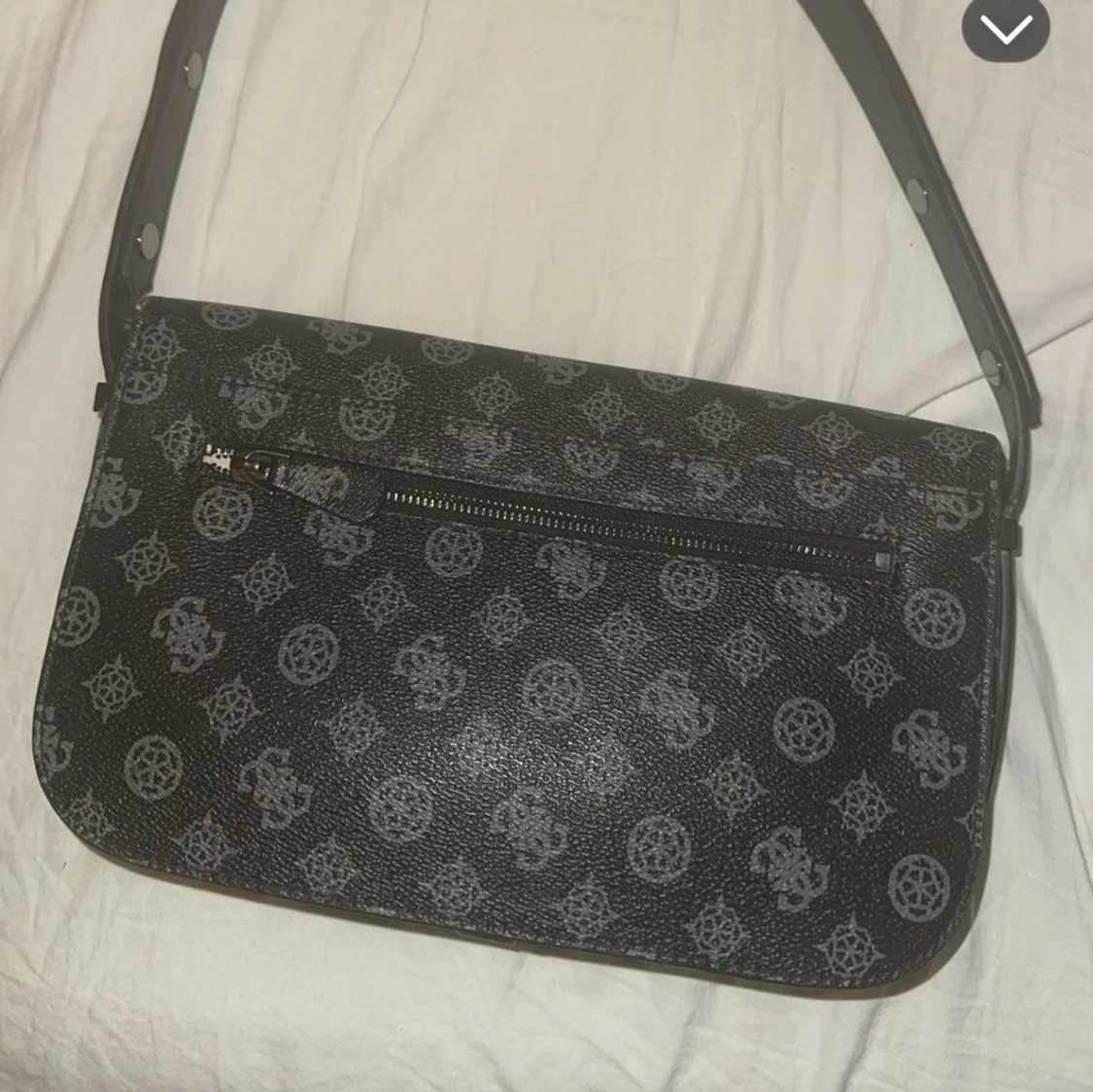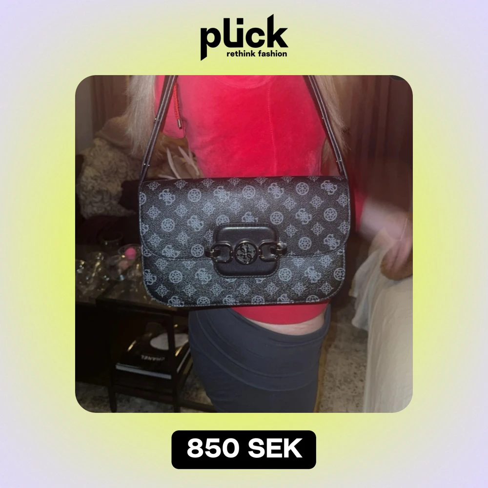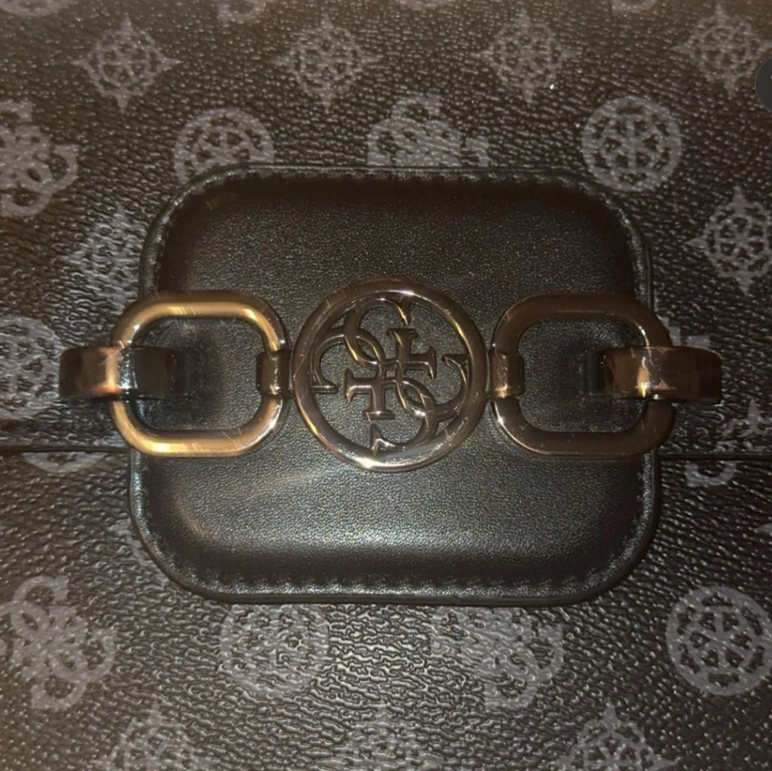 Snygg svart axelväska med grått mönster och en cool spänndetalj på framsidan. Väskan har en praktisk dragkedja på baksidan och justerbar axelrem. Perfekt för både vardag och fest! Från märket GUESS.
