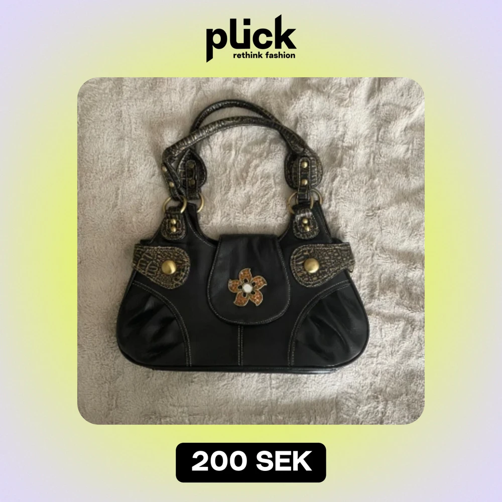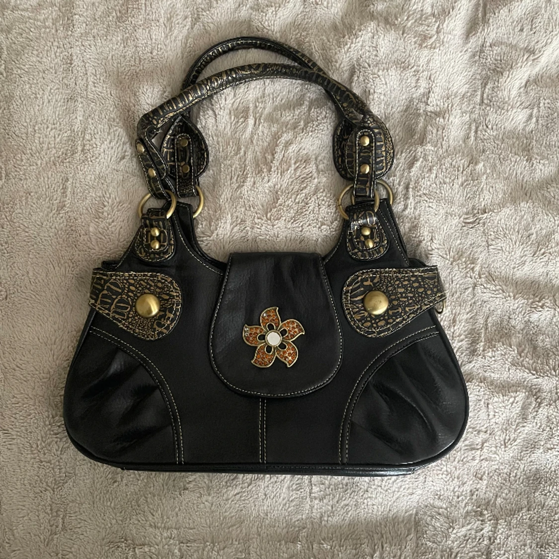Väska med mycket detaljer i konstläder.