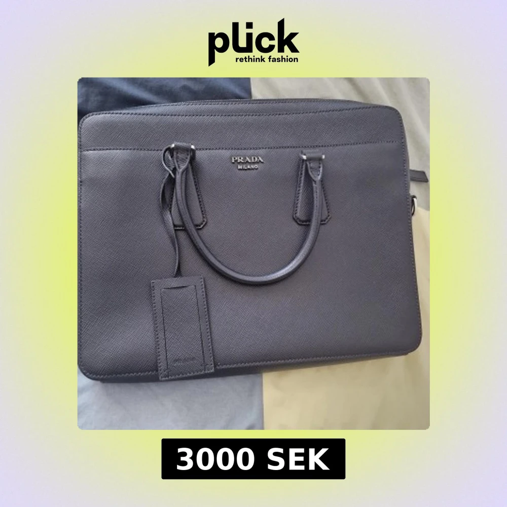 Säljer en stilren svart portfölj från Prada Milano. Väskan är tillverkad i exklusivt skinn med två handtag och en elegant, strukturerad yta. Perfekt för att bära laptop eller dokument. Klassisk design med diskret logga framtill.