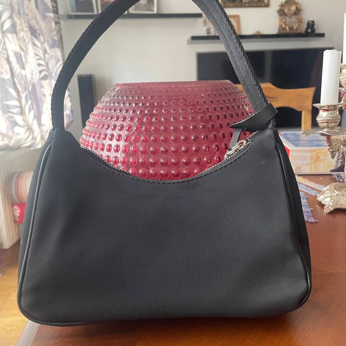 Snygg svart Prada Re-Edition 2005 axelväska i klassisk modell med silverfärgade metalldetaljer och dragkedja. Väskan är gjord i slitstark nylon med ikonisk trekantig logga framtill och matchande tag. Perfekt storlek för det viktigaste.