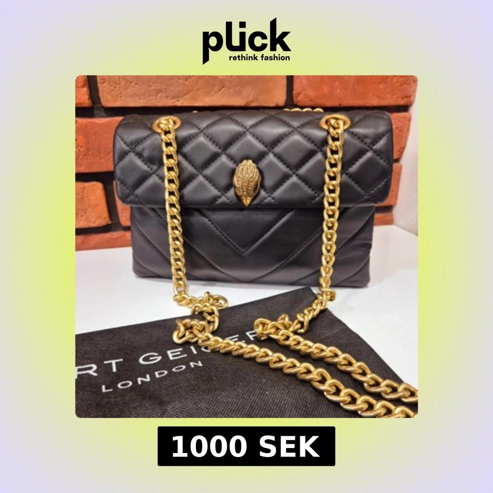 Snygg svart axelväska från Kurt Geiger med quiltad design och guldfärgad kedja. Väskan har en unik detalj på framsidan och är perfekt för att ge din outfit en lyxig touch. Den är tillverkad i skinn och har en elegant och tidlös stil.