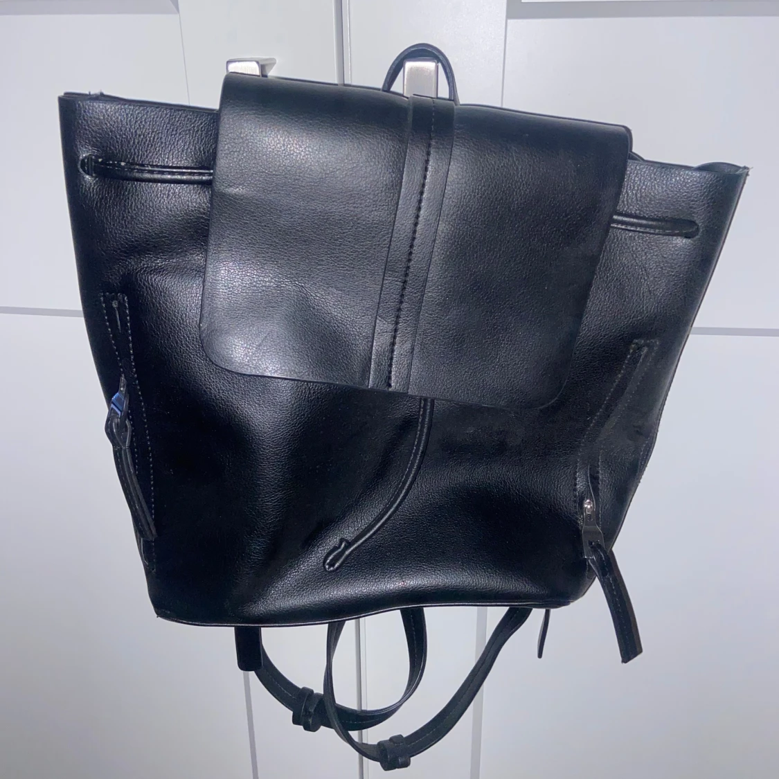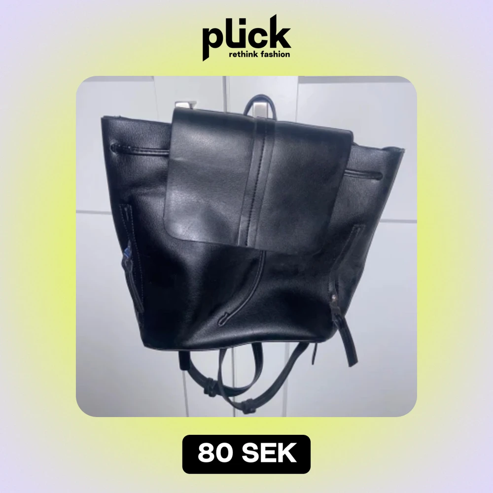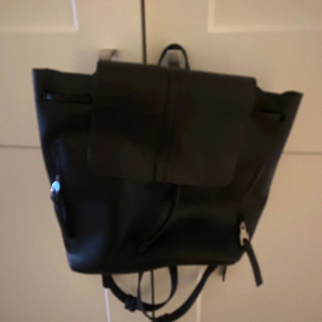 svart ryggsäck med en minimalistisk design. Väskan har en klaff med dragsko och justerbara axelremmar. aldrig använd.