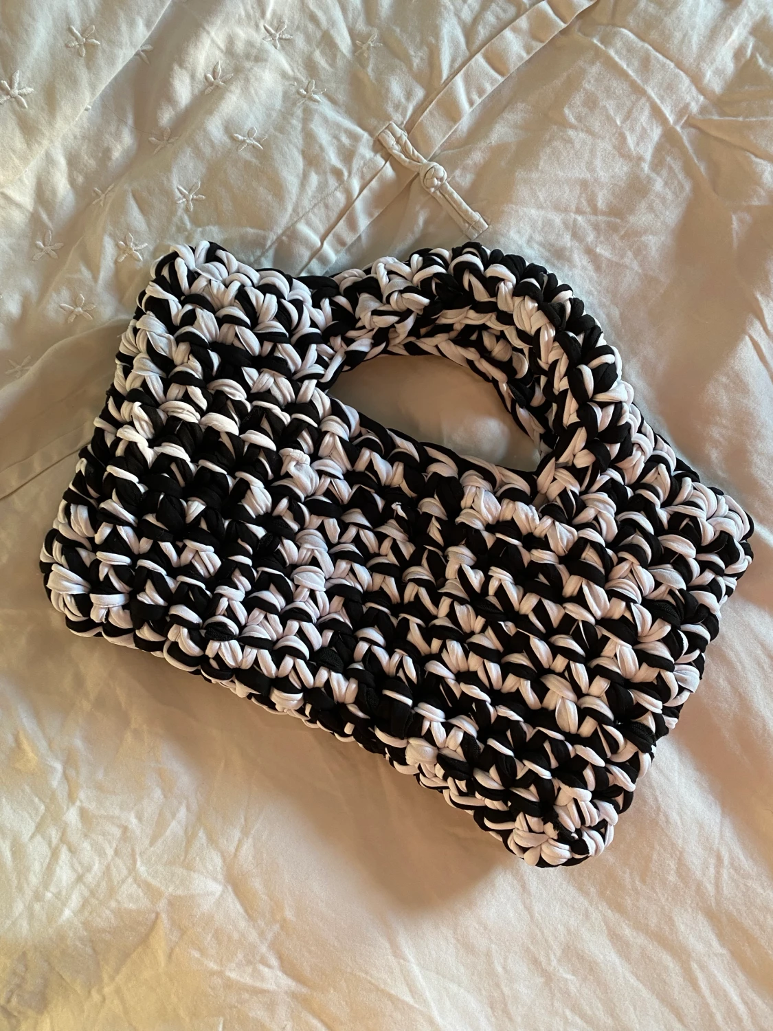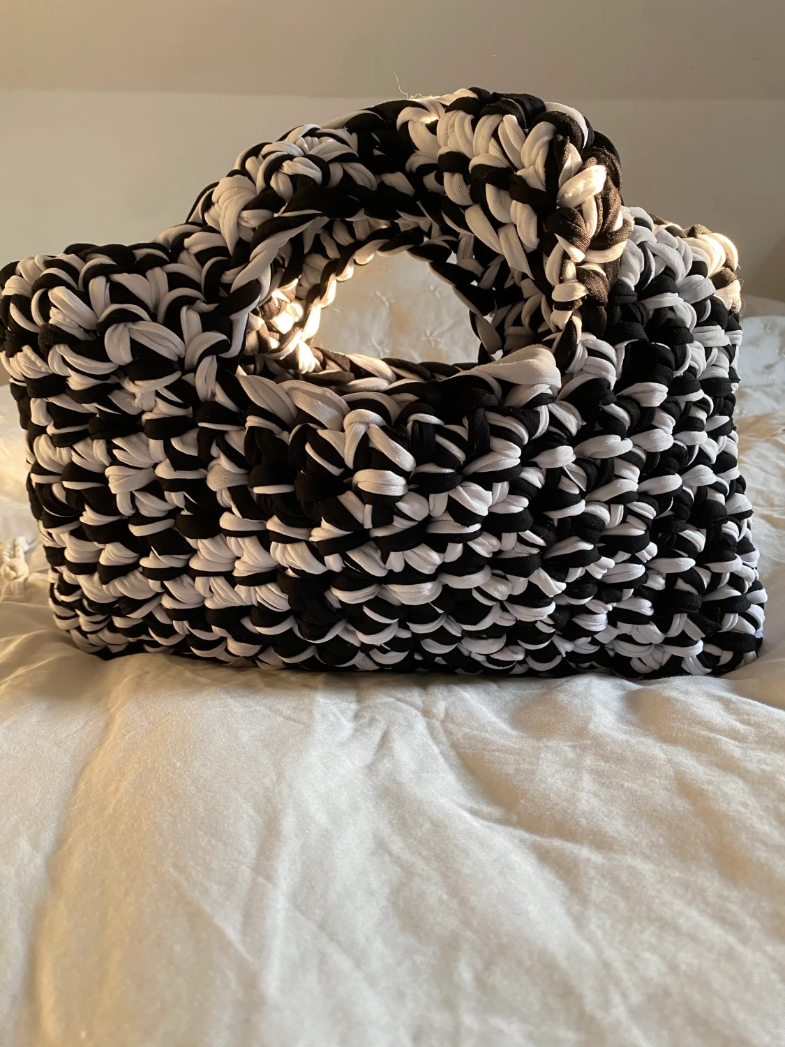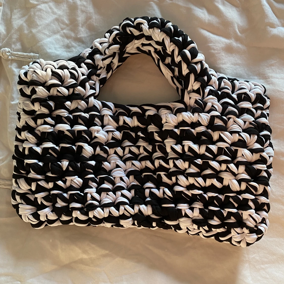 Svart och vit virkad väska med korta handtag. Handgjord.🥰
