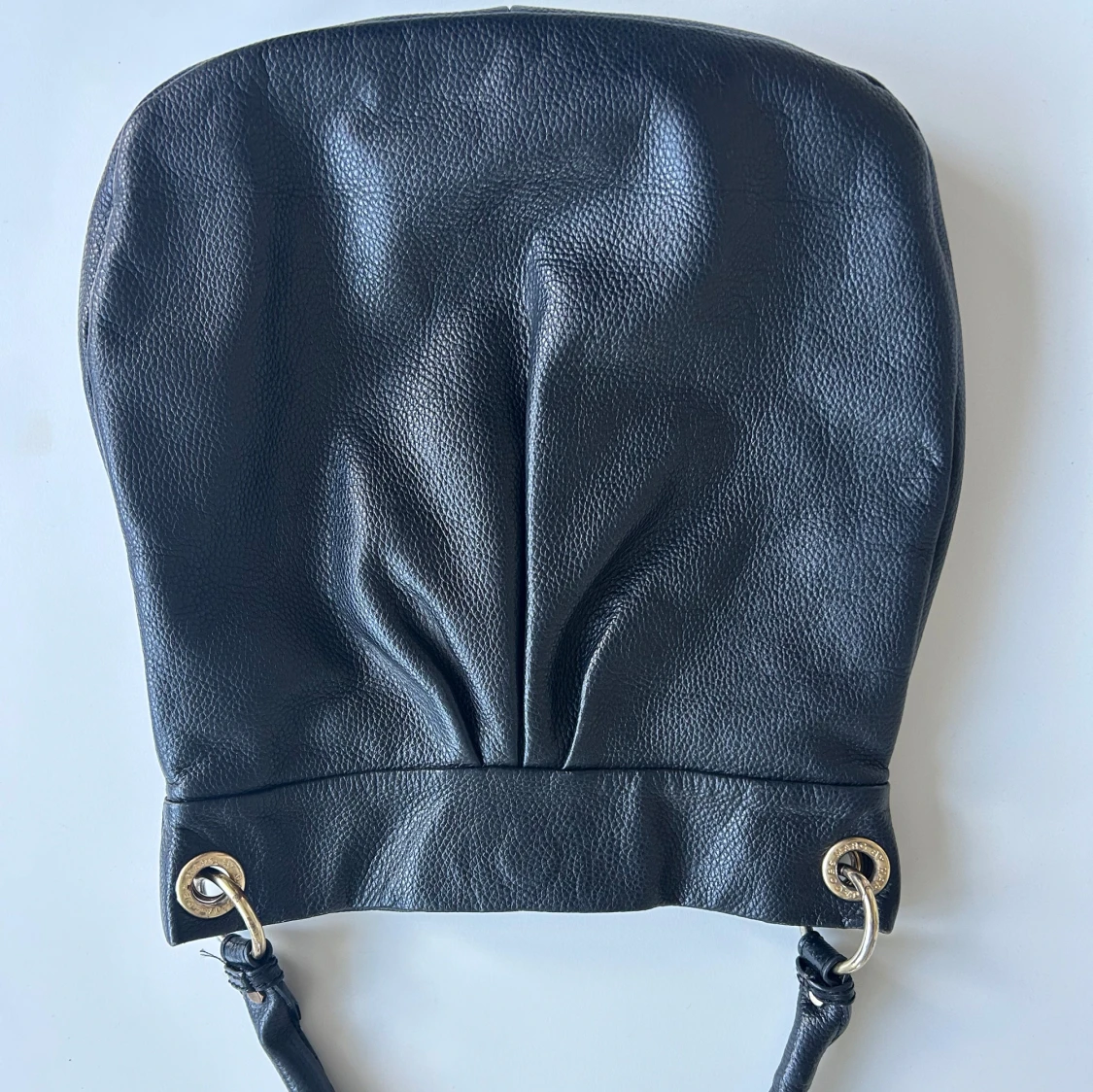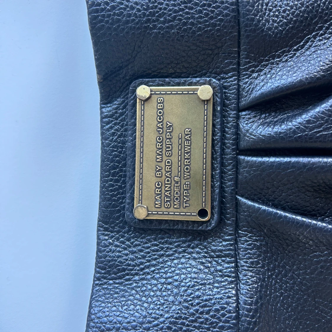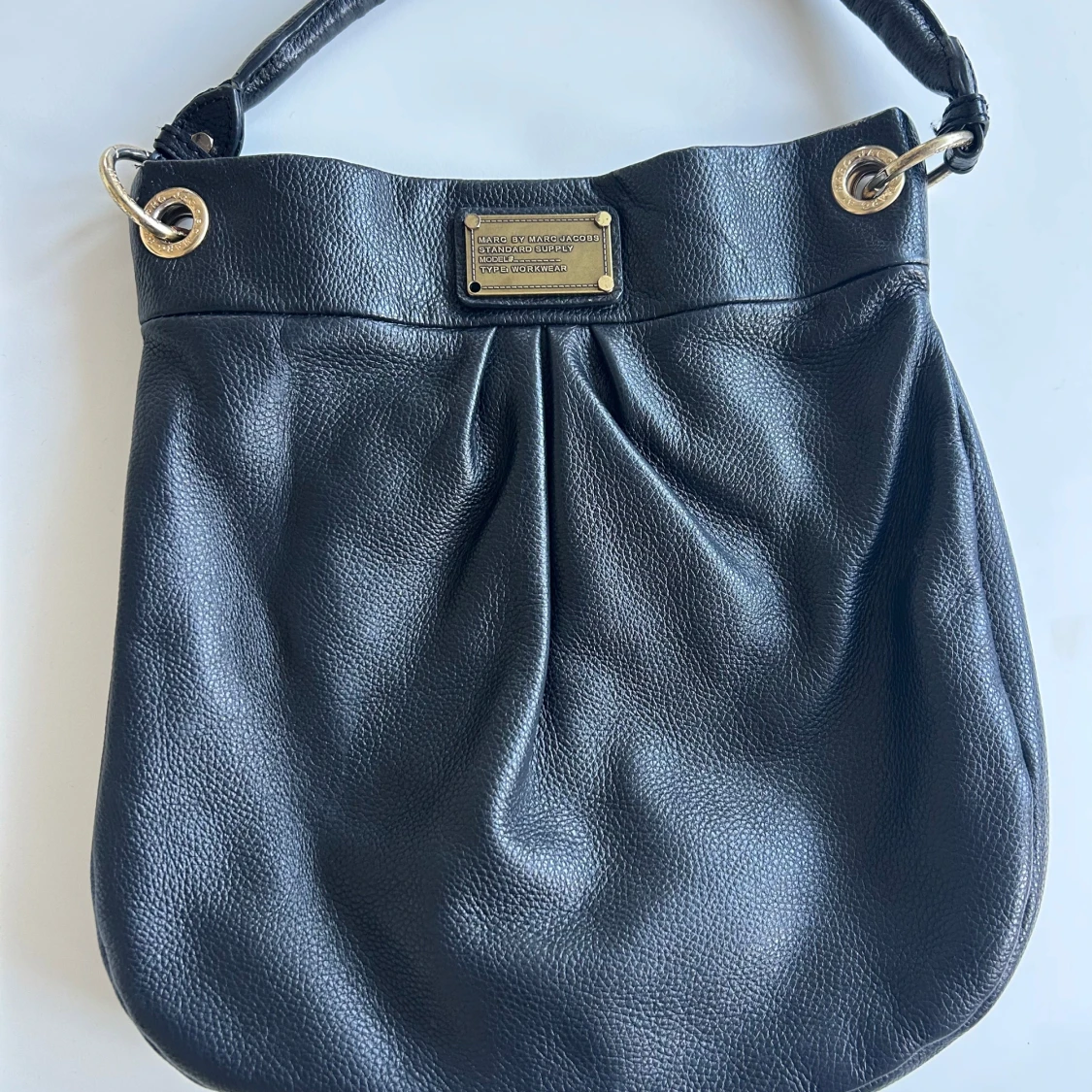 Snygg svart väska från Marc by Marc Jacobs i skinn med guldfärgade metalldetaljer. Perfekt väska för både skola och jobb, ett långt band ingår! Väskan är i bra skick, bara en guldig metall sak som fattas från brickan och lite sprucket i skinnet i handtaget, se bild 2 och 3. Pris kan diskuteras i snabb affär😊