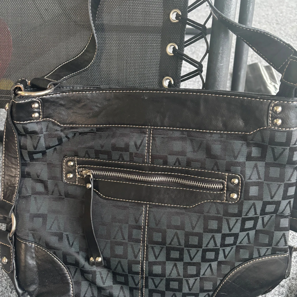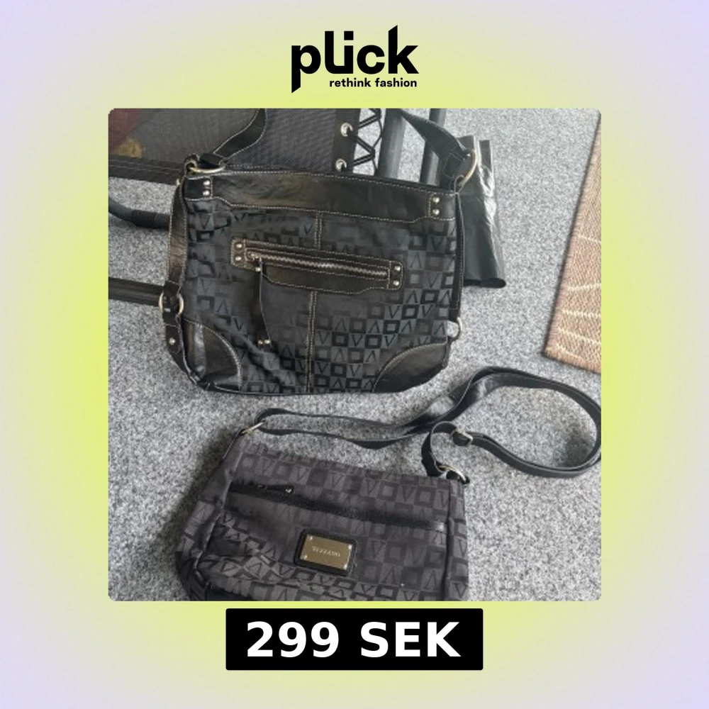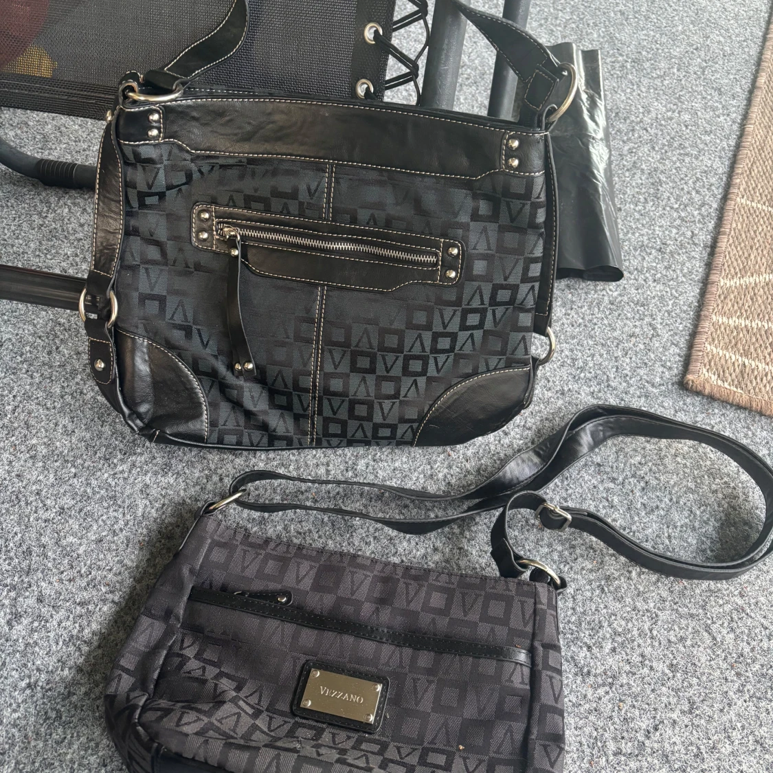 Två svarta axelväskor från Vizzano med geometriskt mönster och detaljer i skinnimitation. Båda har justerbara axelremmar, dragkedja framtill och metallplatta med logga. Perfekta för dig som vill ha en stilren och praktisk väska med snygga detaljer.