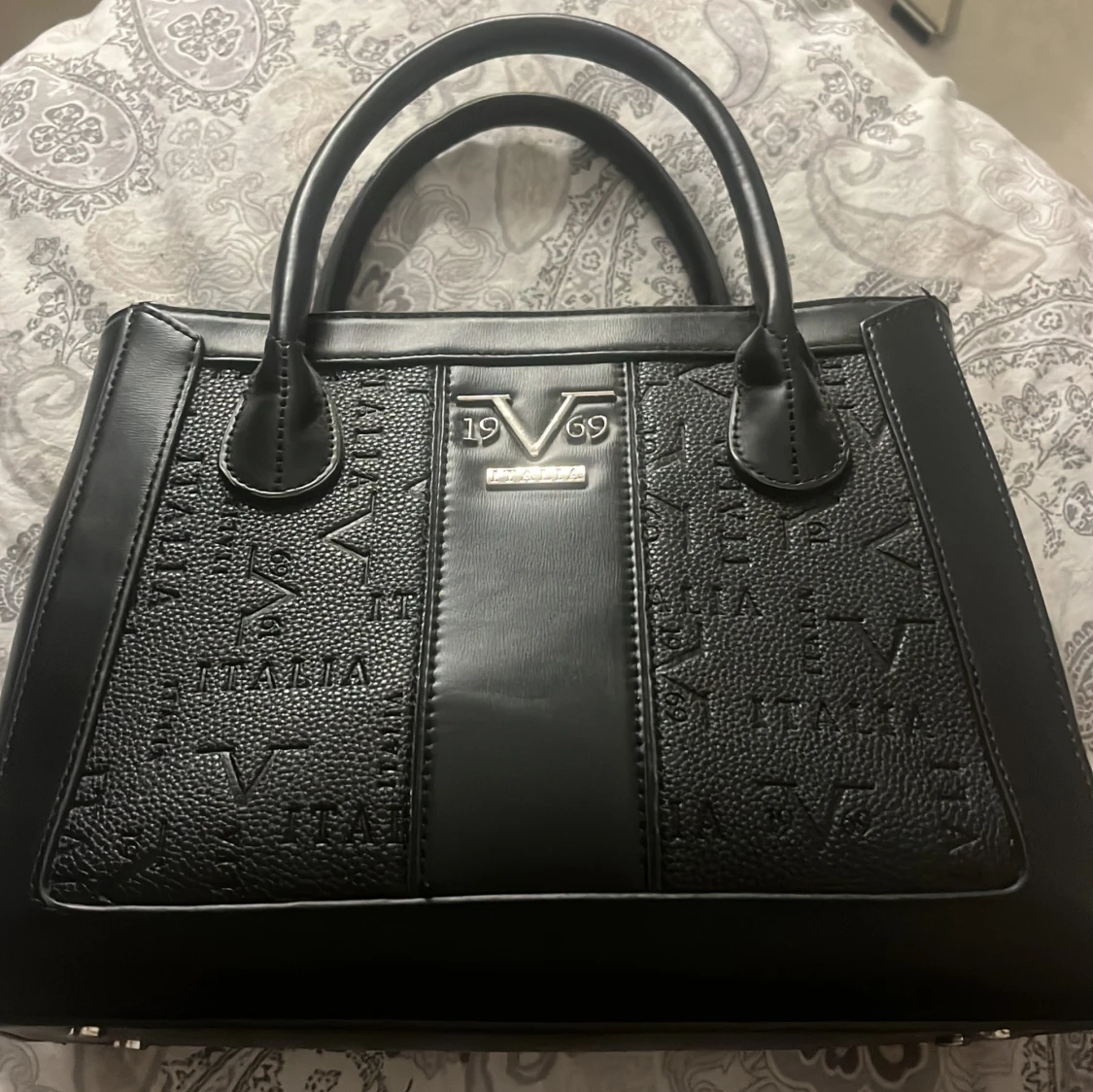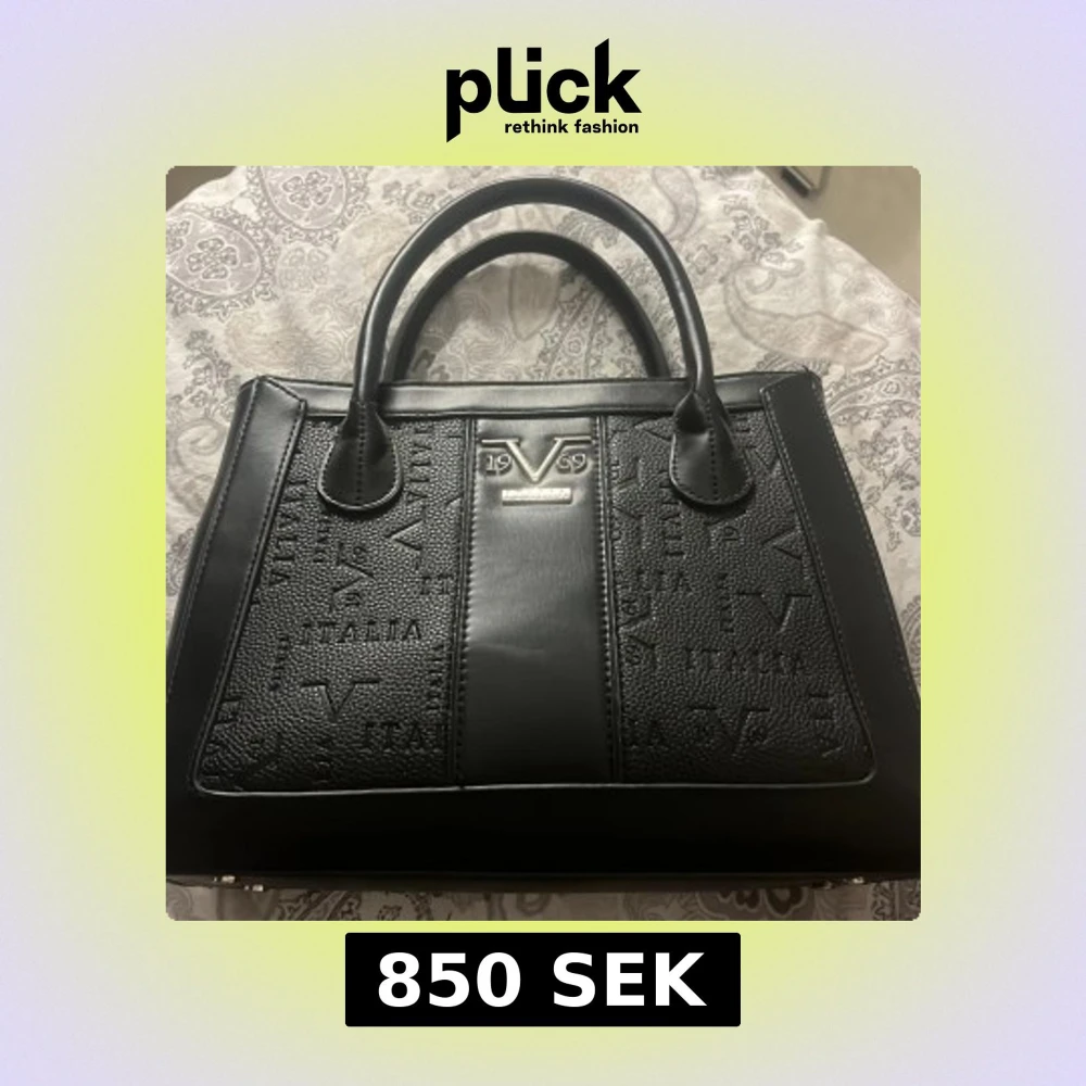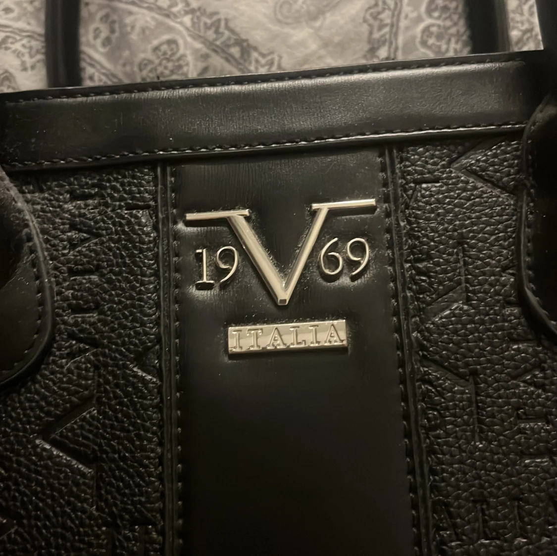 Snygg svart handväska från V1969 Italia med präglad logga och text på sidorna. Väskan har två rejäla handtag, 5 fack med dragkedja och detaljer i silver. Tillverkad i skinnimitation med stilren, boxig form och struktur på ytan. Fint skick☺️Köpt för 1700kr😊