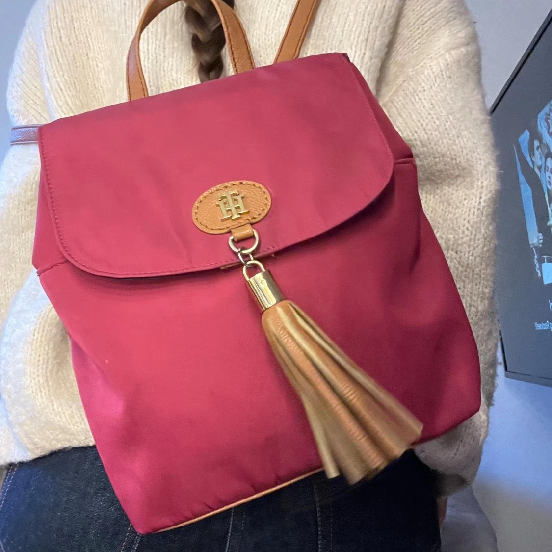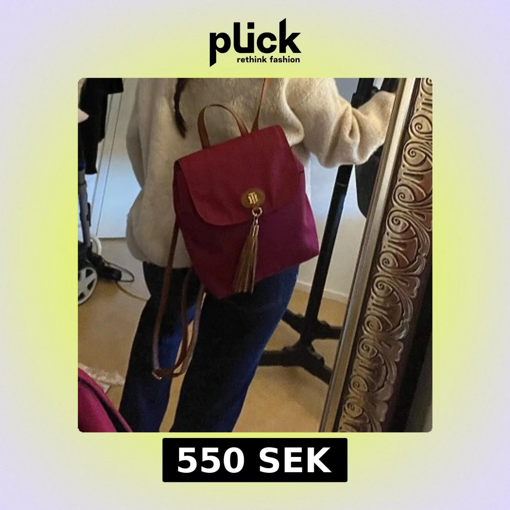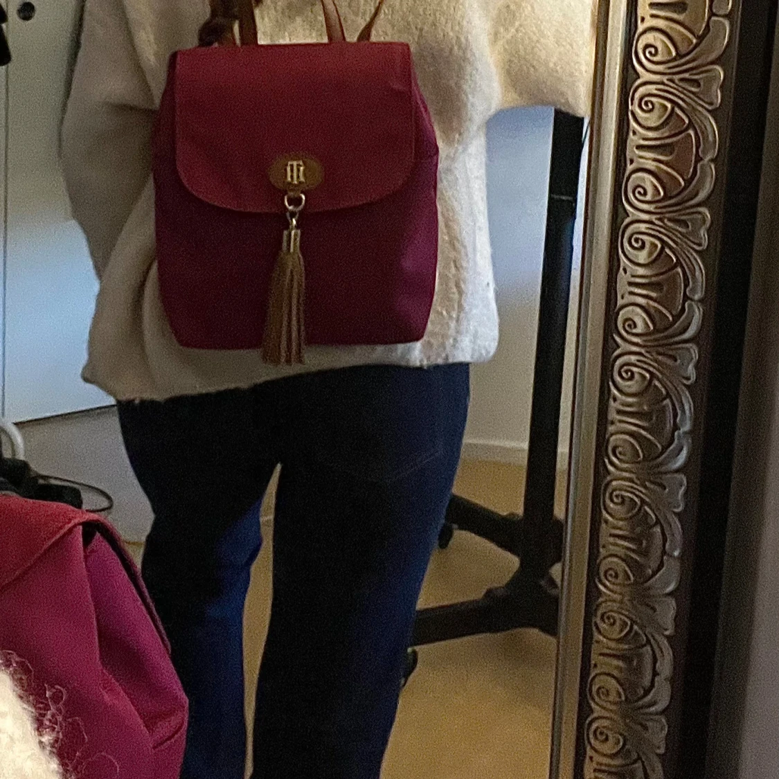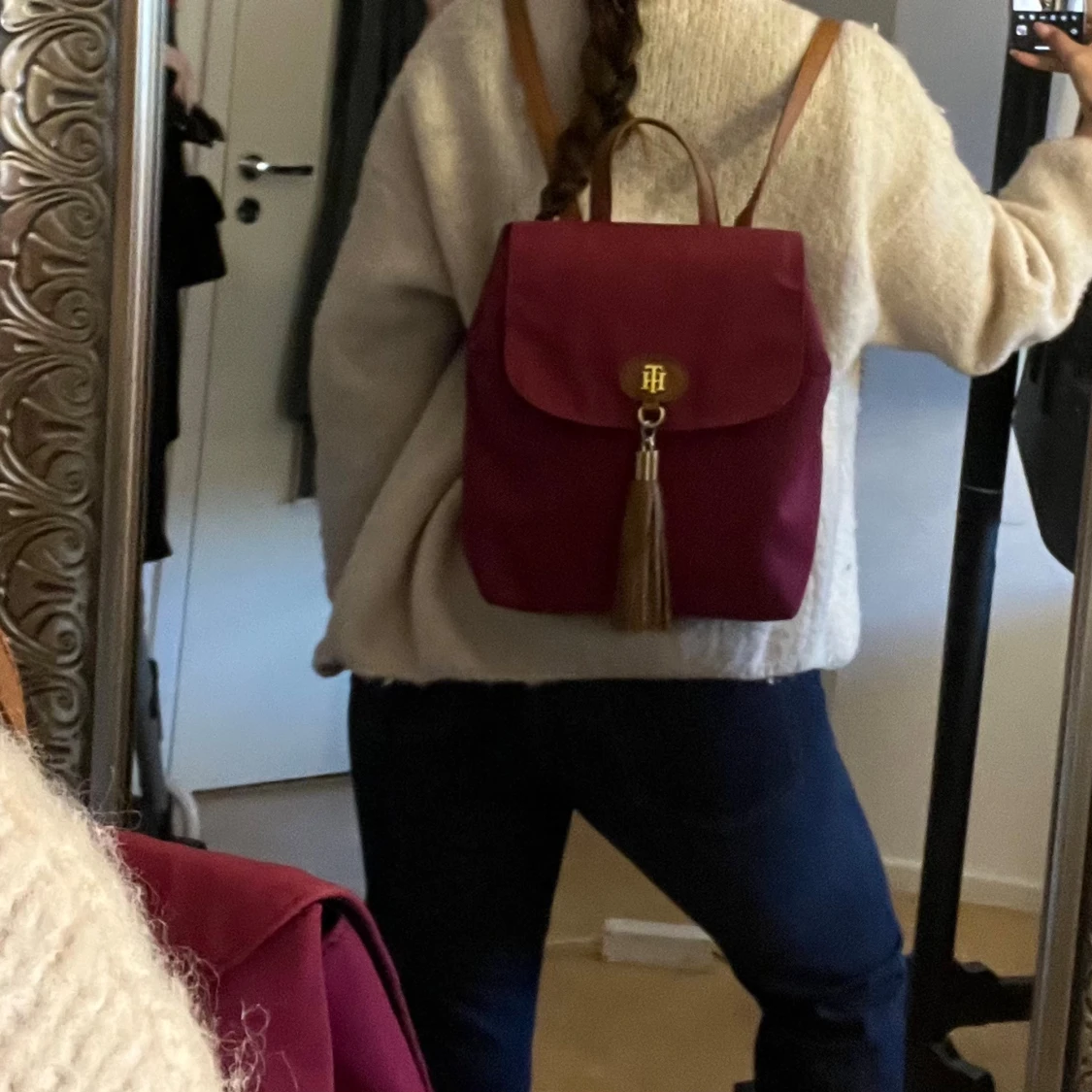 Maroon/burgundy färgad Thommy Hilfiger ryggsäck. Perfekt för bland annat back to school! Super sött alternativ om man inte vill ha en ”sportig” ryggsäck. Köpt för flera år sedan men väldigt sparsamt använd! Skriv ett meddelande för fler interna bilder i väskan, mått eller vilka fack som finns.