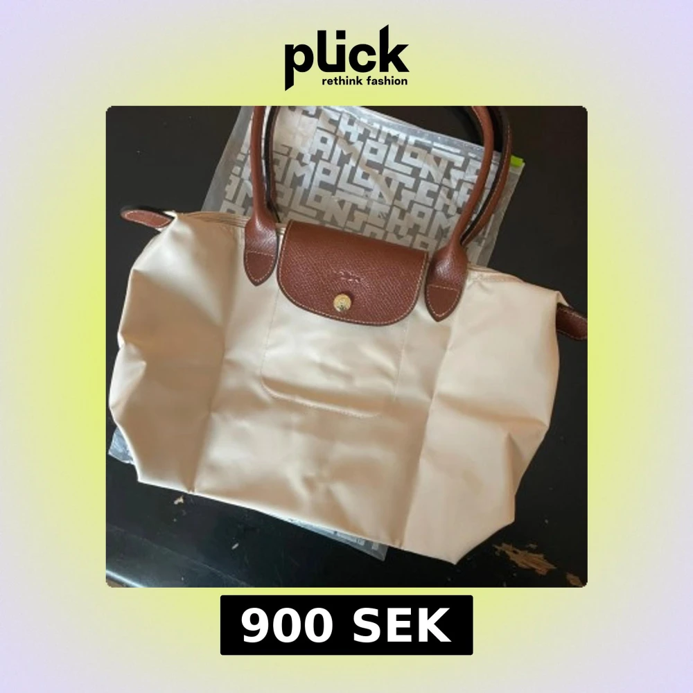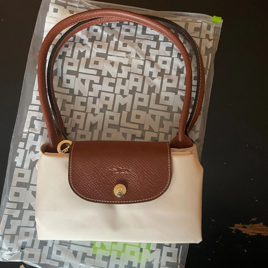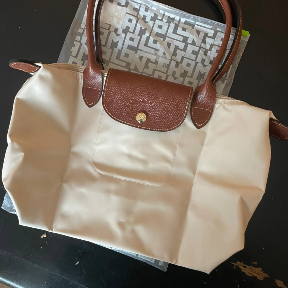 Snygg beige handväska från Longchamp med bruna skinnhandtag och lock. Väskan har guldfärgad knapp och dragkedja upptill. Perfekt storlek för det viktigaste och klassisk design som funkar till många stilar.
