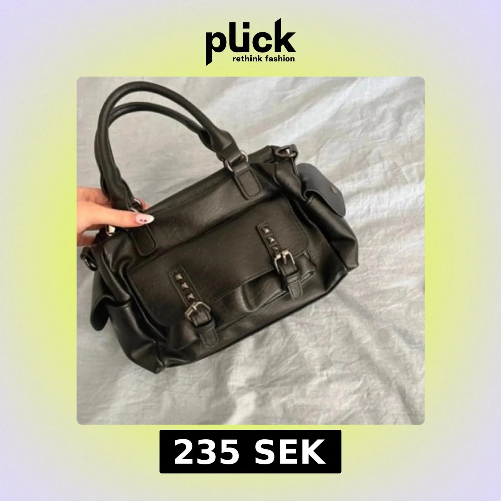 Snygg Sthlm stil svart handväska i skinn med coola nitar och spännen på framsidan. Väskan har både handtag och en justerbar axelrem för olika bärstilar. Perfekt för att ge din outfit en edgy touch. Fickor på bägge sidorna!❤️